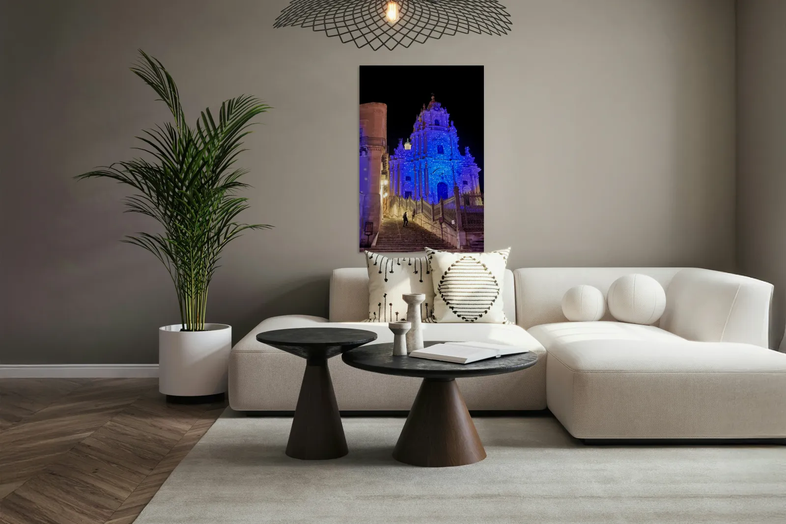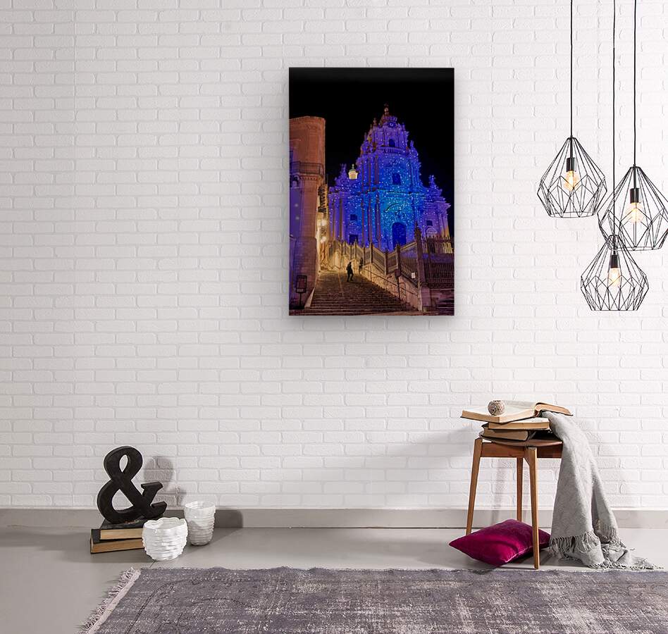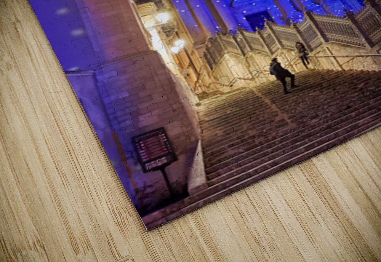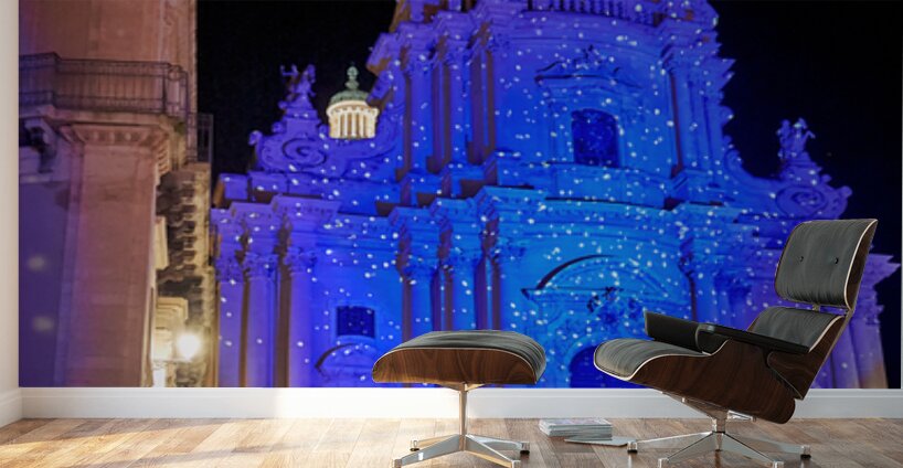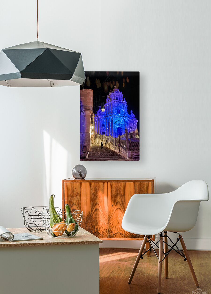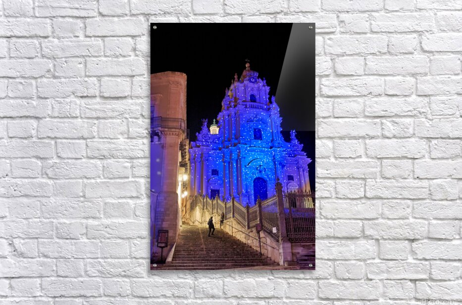People walk up the stairs toward the Duomo of San Giorgio brightly lit at night in Modica. The cathedral shines with blue lights.