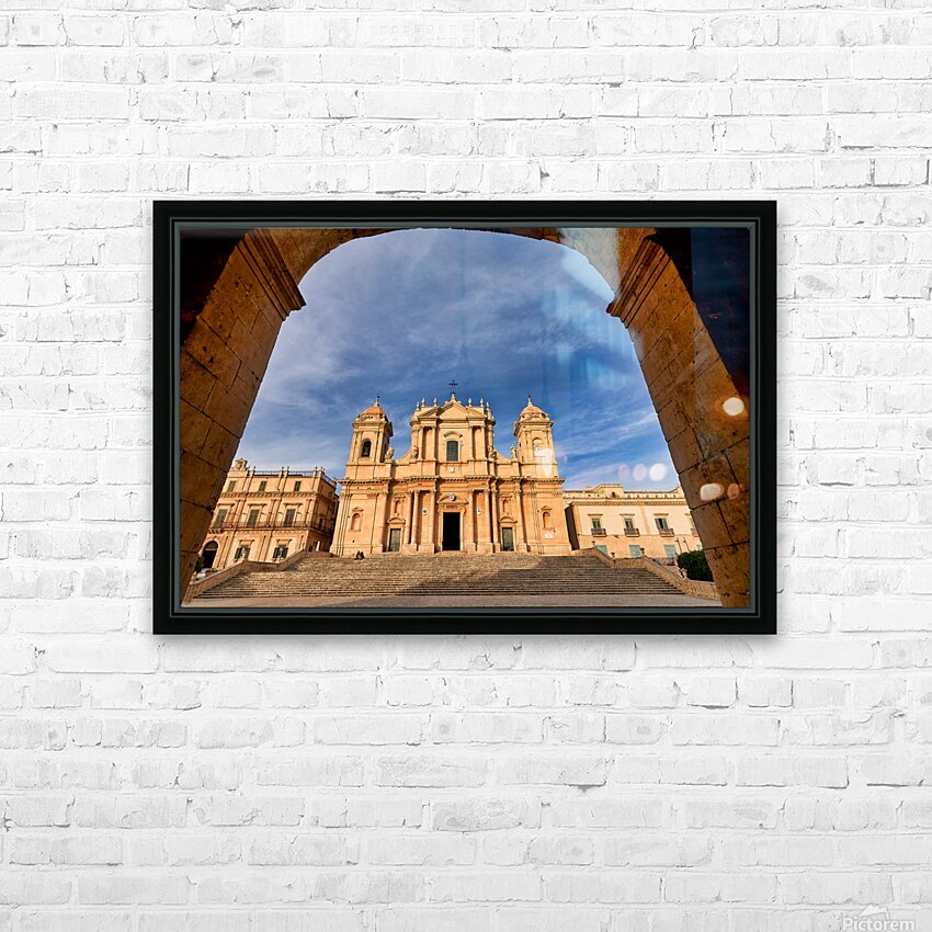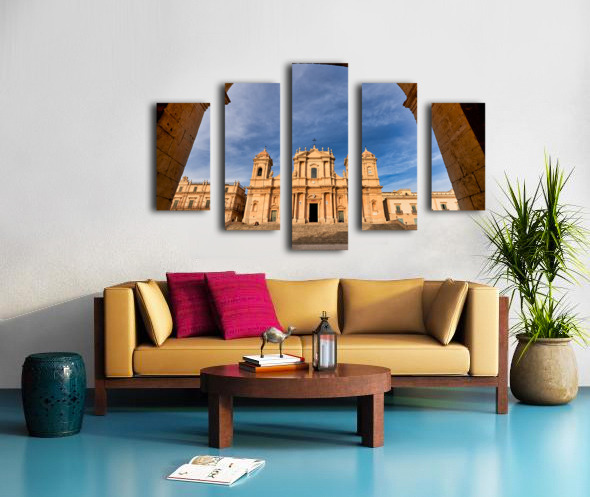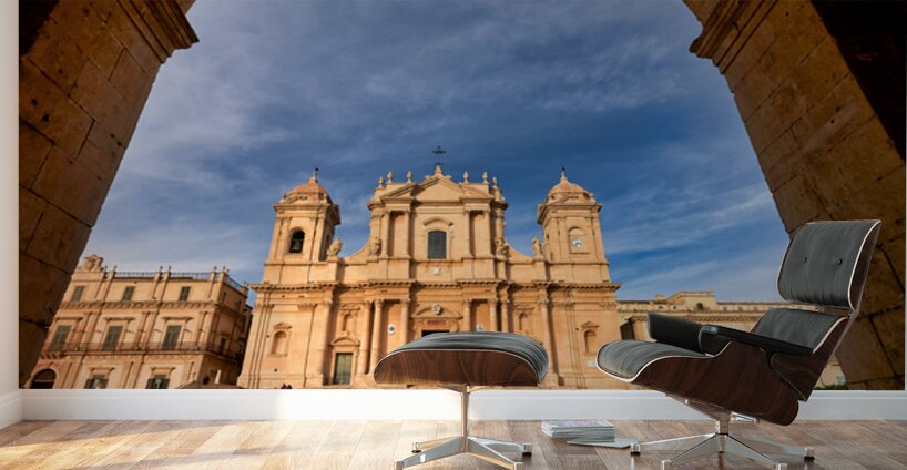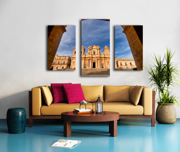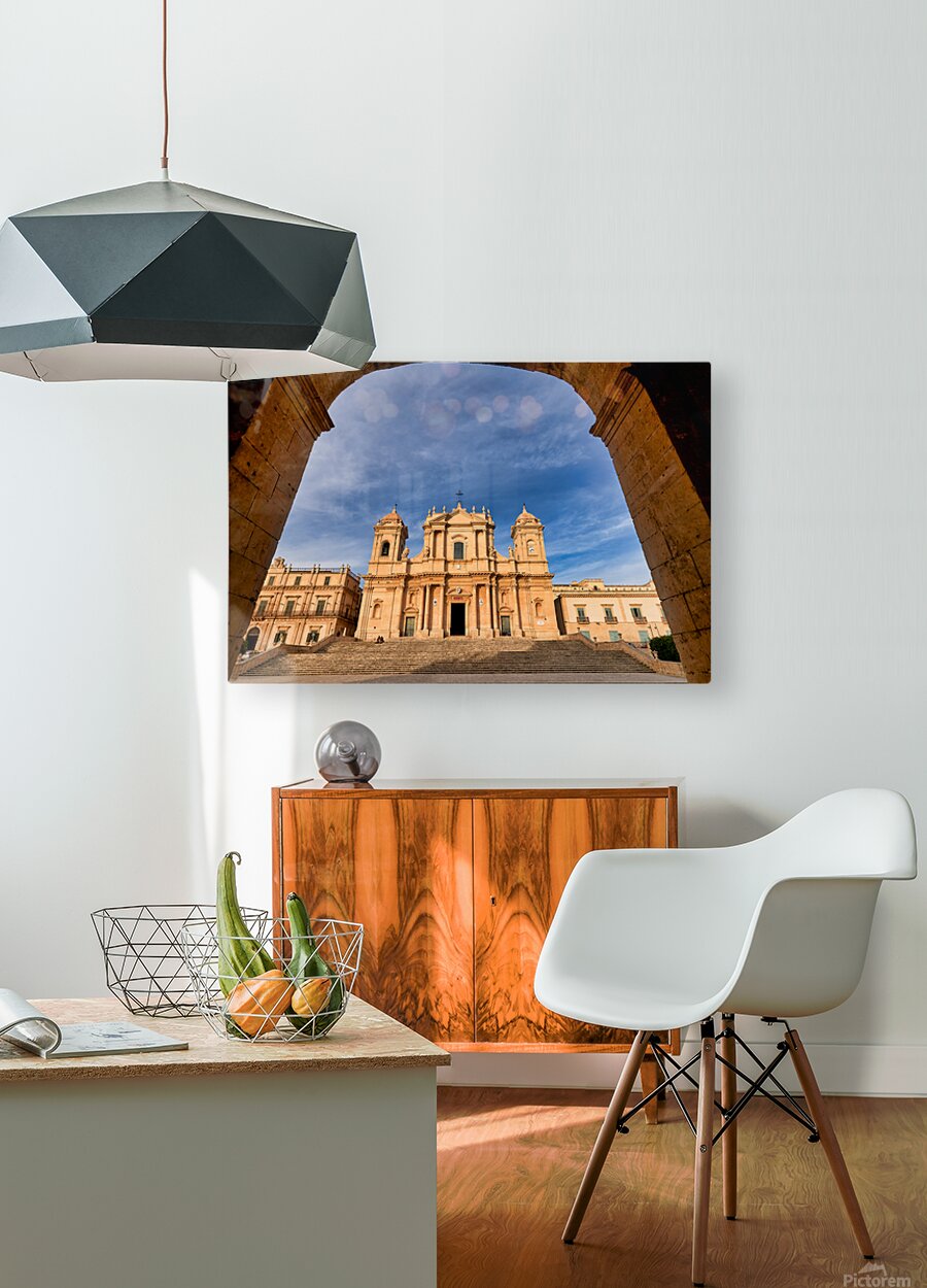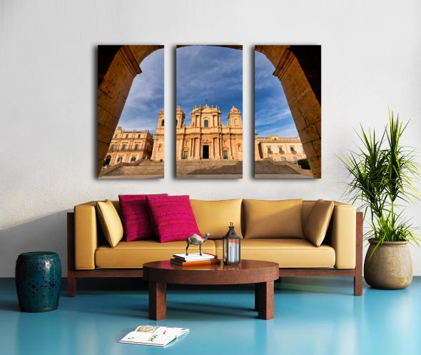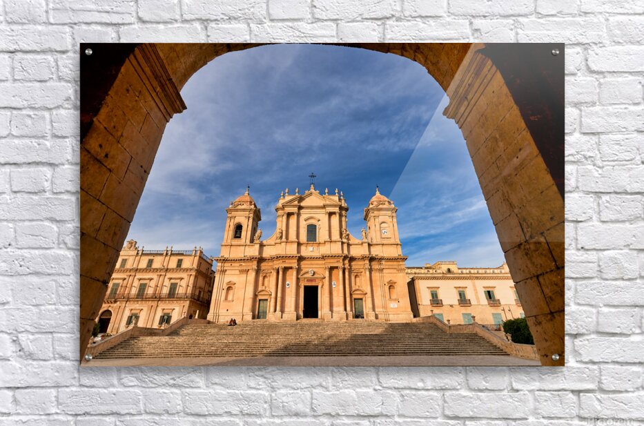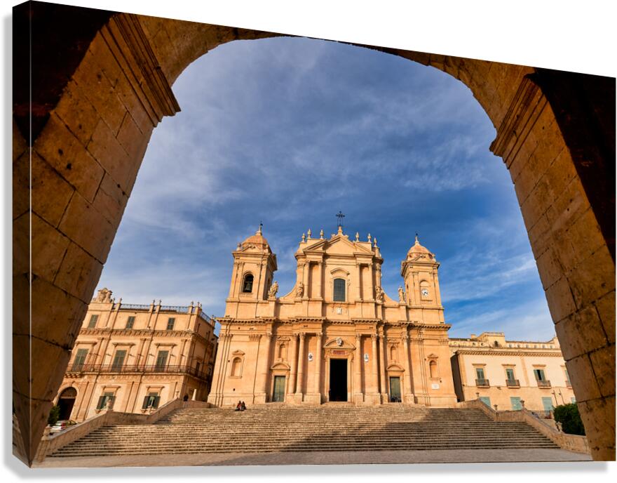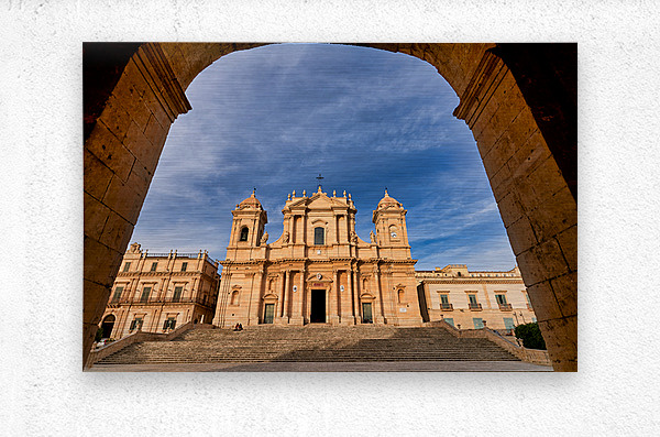 ABOUT THIS ARTWORK: NOTO CATHEDRAL STANDS TALL IN NOTO SICILY WITH BLUE SKY BACKDRO