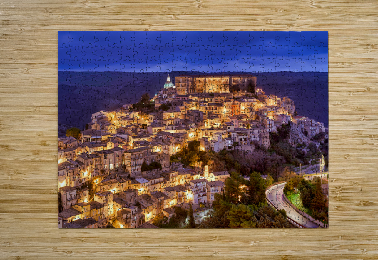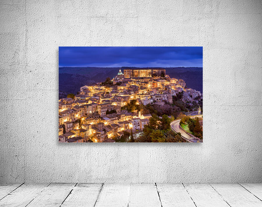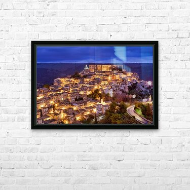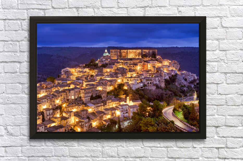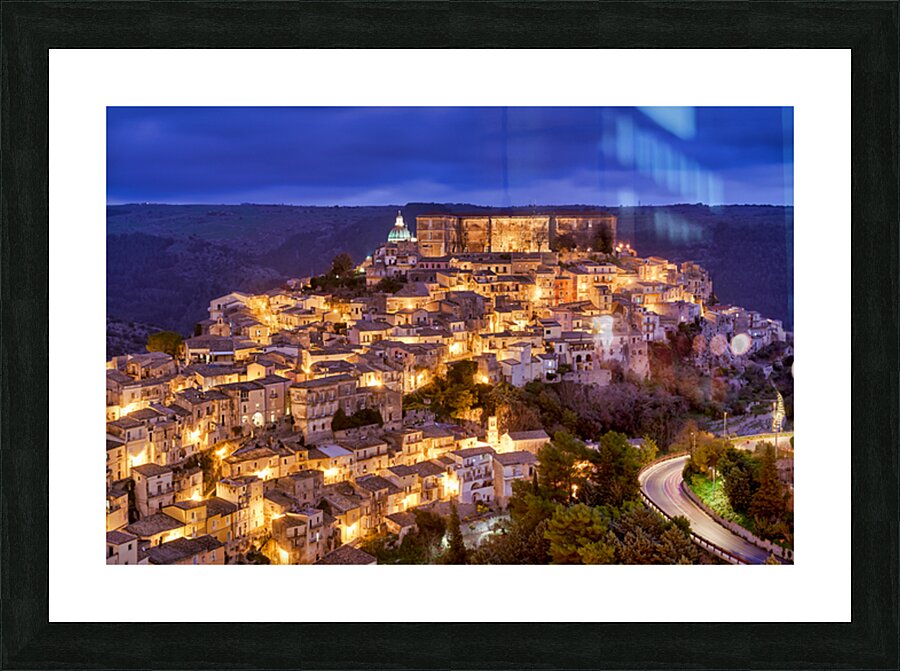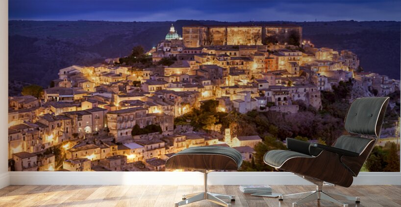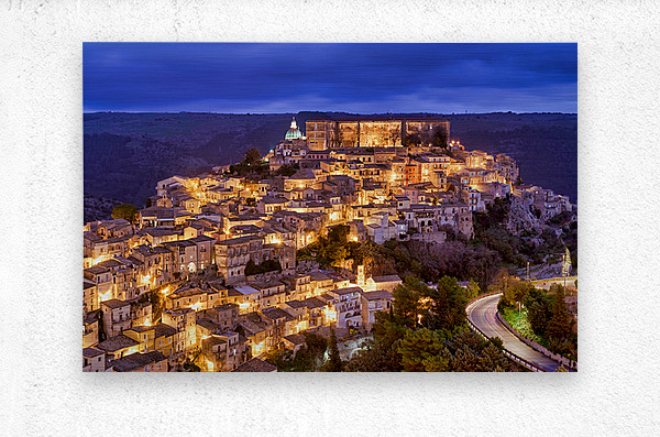 Ragusa Ibla shows its charm during sunset with warm lights emerging from the buildings. The skyline reflects the beauty of the old town.