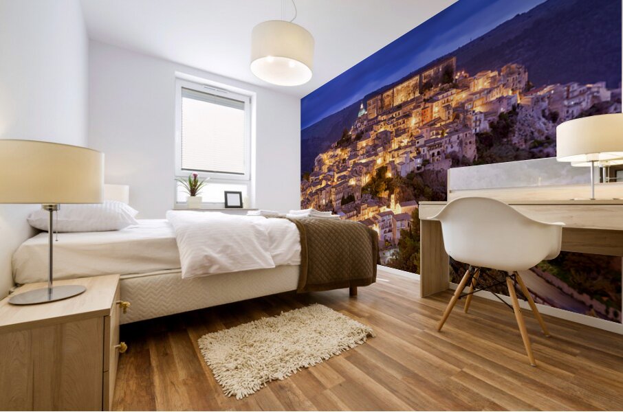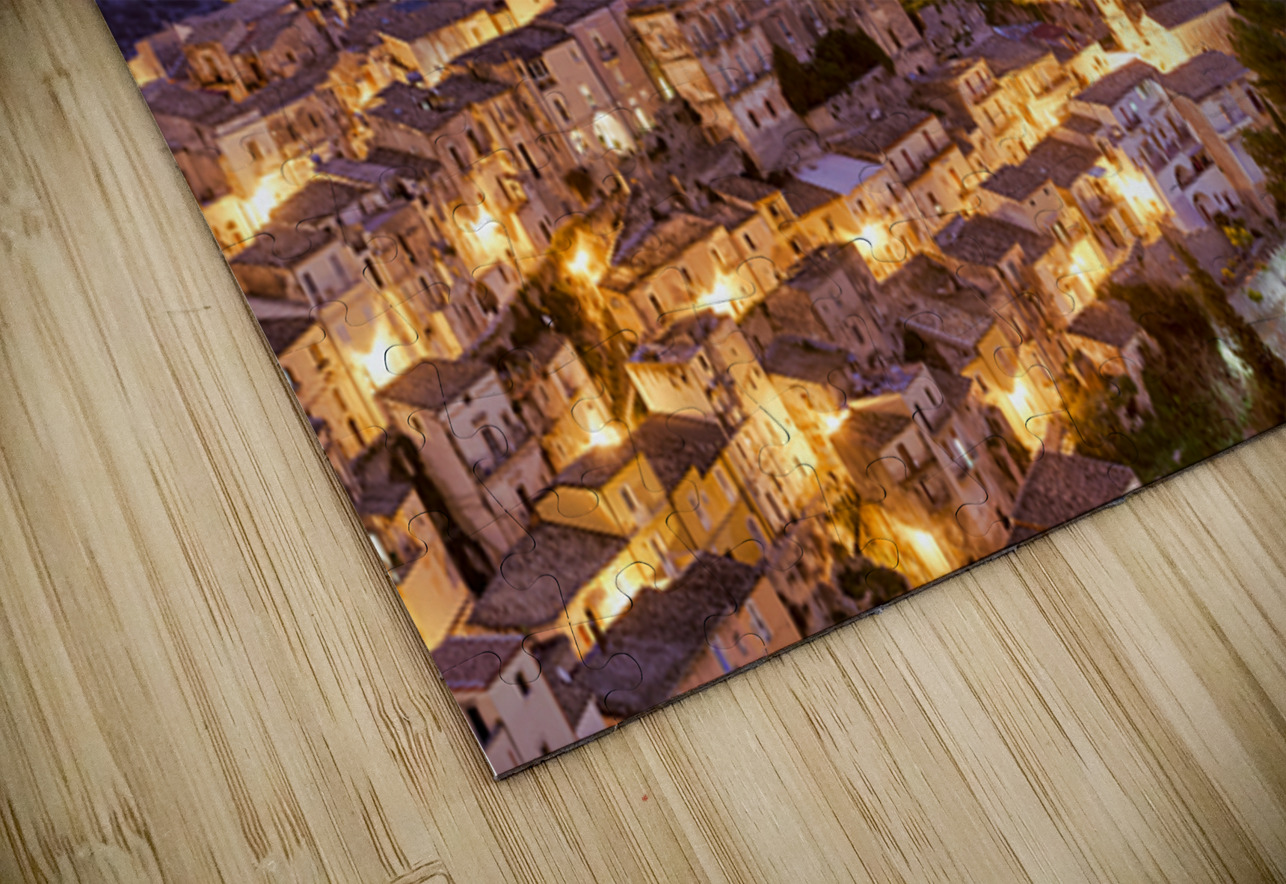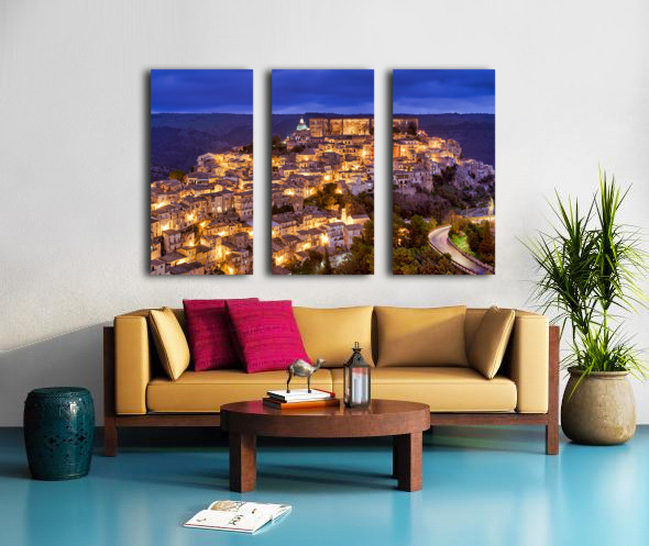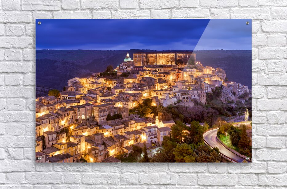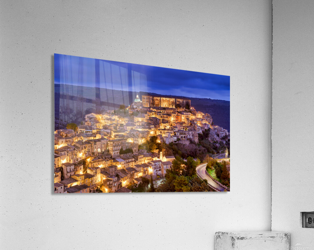 Ragusa Ibla shows its charm during sunset with warm lights emerging from the buildings. The skyline reflects the beauty of the old town.