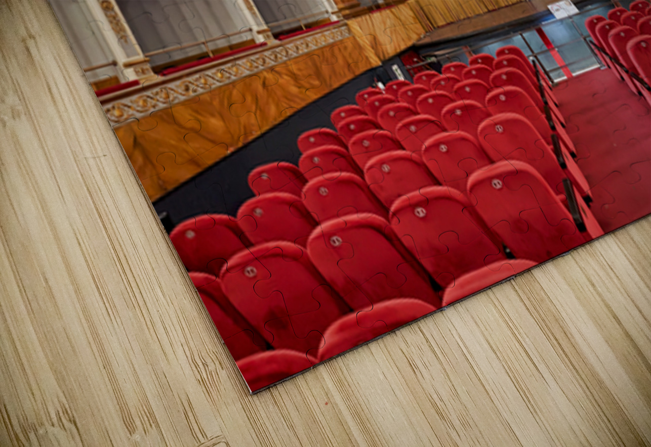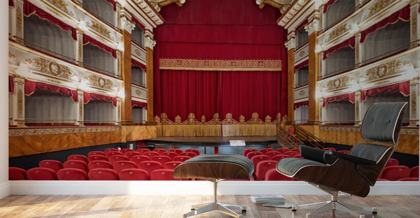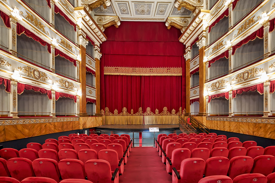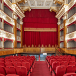Teatro Tina di Lorenzo shows red seats and a stage with a red curtain. The theater is in Noto Sicily. It is ready for a performance.
