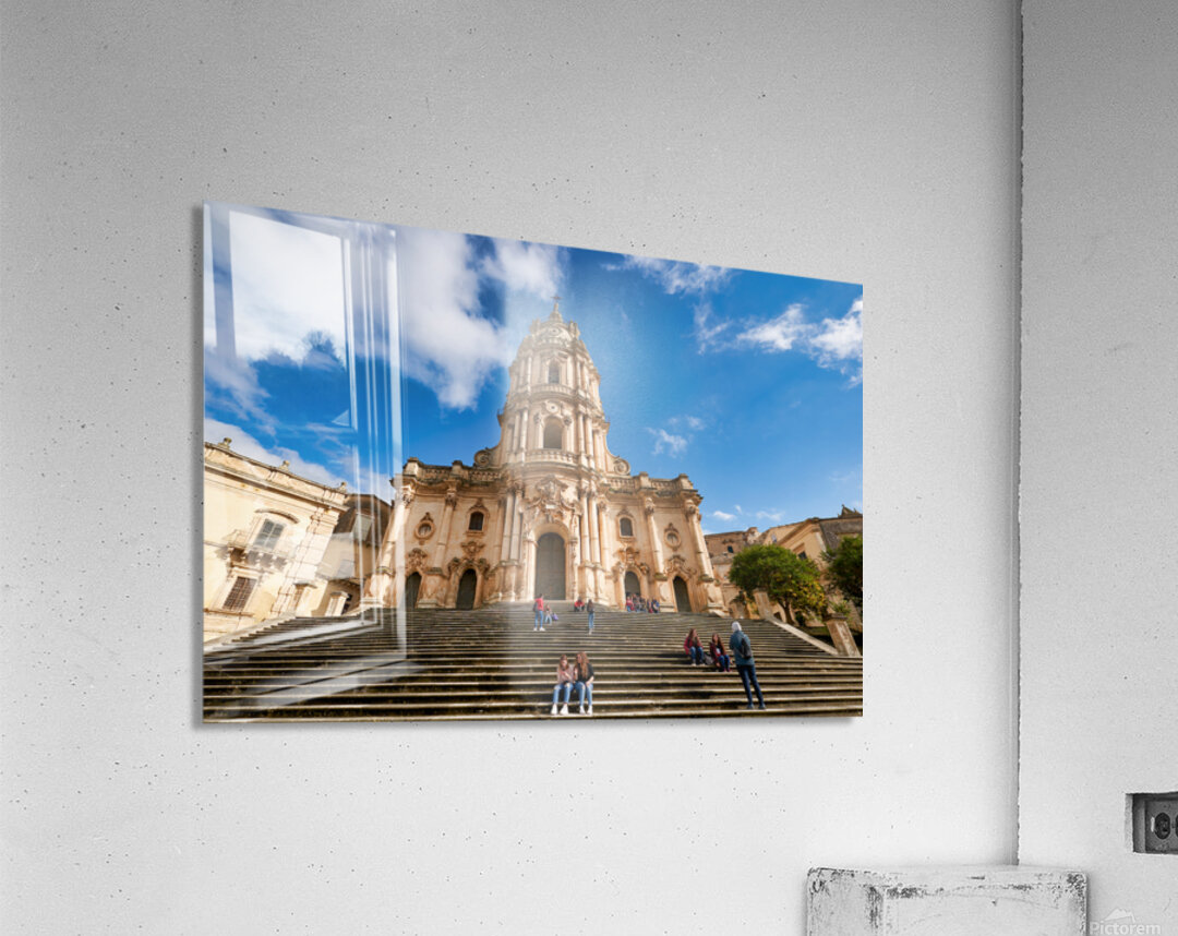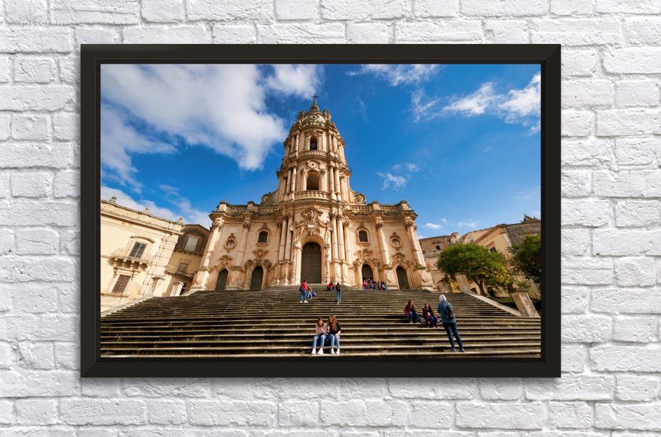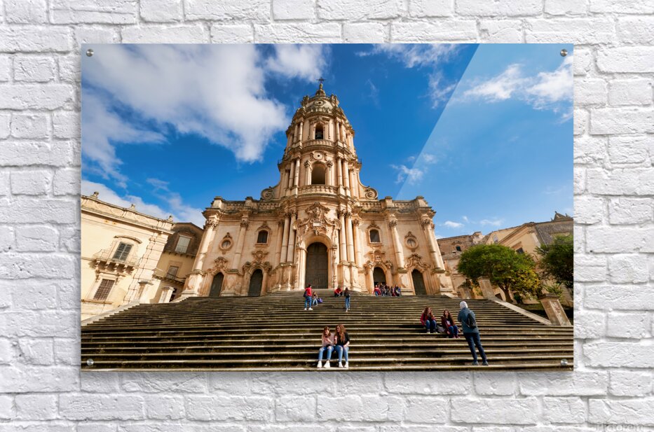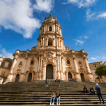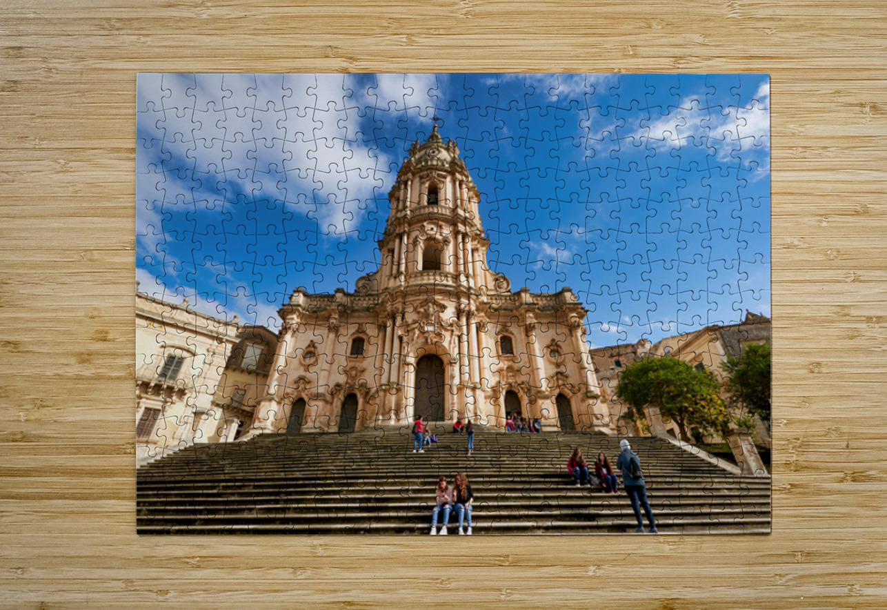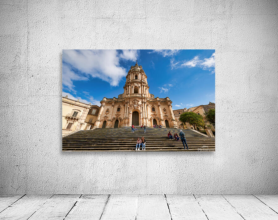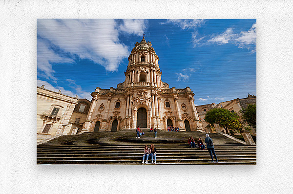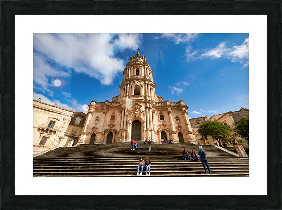Visitors sit on the steps of Duomo of San Giorgio in Modica Sicily. Clouds drift in the blue sky above the historic cathedral.