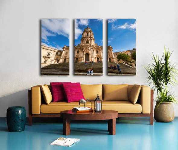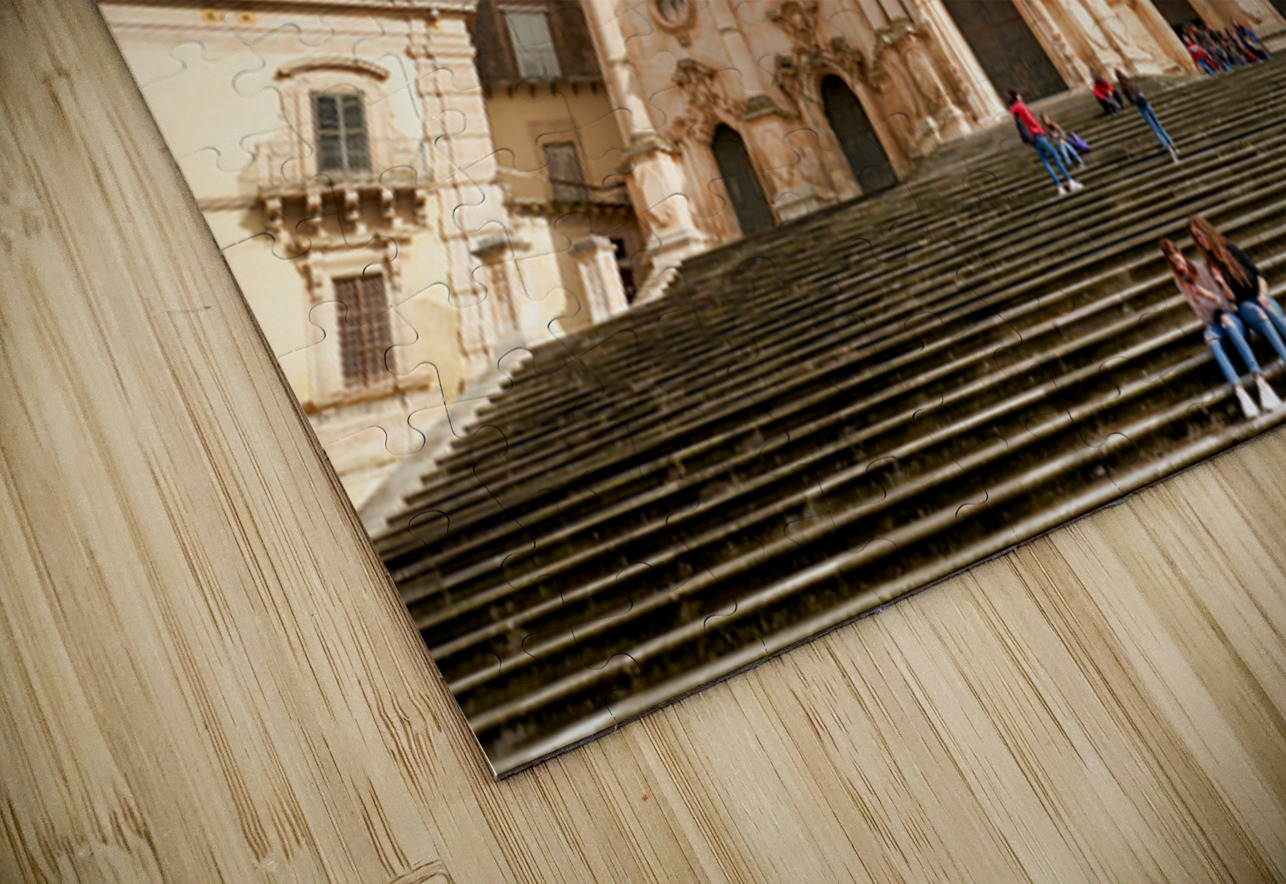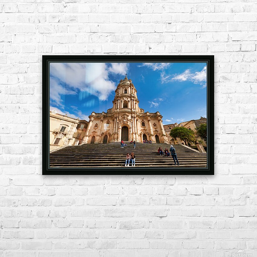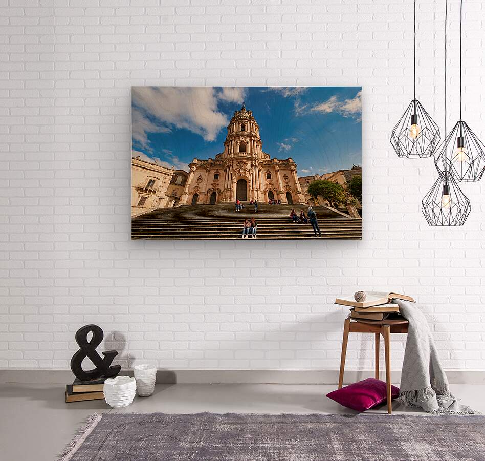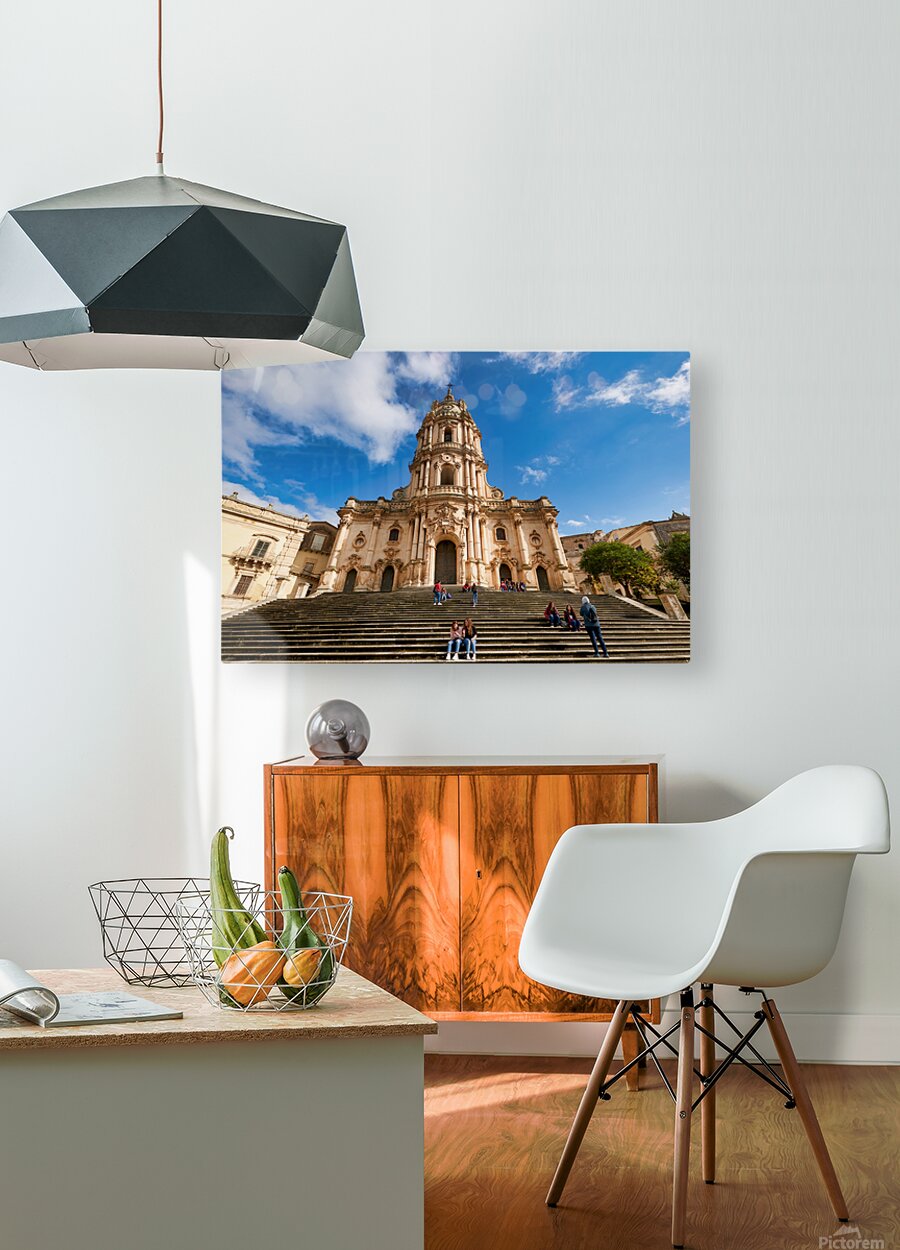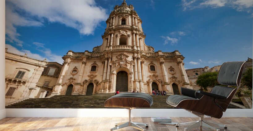 Visitors sit on the steps of Duomo of San Giorgio in Modica Sicily. Clouds drift in the blue sky above the historic cathedral.