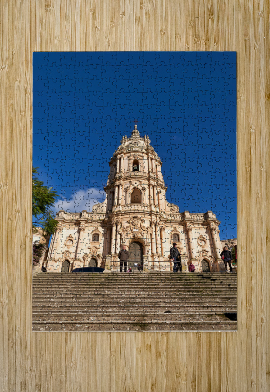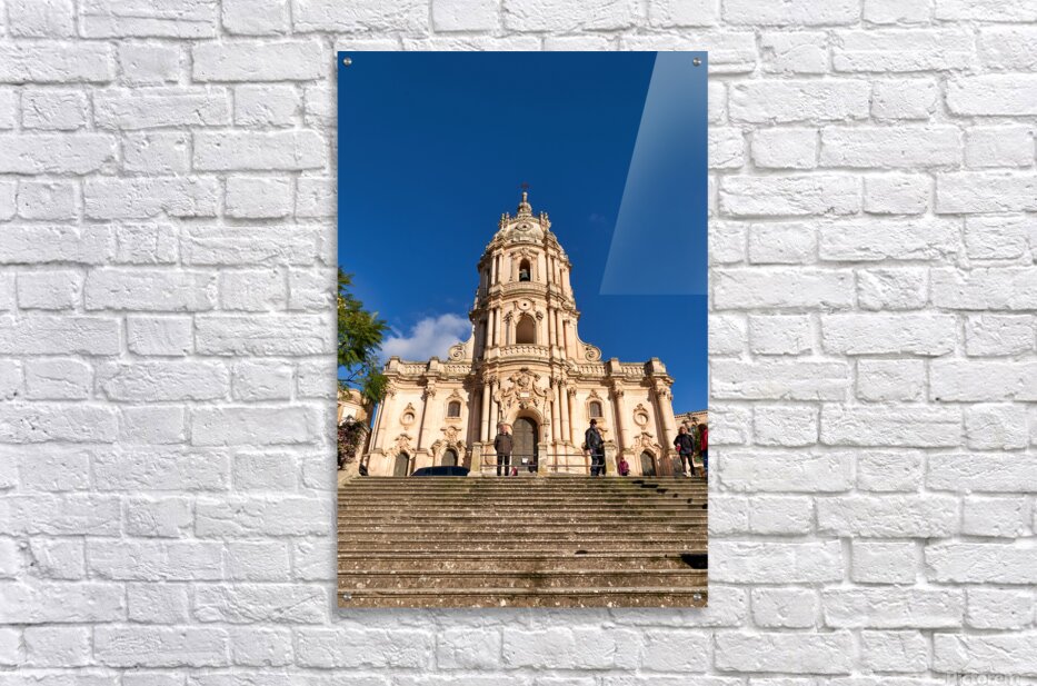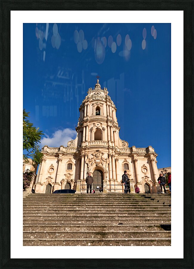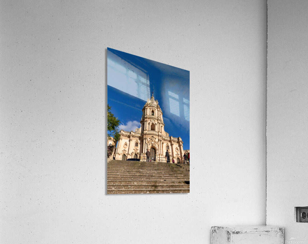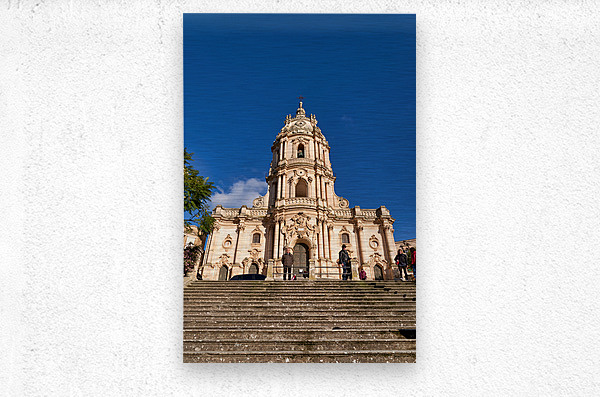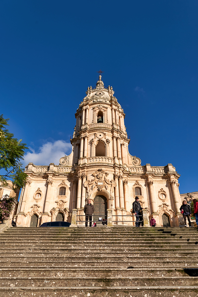 Visitors walk up the steps of Duomo di San Giorgio in Modica Sicily under a clear blue sky. The cathedral shows intricate design.