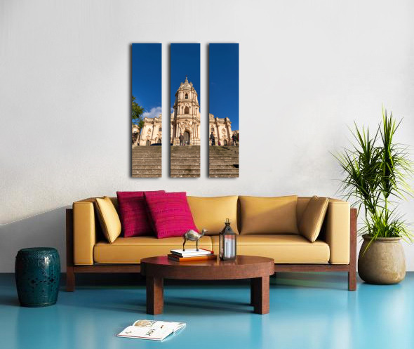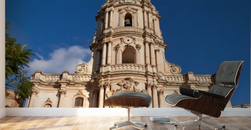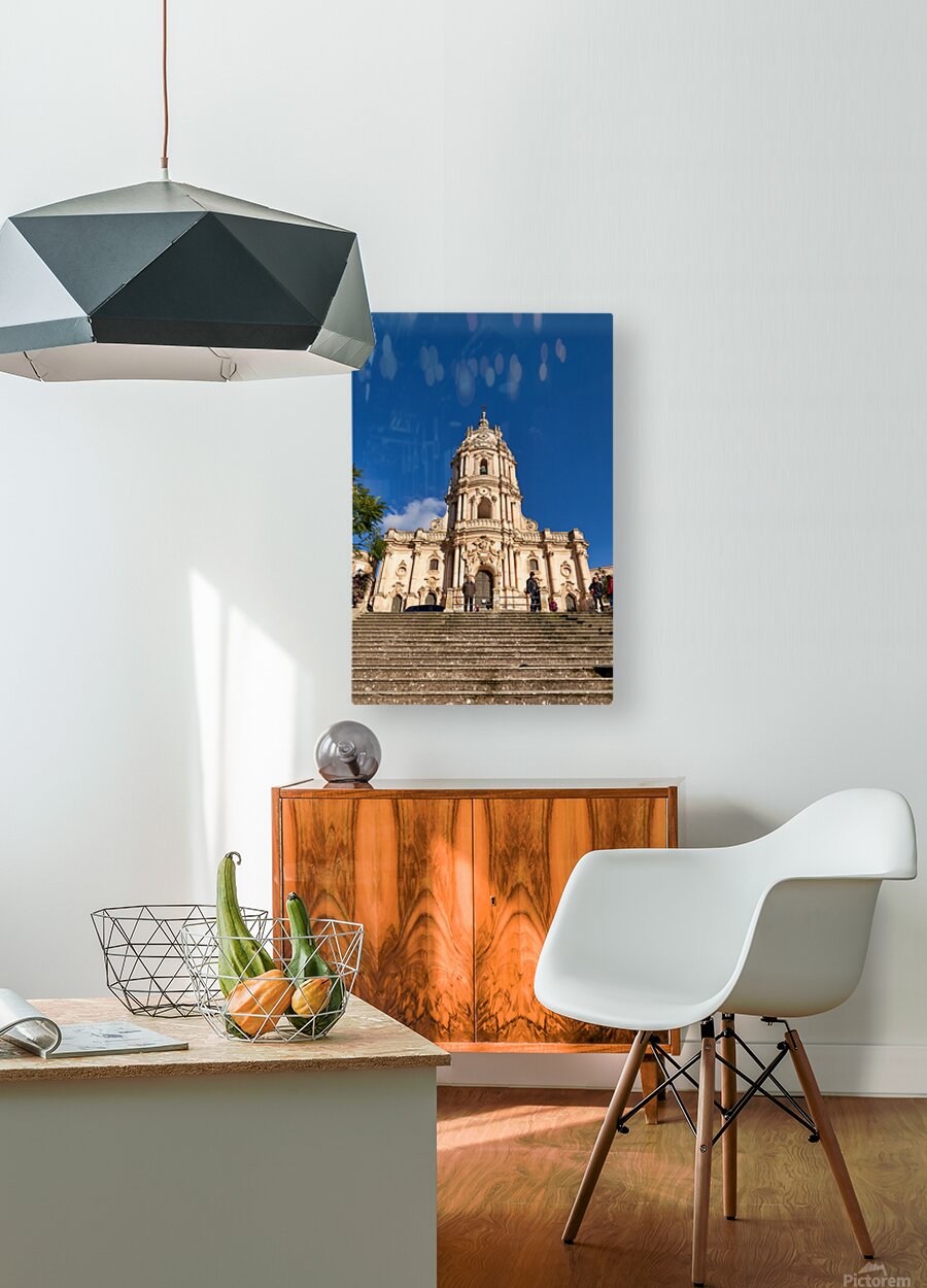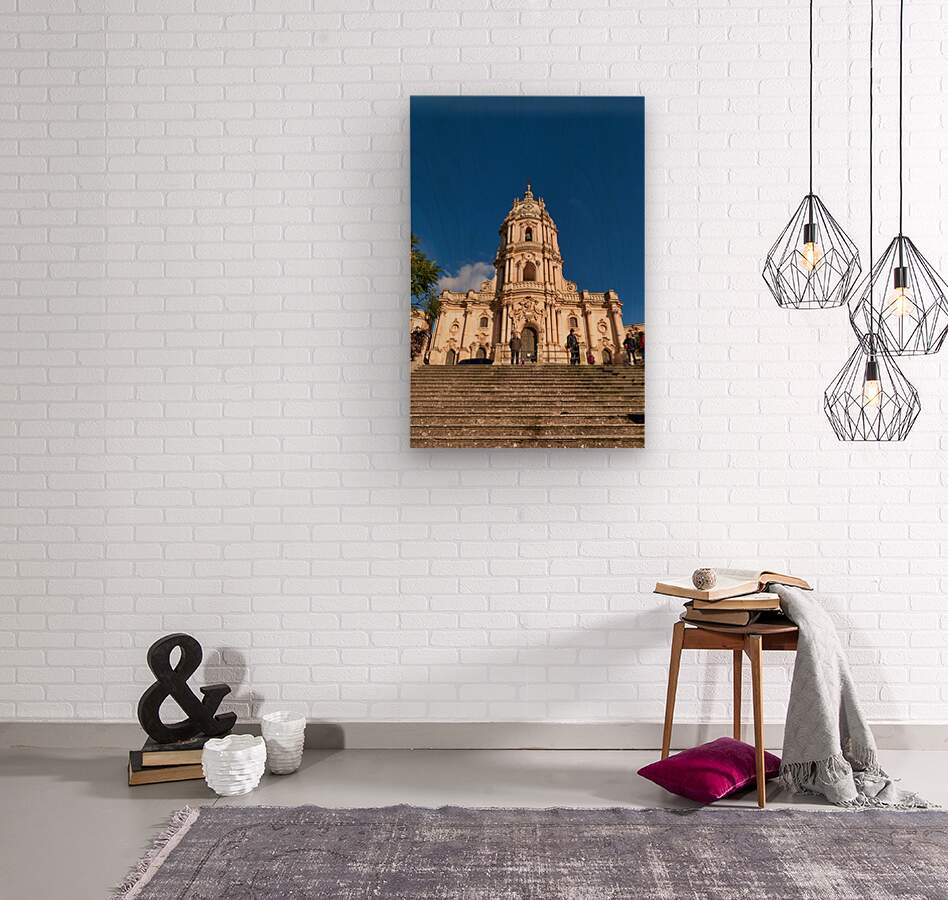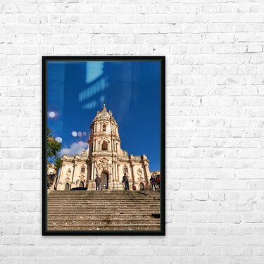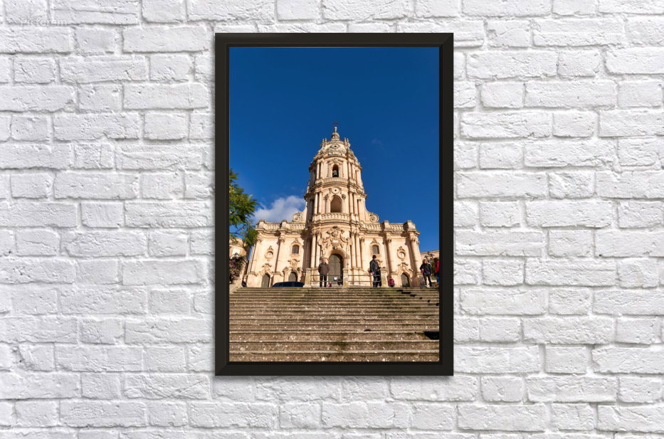 Visitors walk up the steps of Duomo di San Giorgio in Modica Sicily under a clear blue sky. The cathedral shows intricate design.