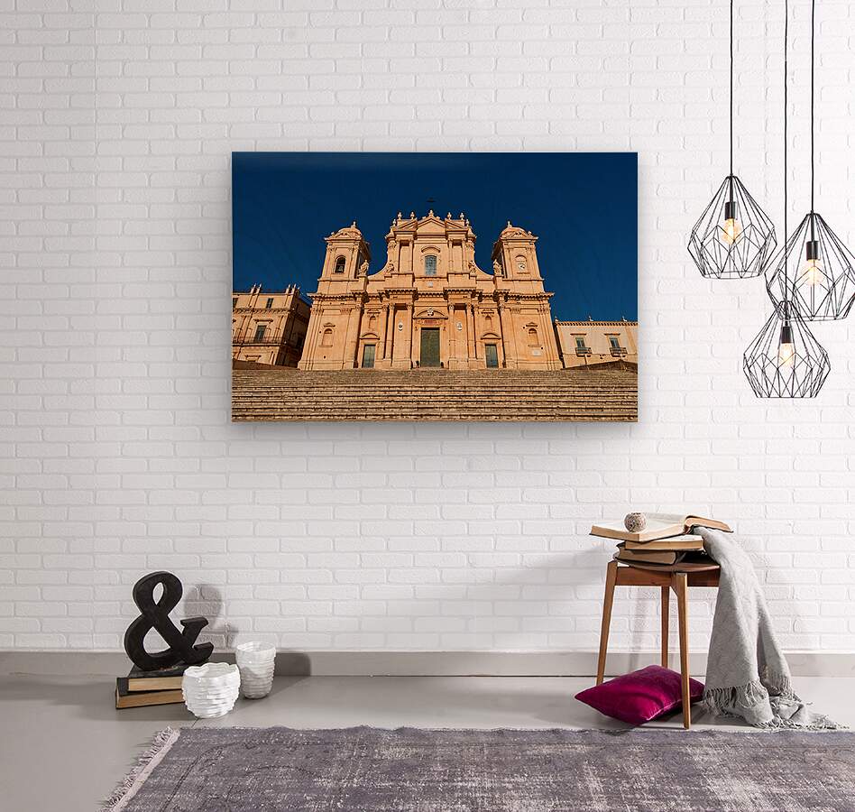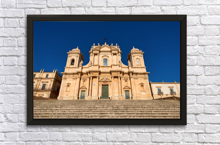 "Noto Cathedral stands tall in Sicily under a clear blue sky" in a framed print.