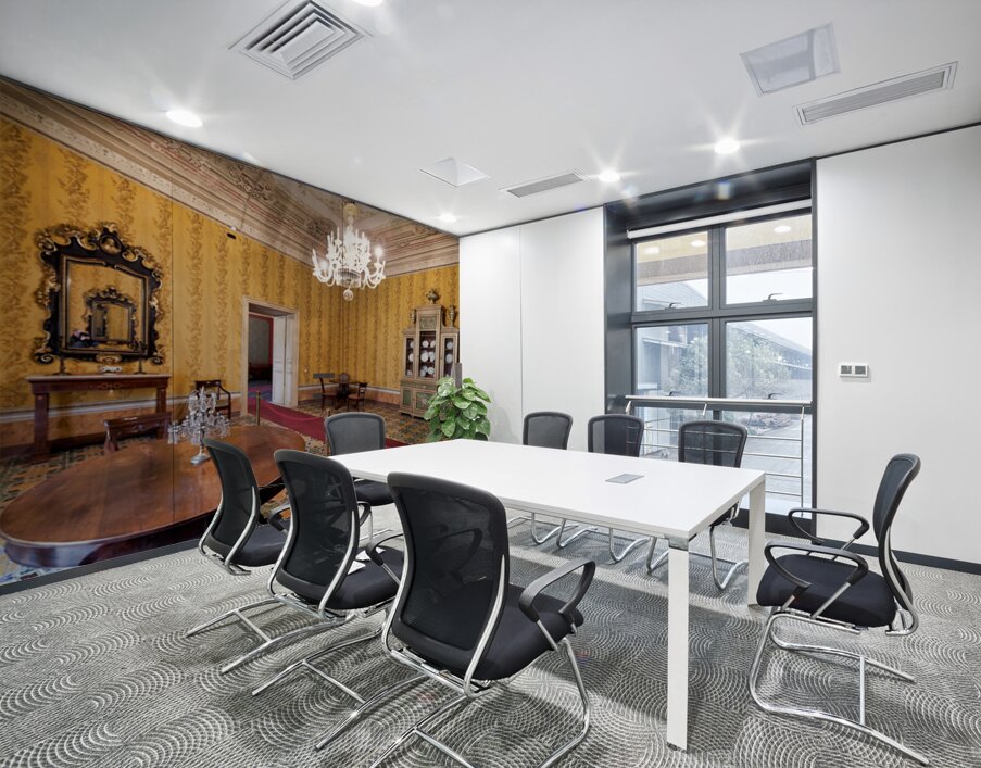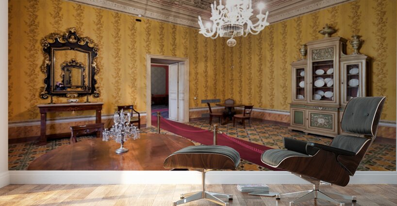 Visitors see the interior of Palazzo Nicolaci in Noto Sicily Italy. The room has decorative walls furniture and a chandelier.