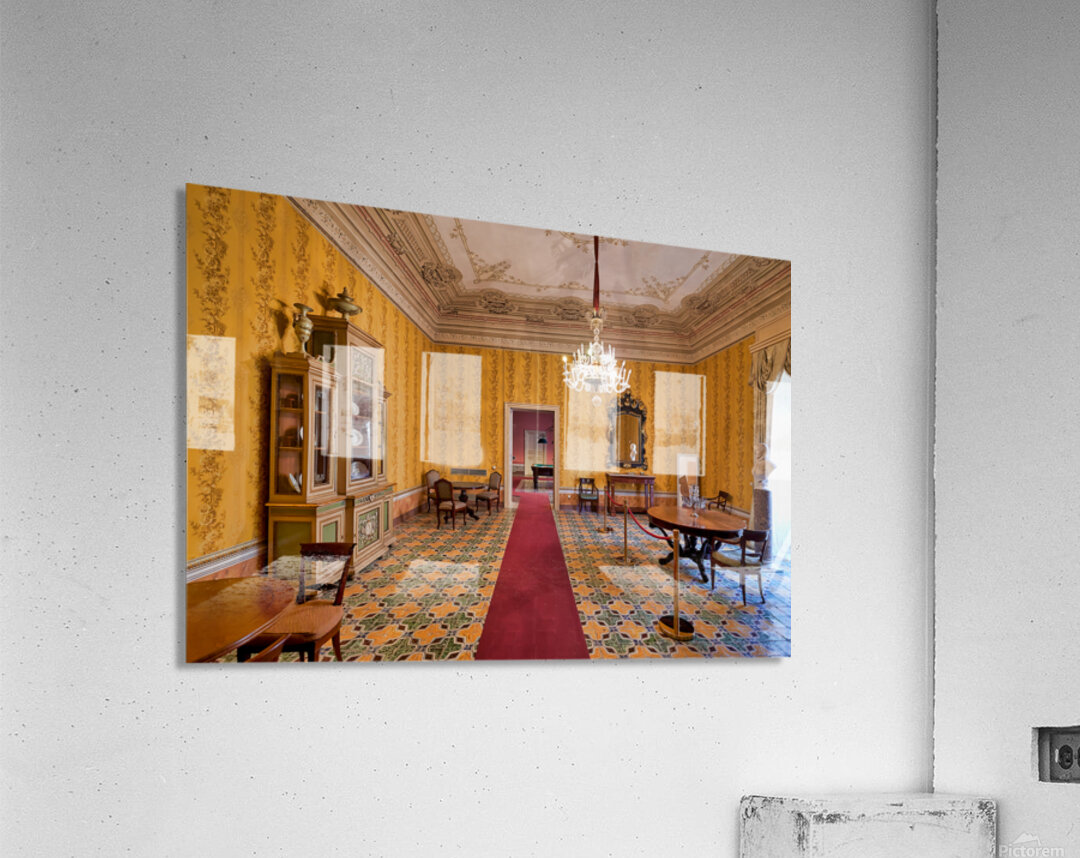Visitors explore the interior of Palazzo Nicolaci in Noto Sicily observing the unique decor and furniture from a past era.