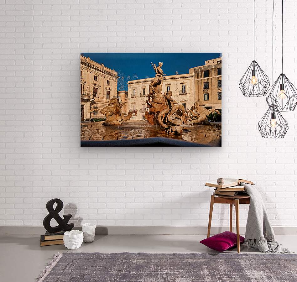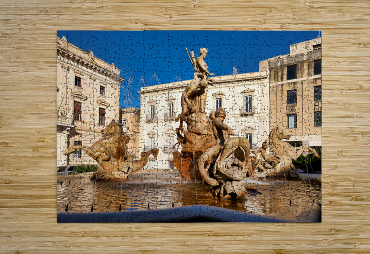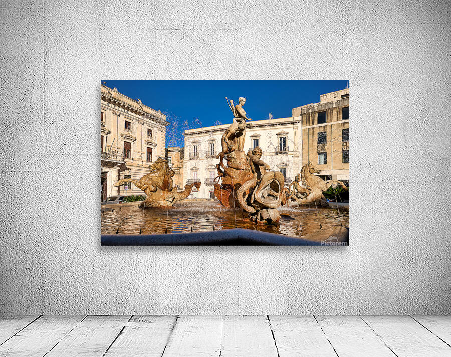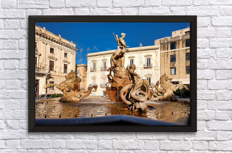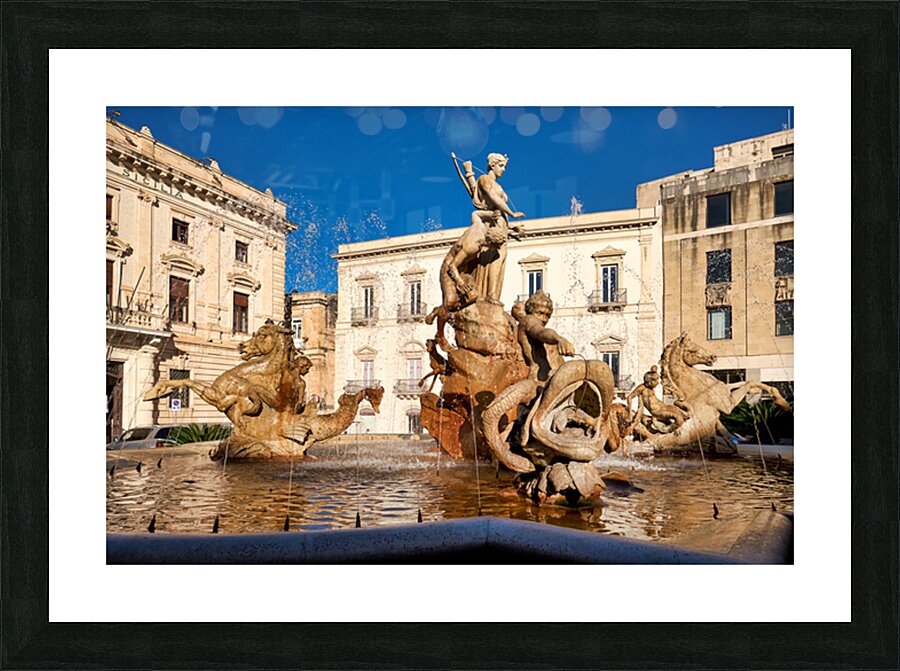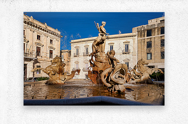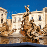 Water flows from the Fountain of Diana in Syracuse Ortygia Sicily. The statue shows figures of gods and creatures. Tourists visit this site.