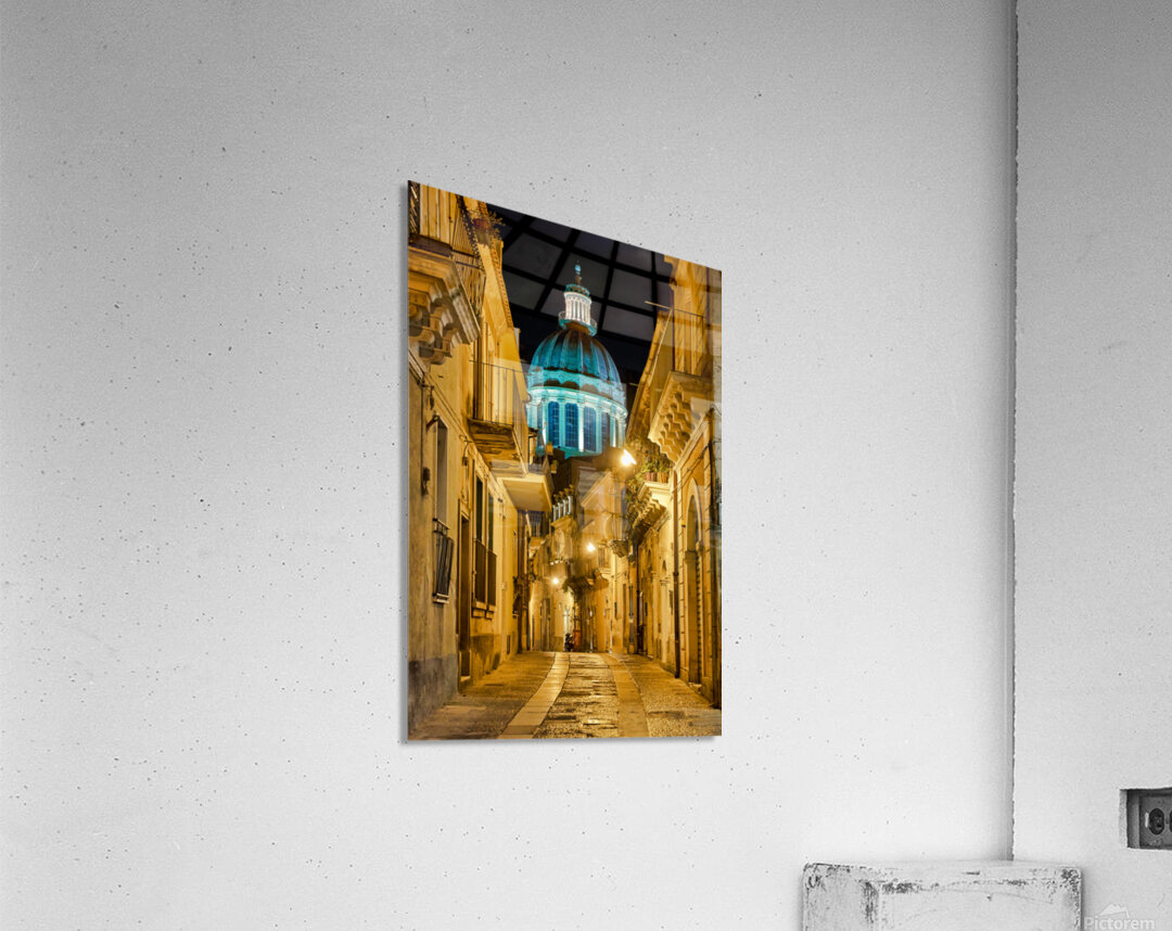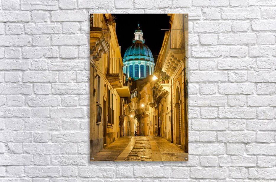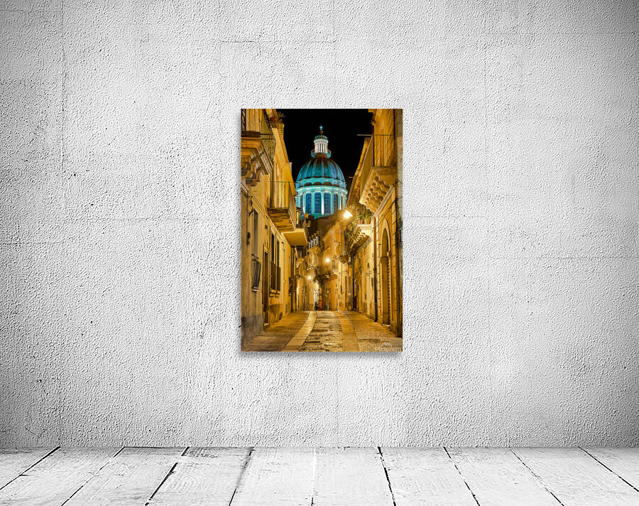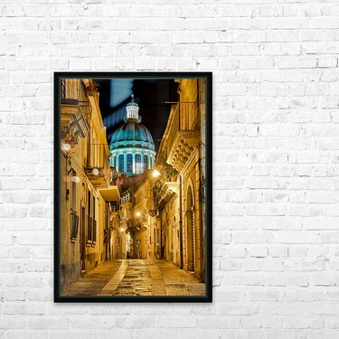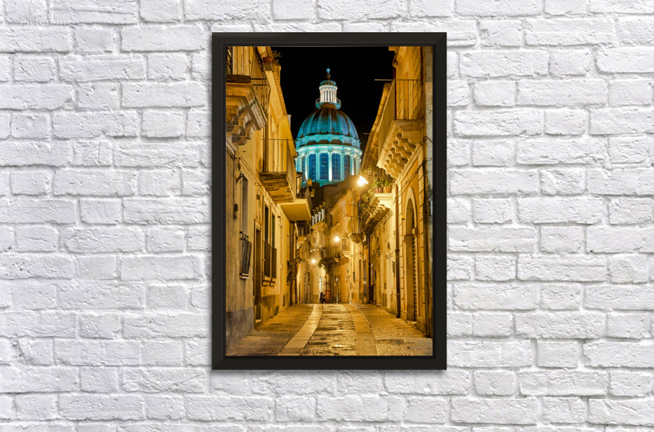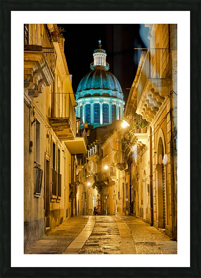 "Duomo of San Giorgio shines at night in Modica Sicily Italy" in a framed print.