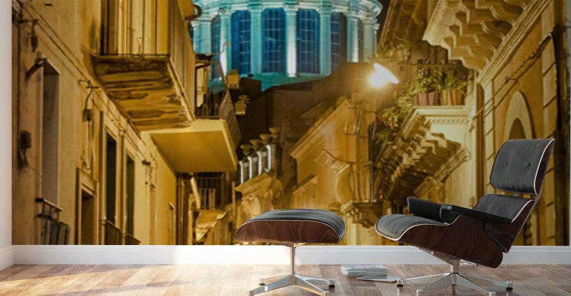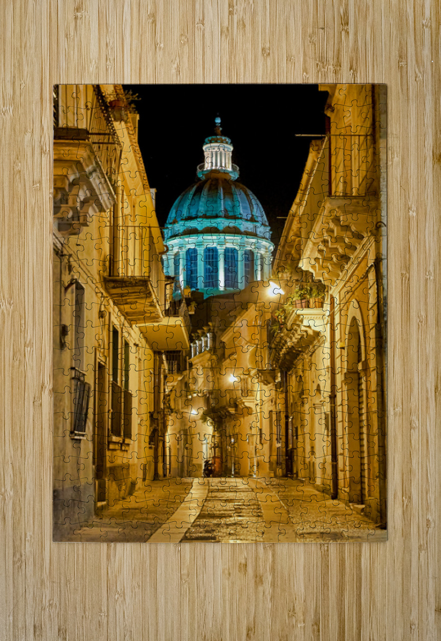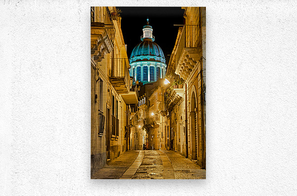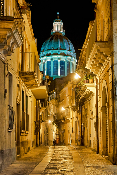 The Duomo of San Giorgio dome is illuminated at night in Modica. Empty streets reflect the light from buildings and the dome.