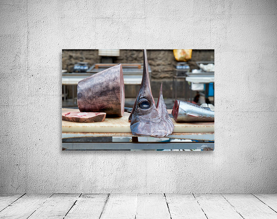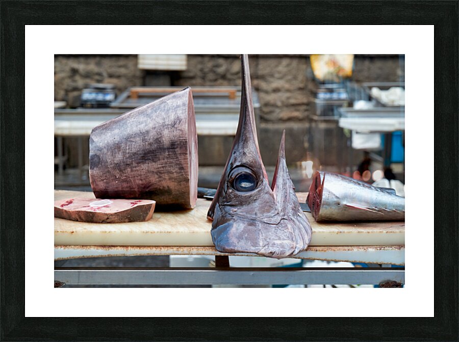 At Piscaria market in Catania vendors showcase fresh fish meat and vegetables. Customers browse the stalls for local goods daily.