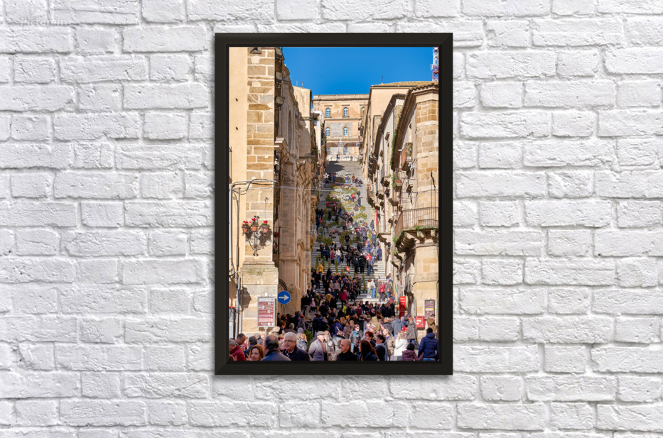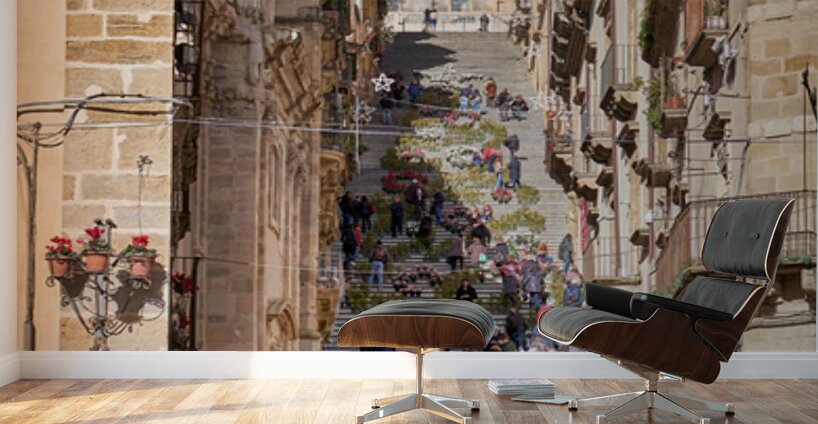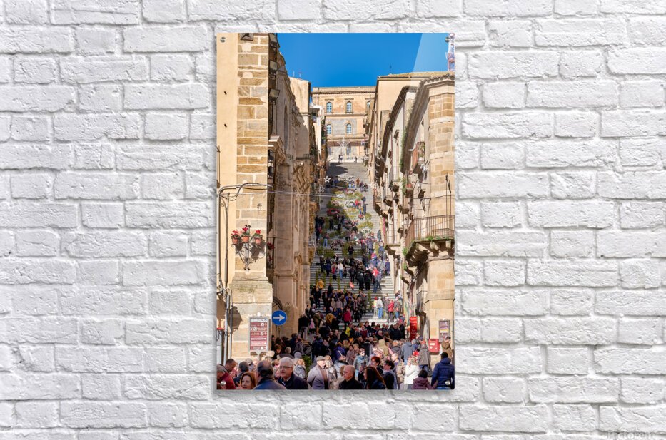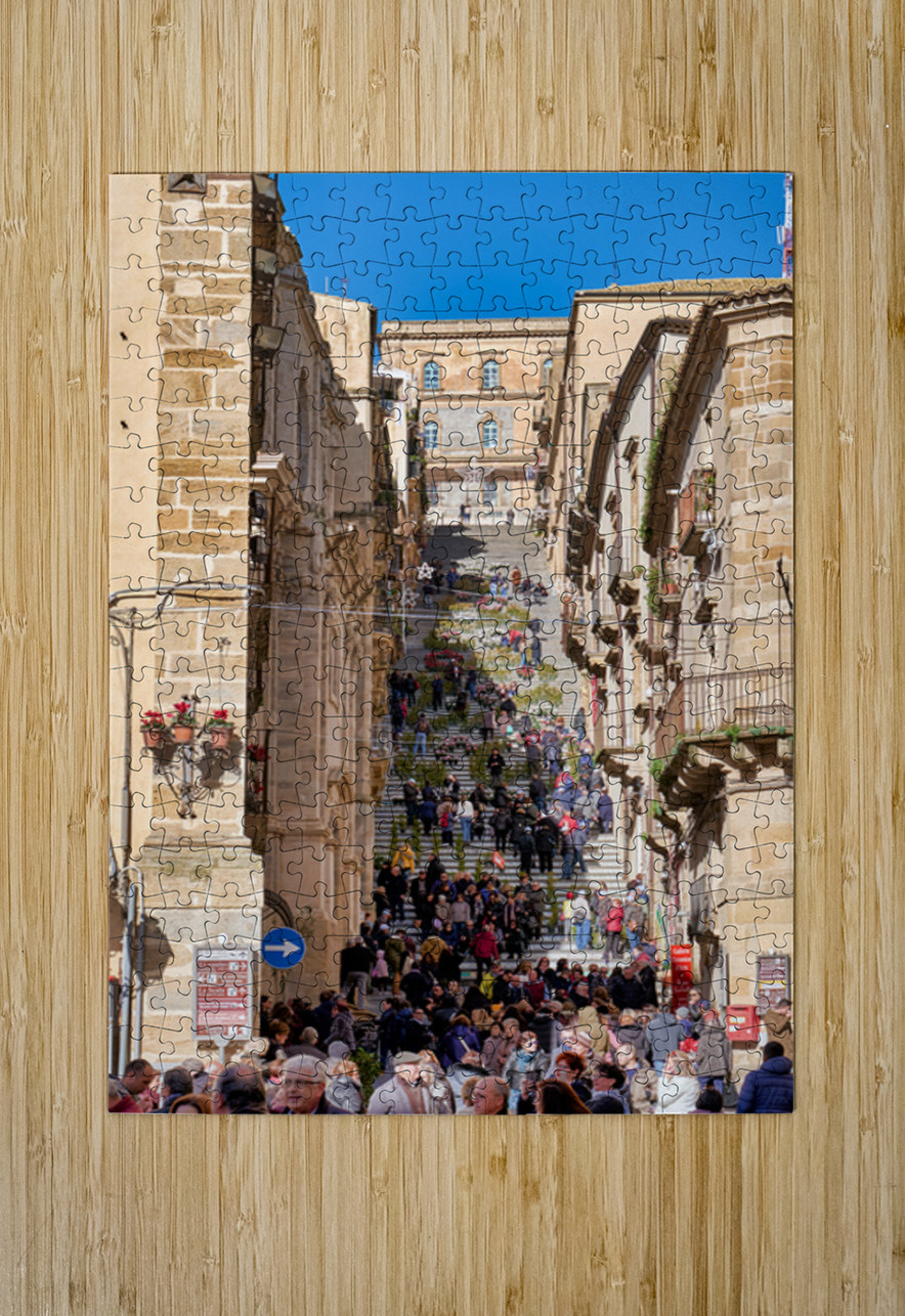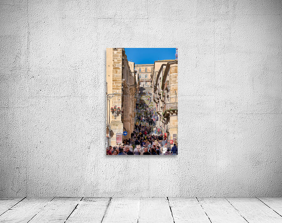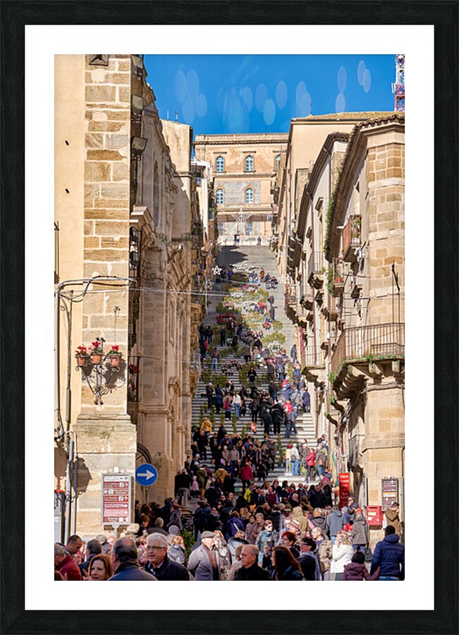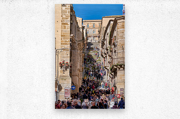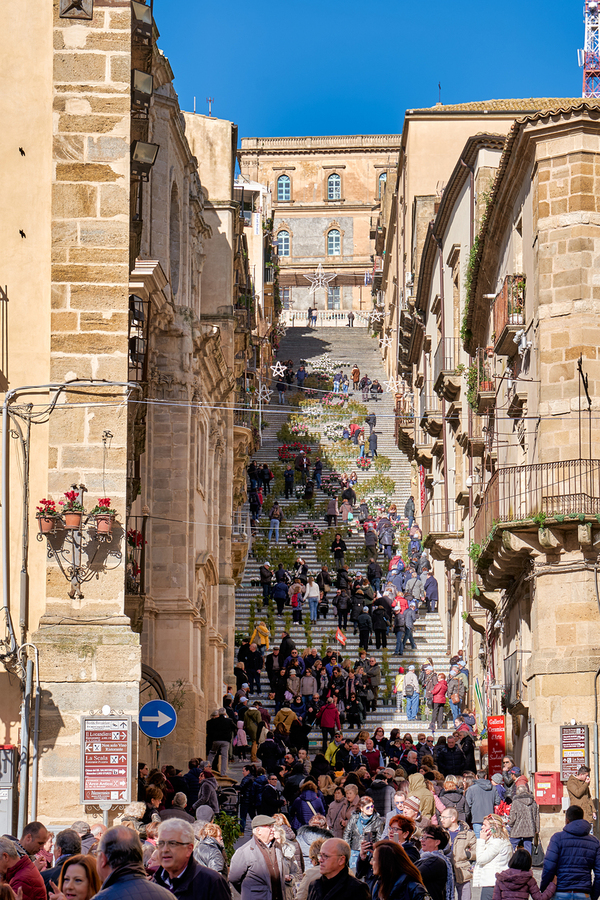 Many people walk up the Scalinata di Santa Maria del Monte in Caltagirone. The staircase is surrounded by historic buildings and bright blue skies.