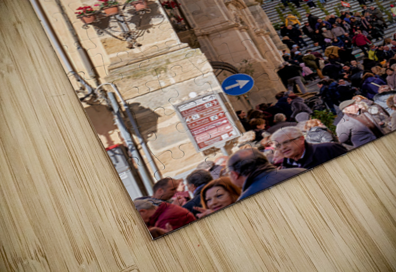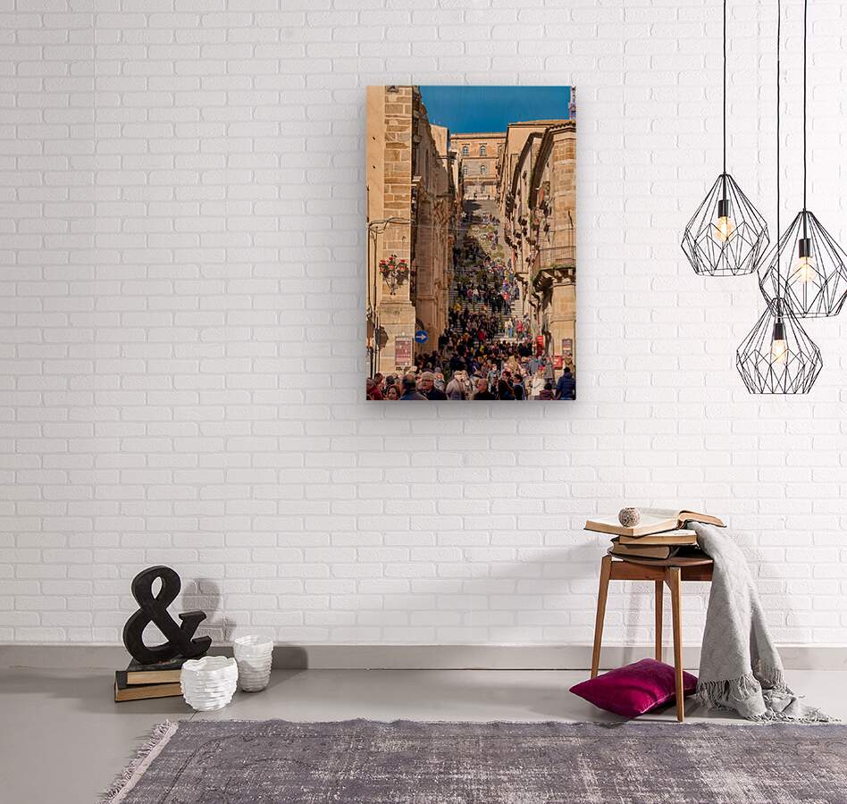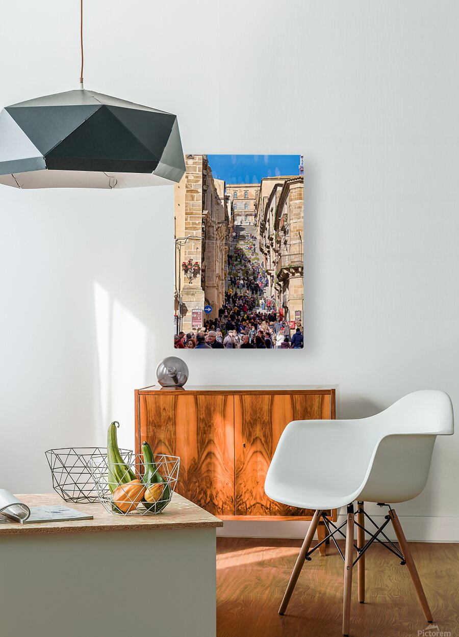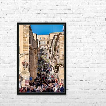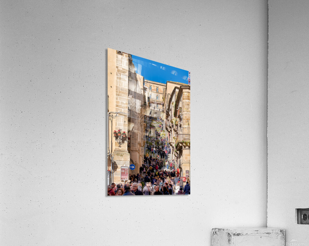 Many people walk up the Scalinata di Santa Maria del Monte in Caltagirone. The staircase is surrounded by historic buildings and bright blue skies.