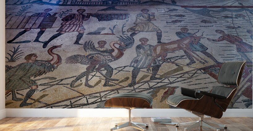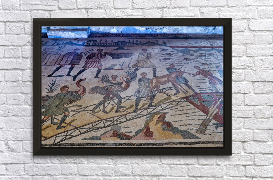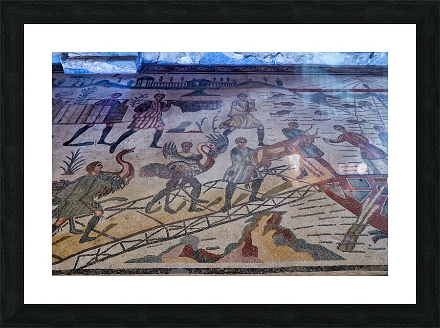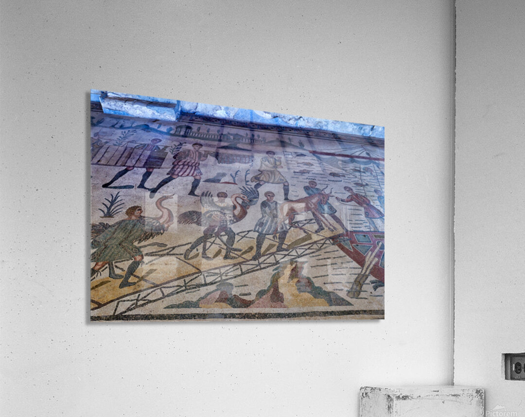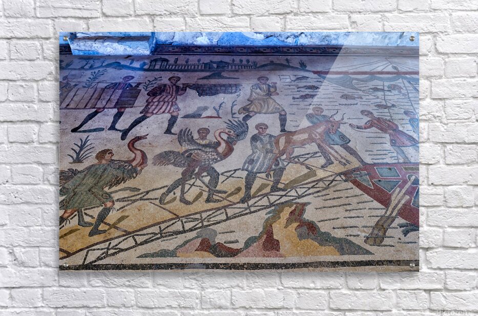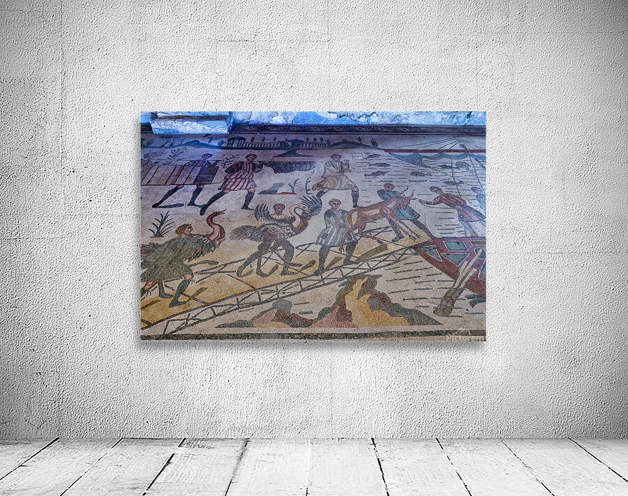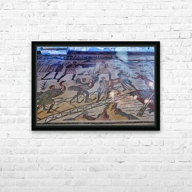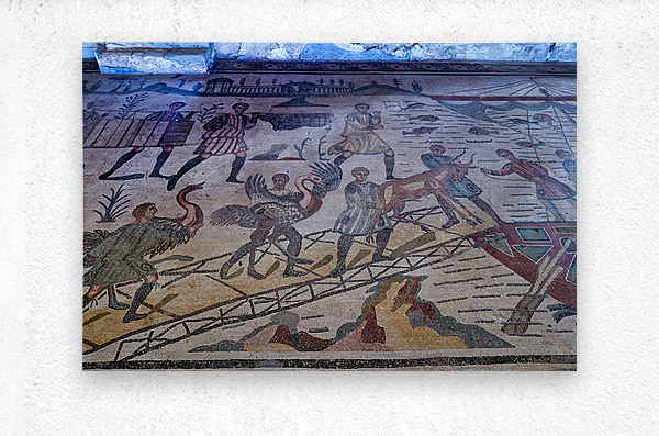 Mosaics depict daily life in ancient Rome with figures animals and activities at the Villa Romana del Casale in Sicily.