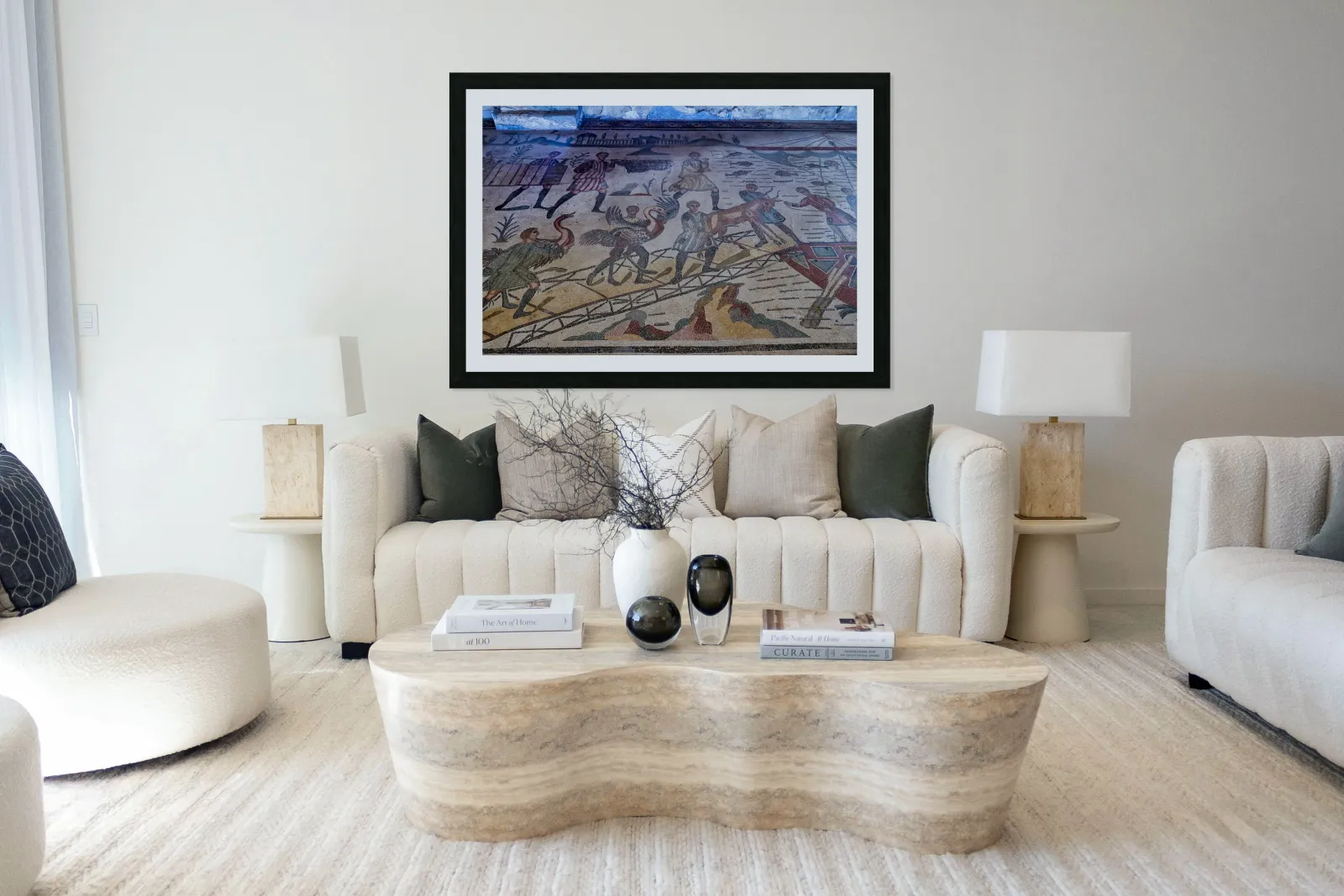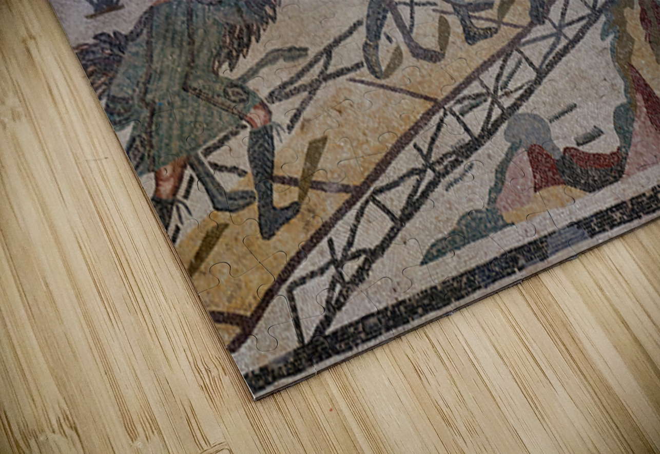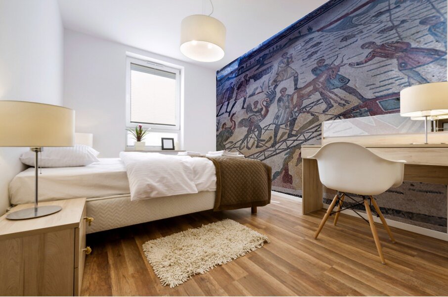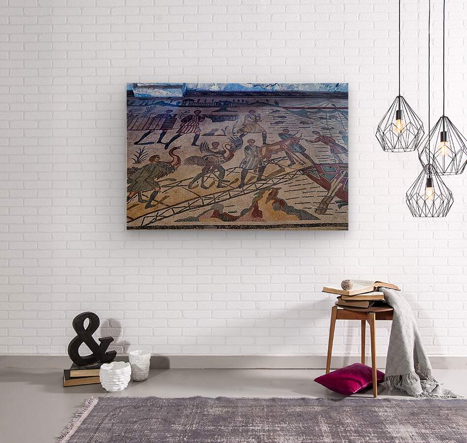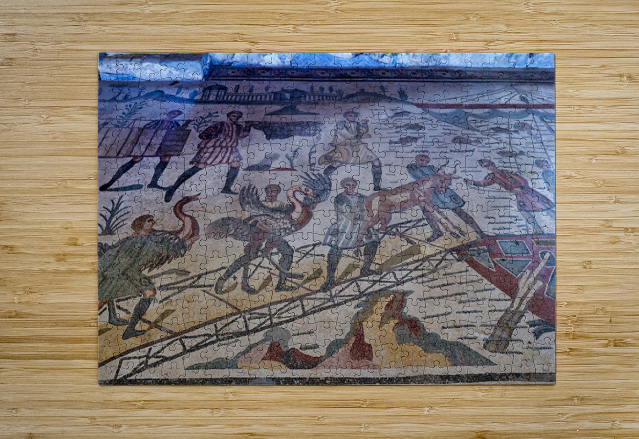 Mosaics depict daily life in ancient Rome with figures animals and activities at the Villa Romana del Casale in Sicily.