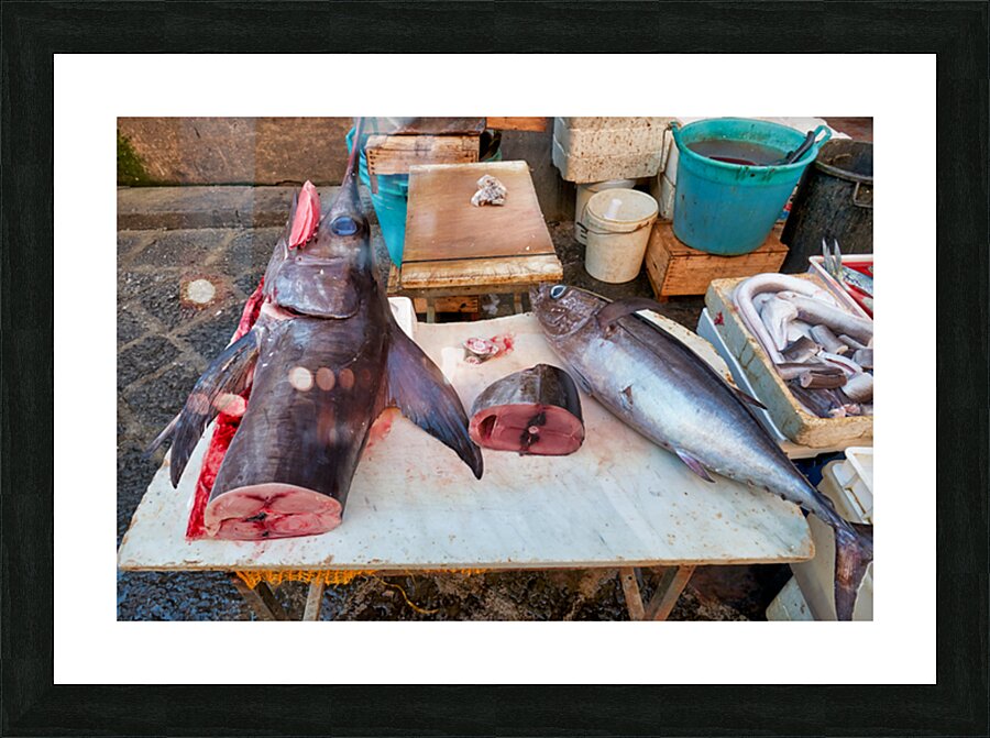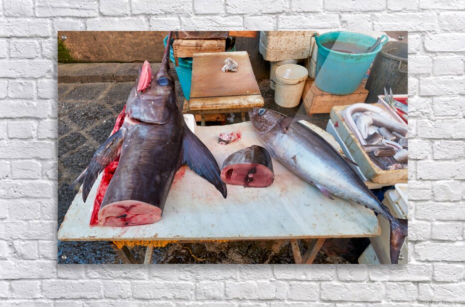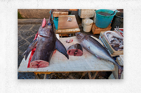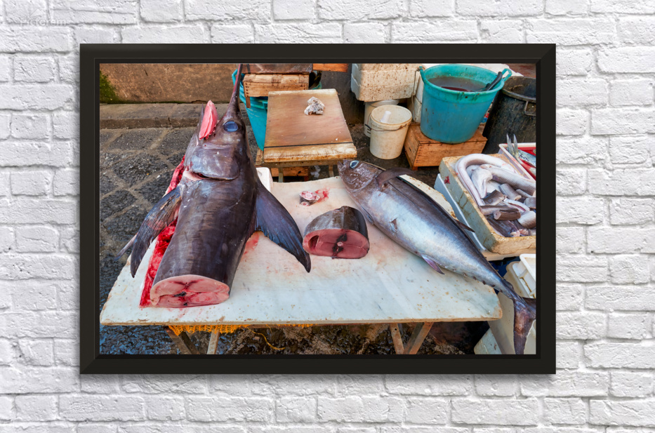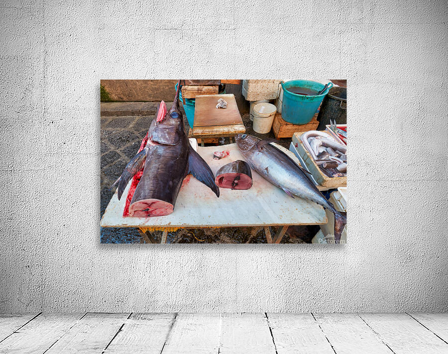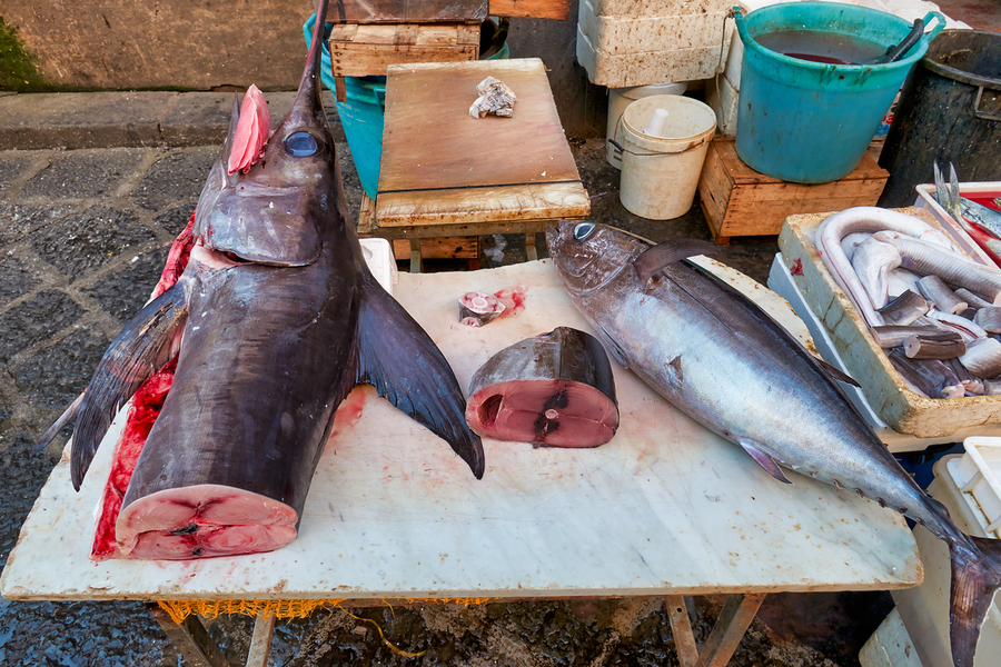 Local vendors prepare and sell fresh fish at Piscaria market in Catania. Customers browse and buy seafood in daylight.