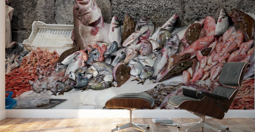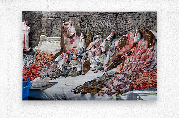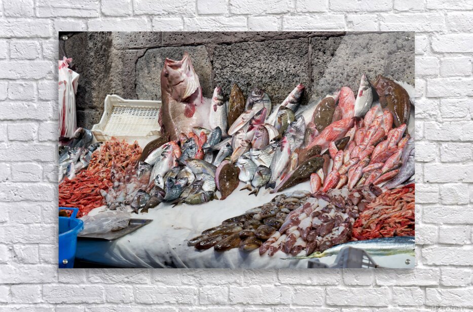 ABOUT THIS ARTWORK: FRESH SEAFOOD DISPLAY AT PISCARIA MARKET IN CATANIA SICILY