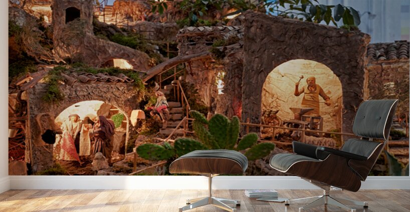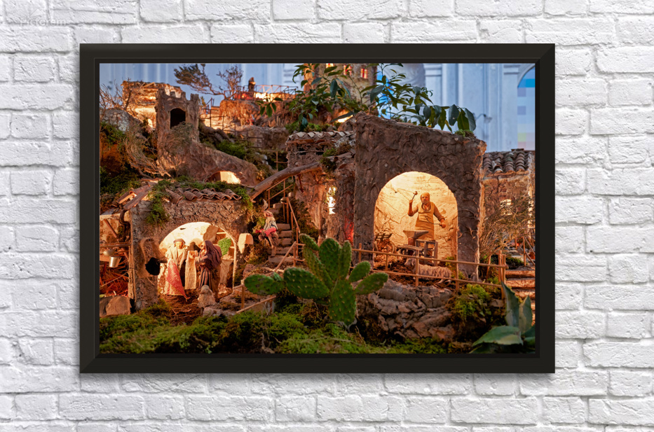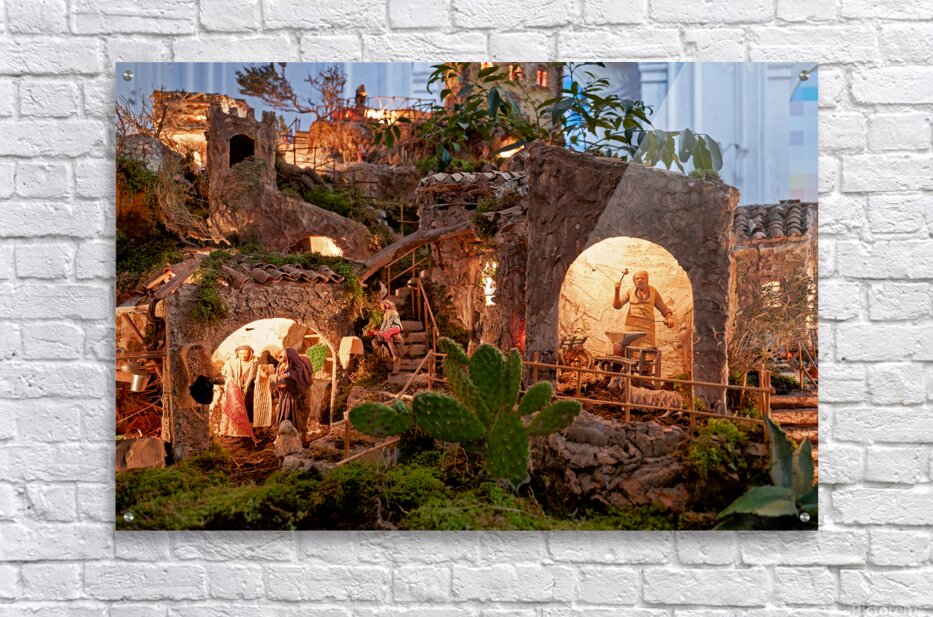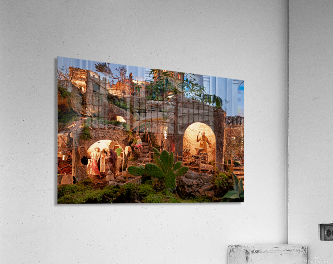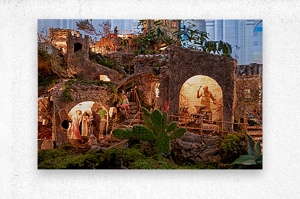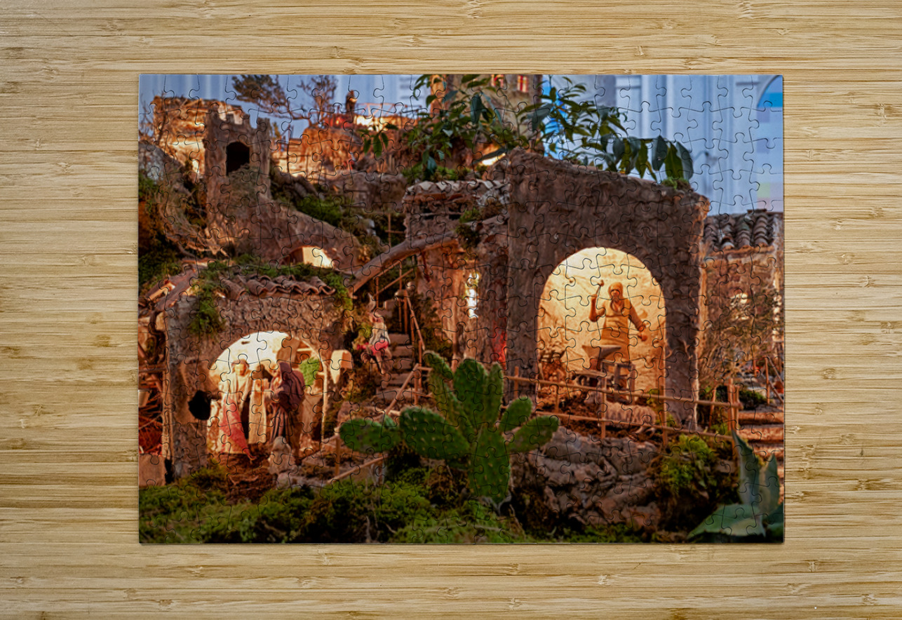 A detailed nativity scene shows figures of Jesus Mary and Joseph amid small houses in Caltagirone. It captures the spirit of Christmas in Sicily.