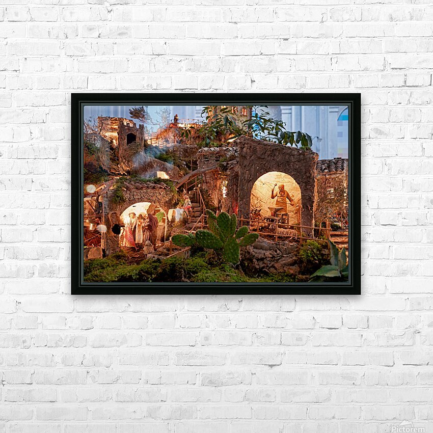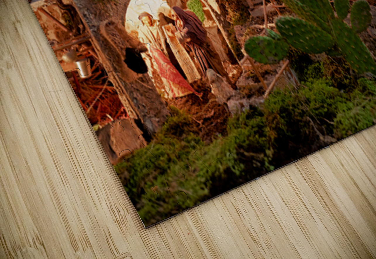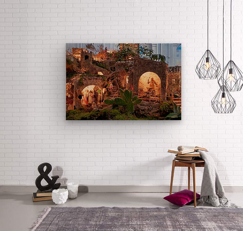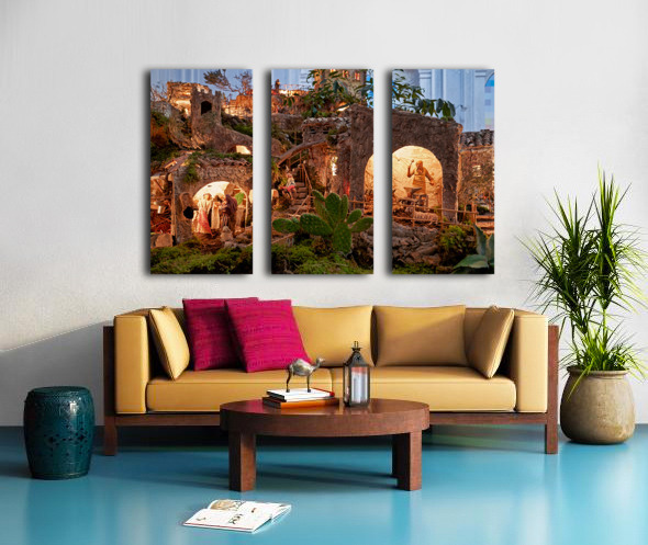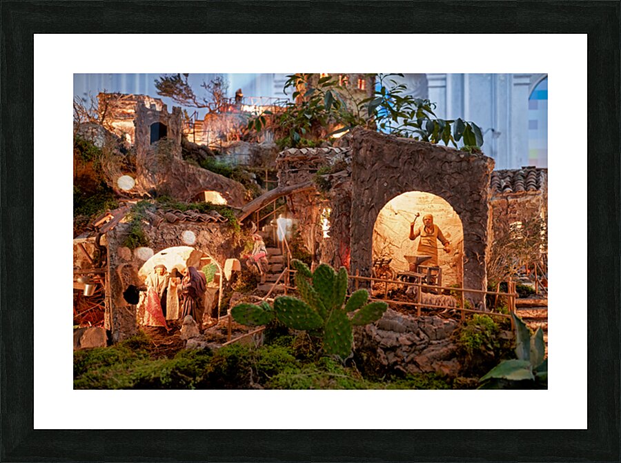 A detailed nativity scene shows figures of Jesus Mary and Joseph amid small houses in Caltagirone. It captures the spirit of Christmas in Sicily.