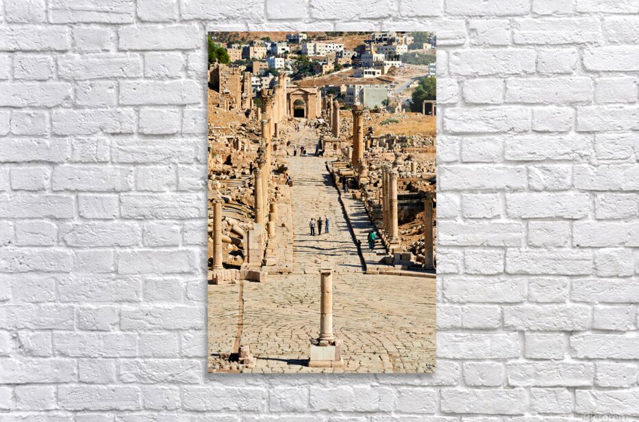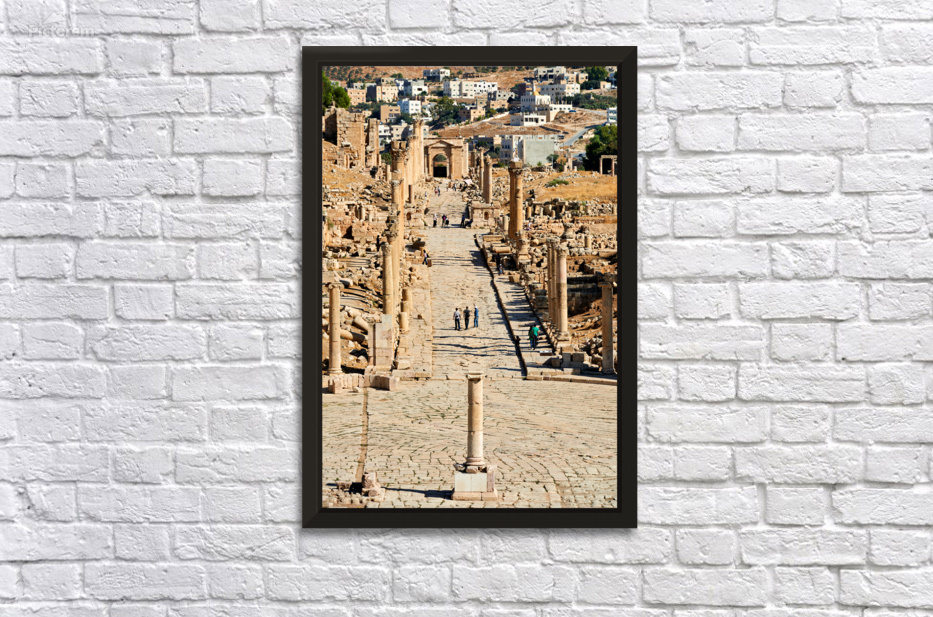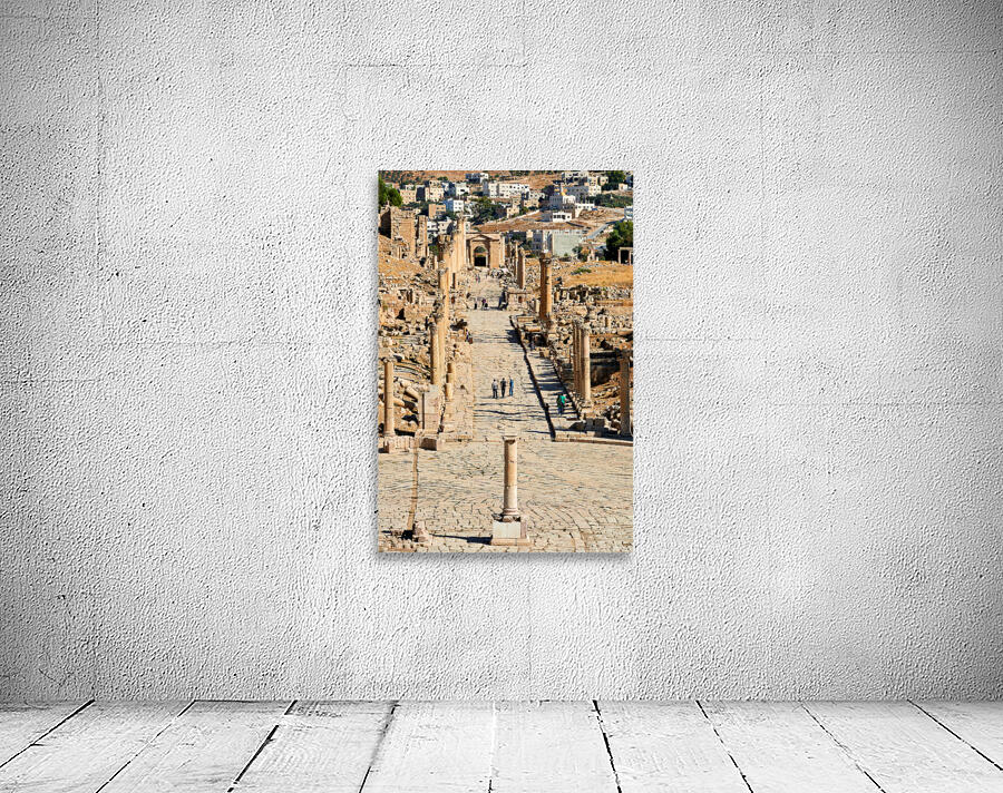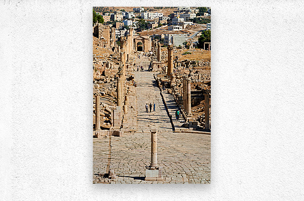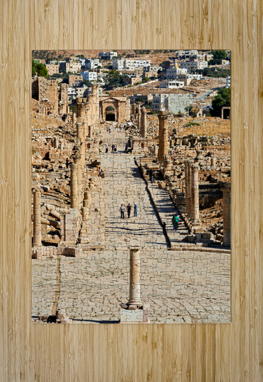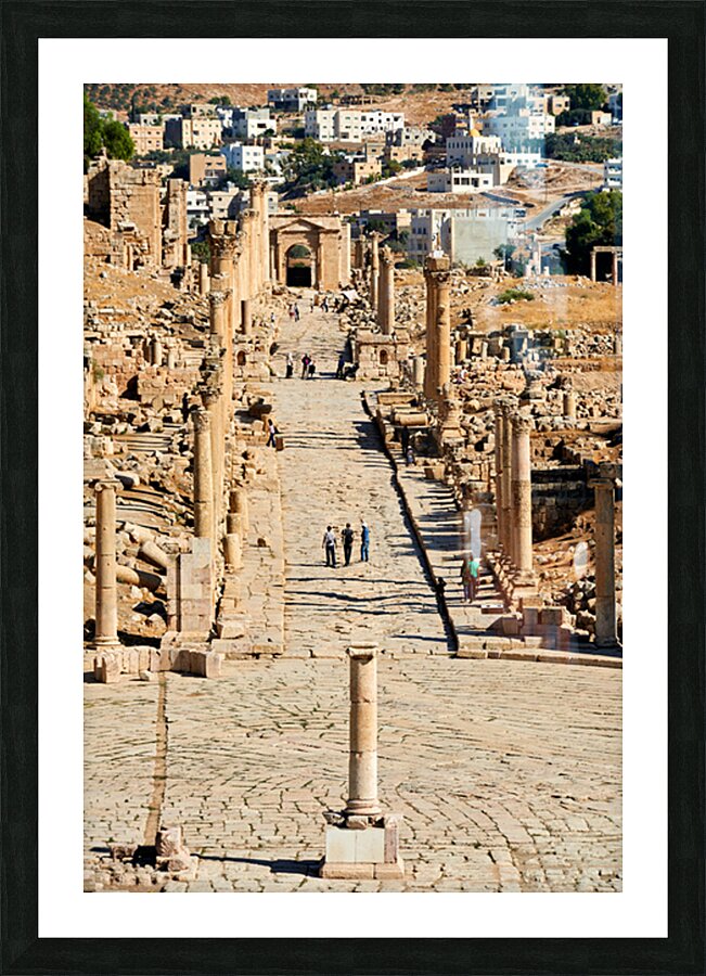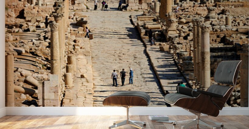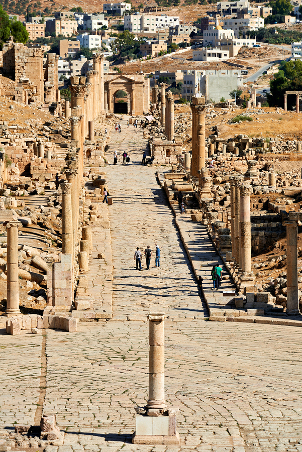 Visitors walk along the ancient cardo maximus and oval forum in Gerasa Jordan surrounded by stone columns and ruins.