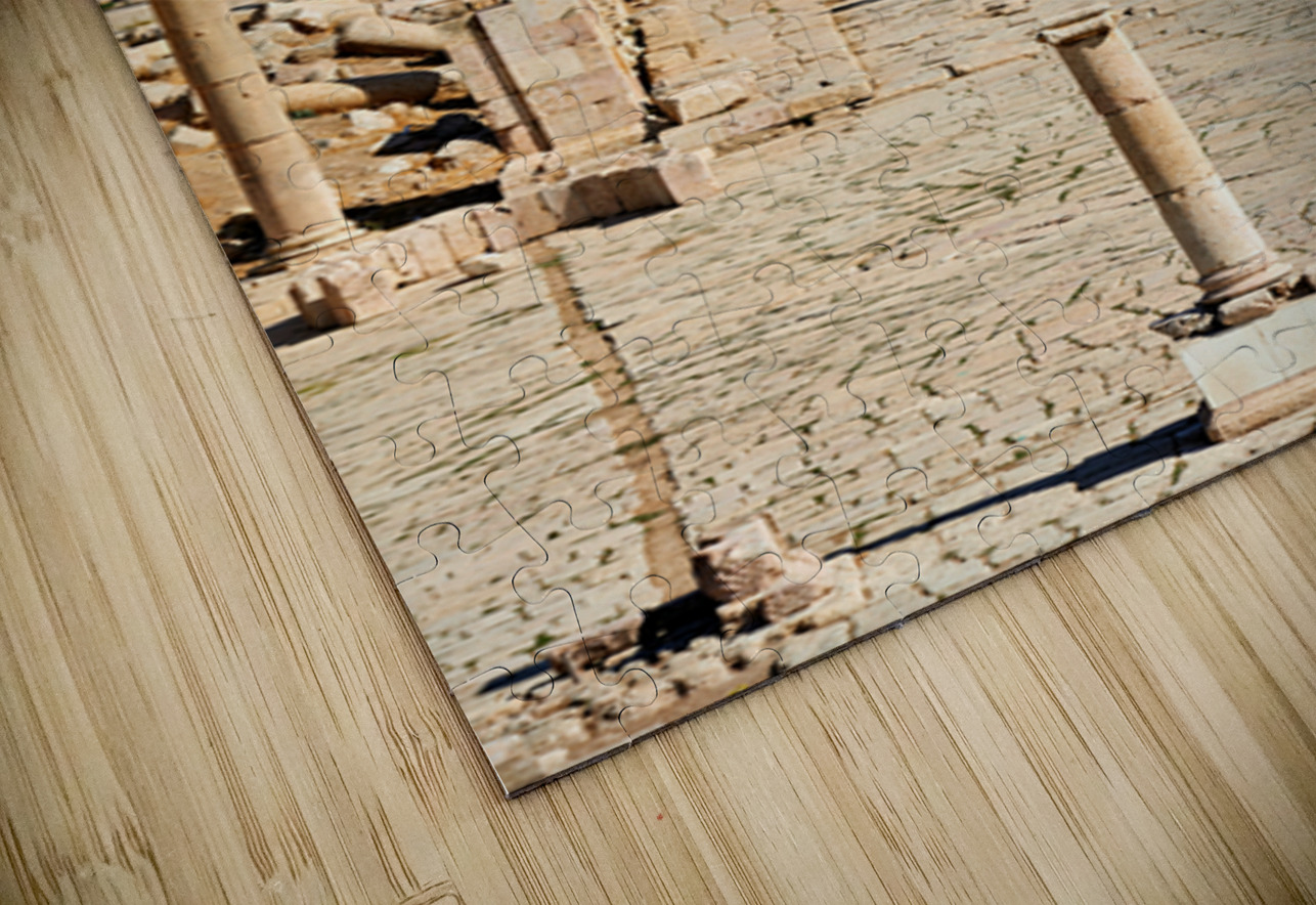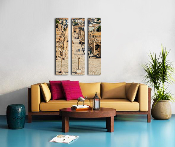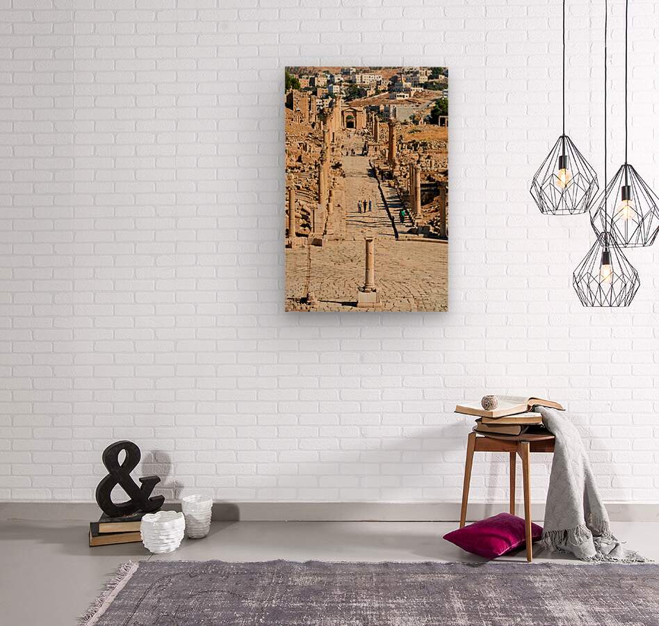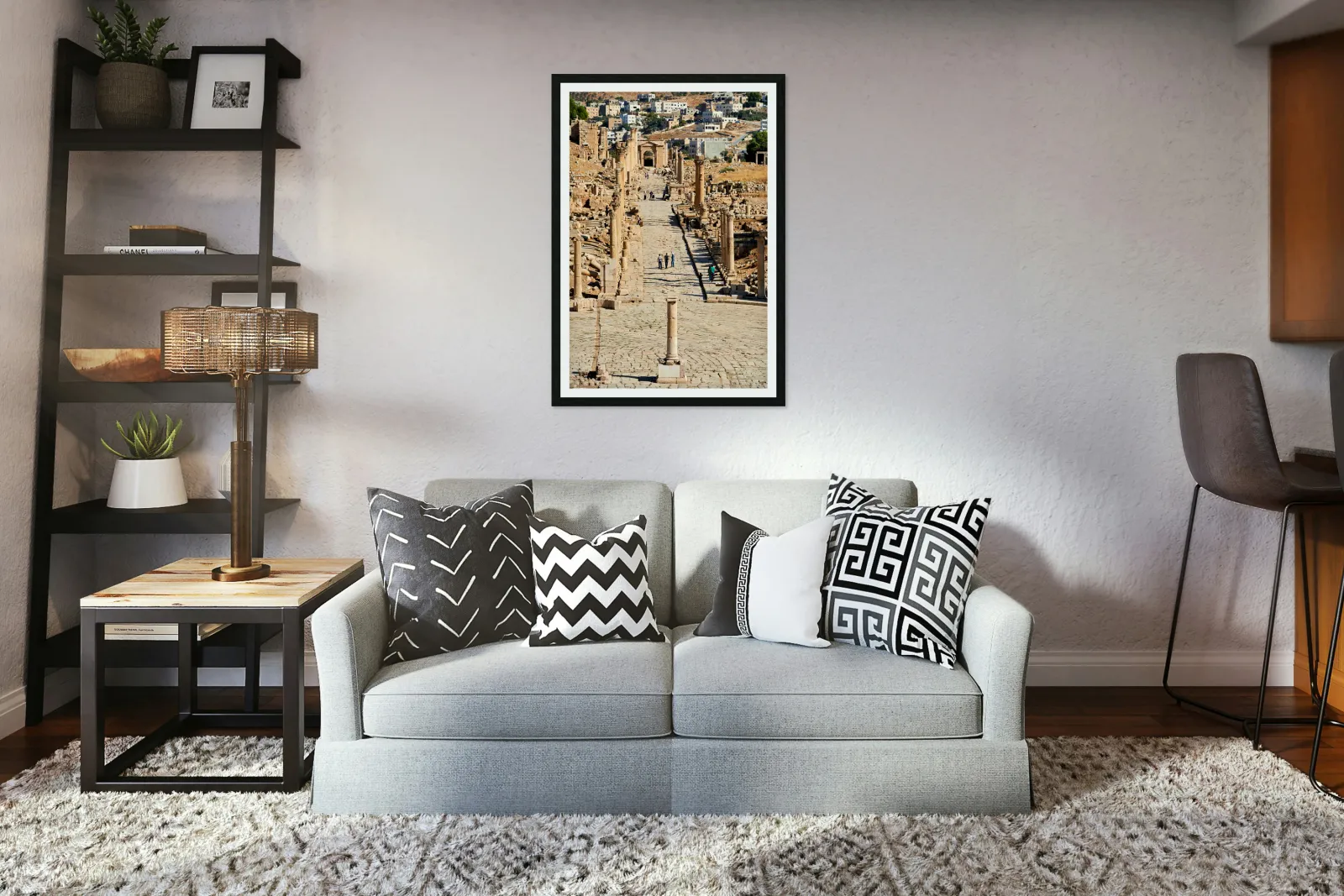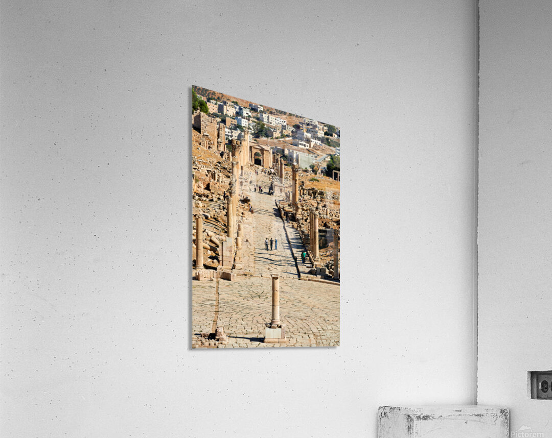 Visitors walk along the ancient cardo maximus and oval forum in Gerasa Jordan surrounded by stone columns and ruins.