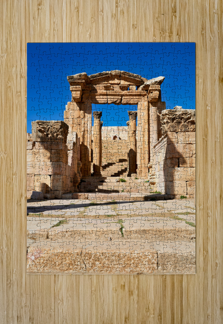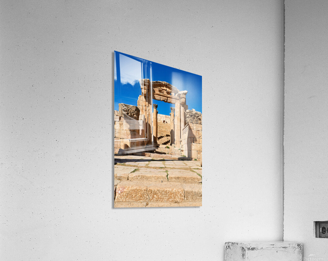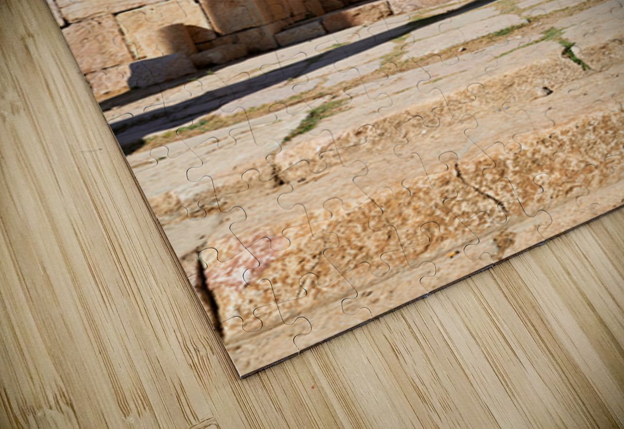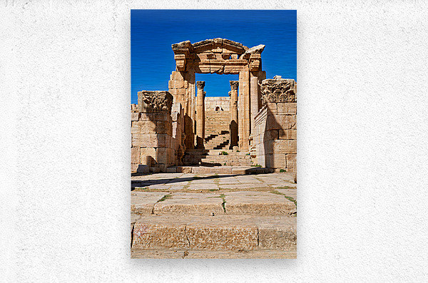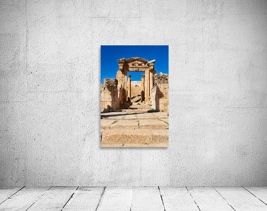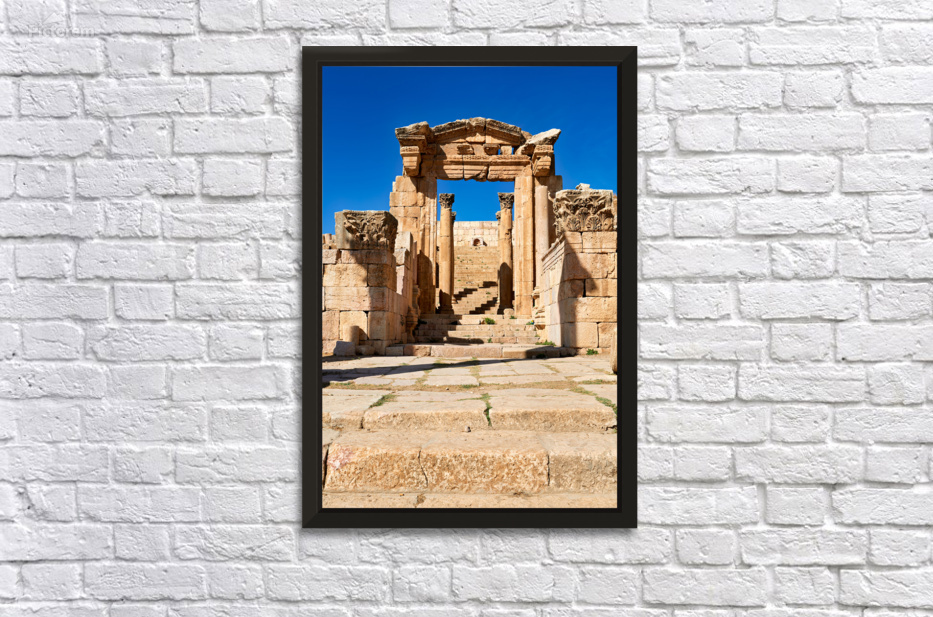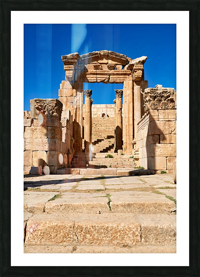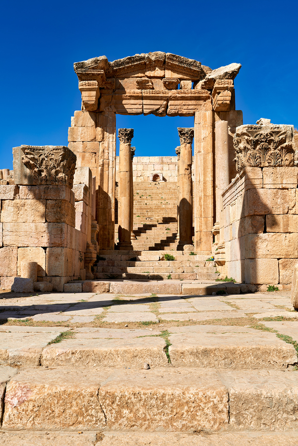Visitors walk through the ancient ruins of Gerasa in Jordan. The stone structures show the history of the Greco-Roman city.
