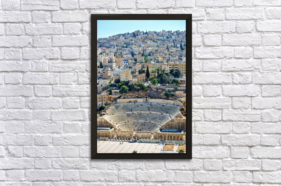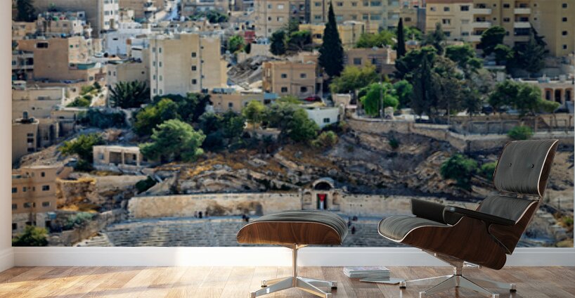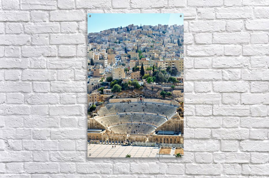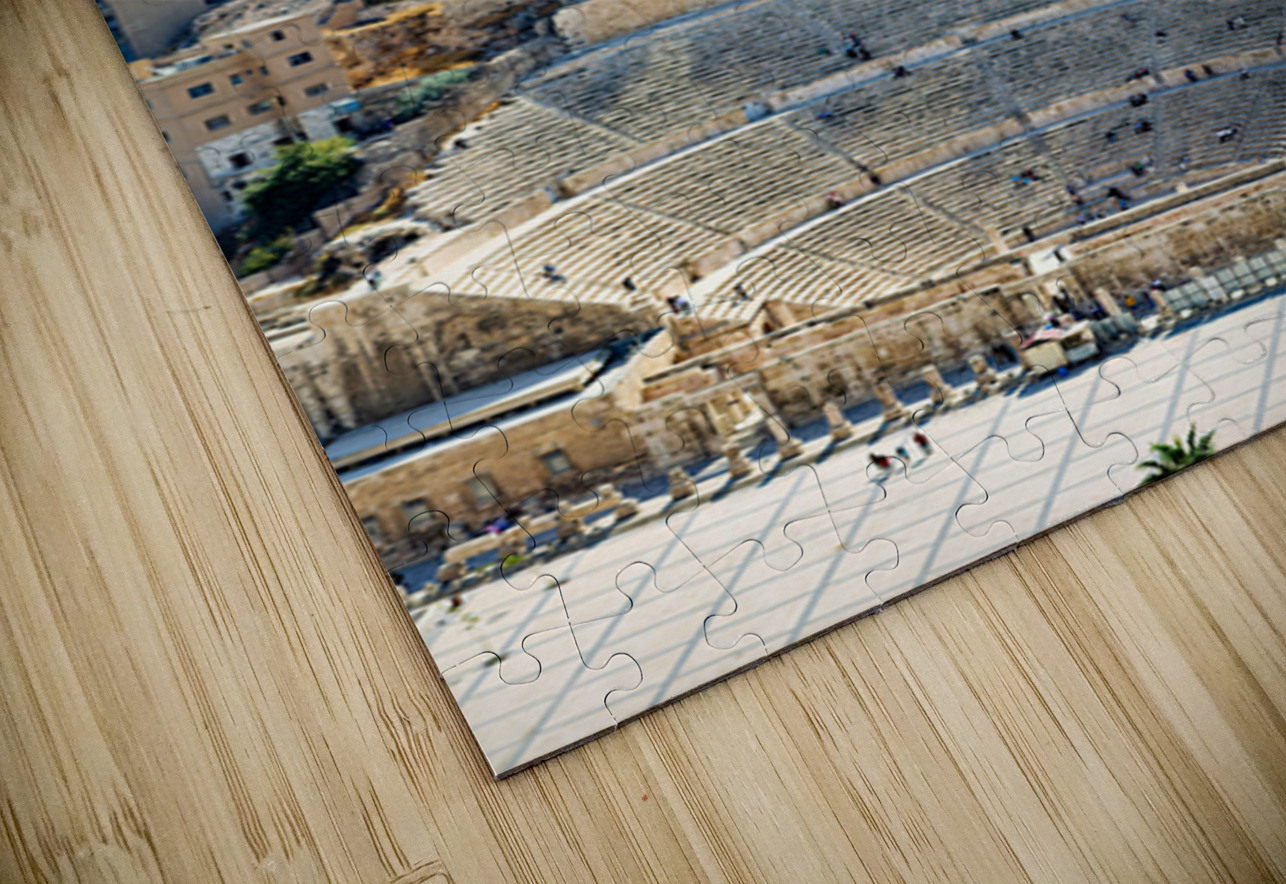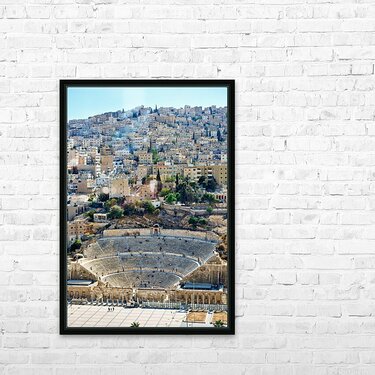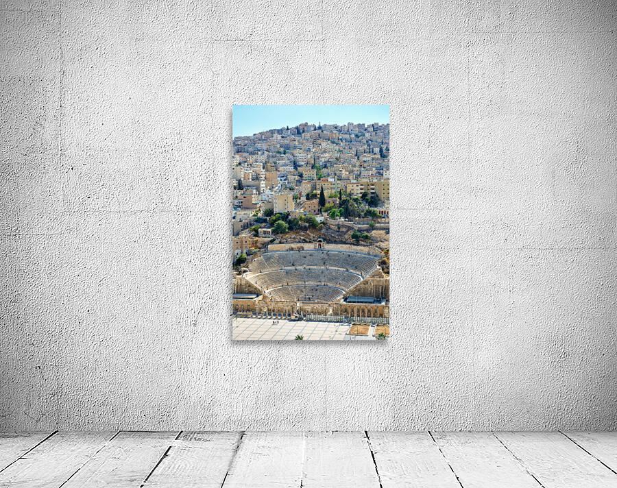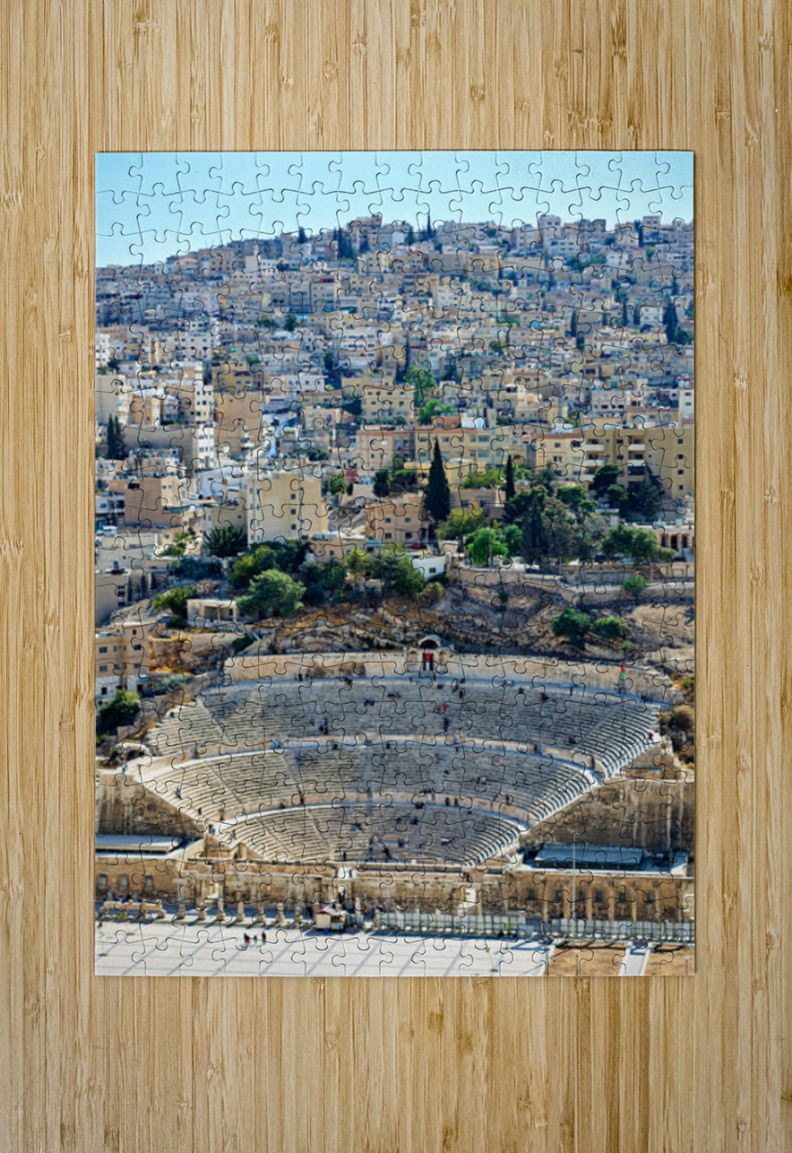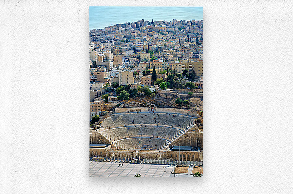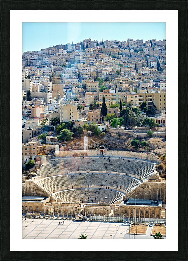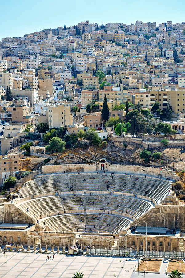 Visitors explore the Roman Theater in Amman Jordan with city buildings in the background on a sunny day.