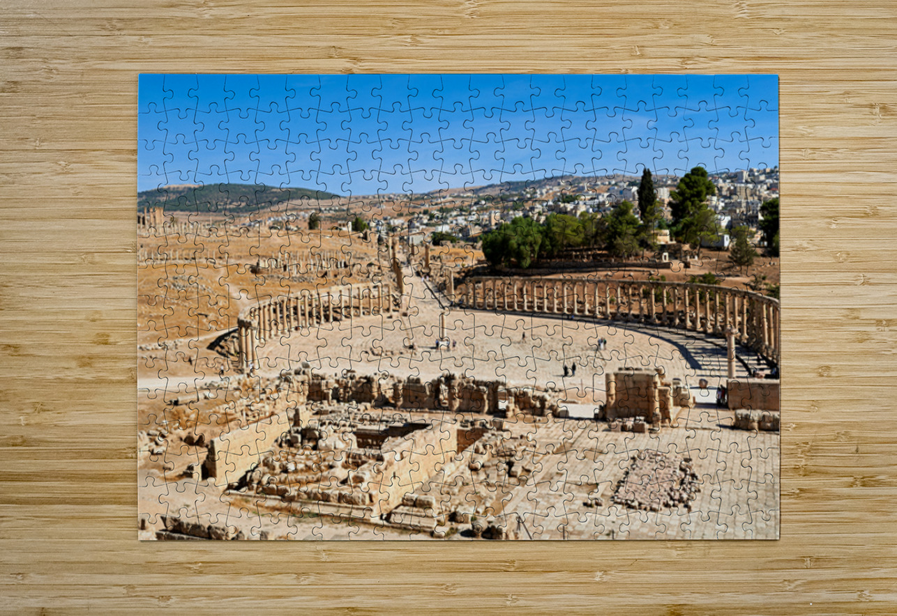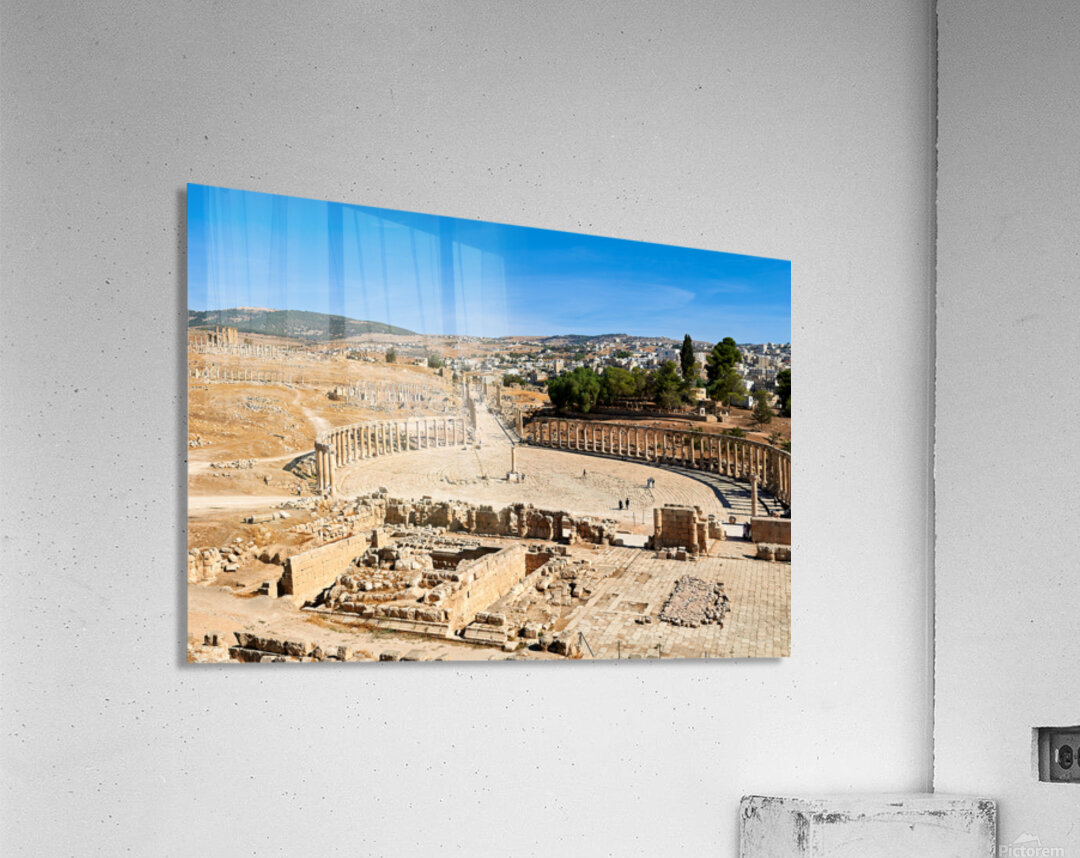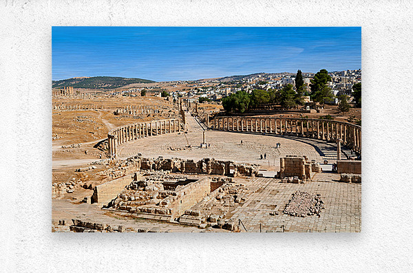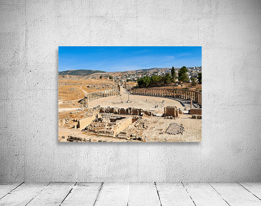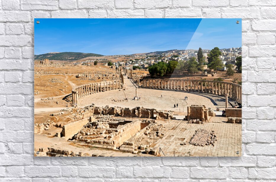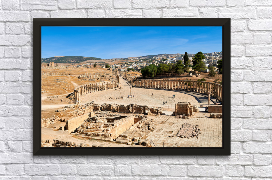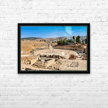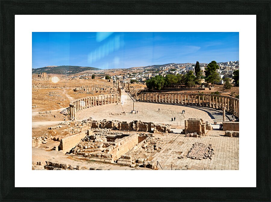 "Exploring the oval forum and cardo maximus in Gerasa" in a framed print.