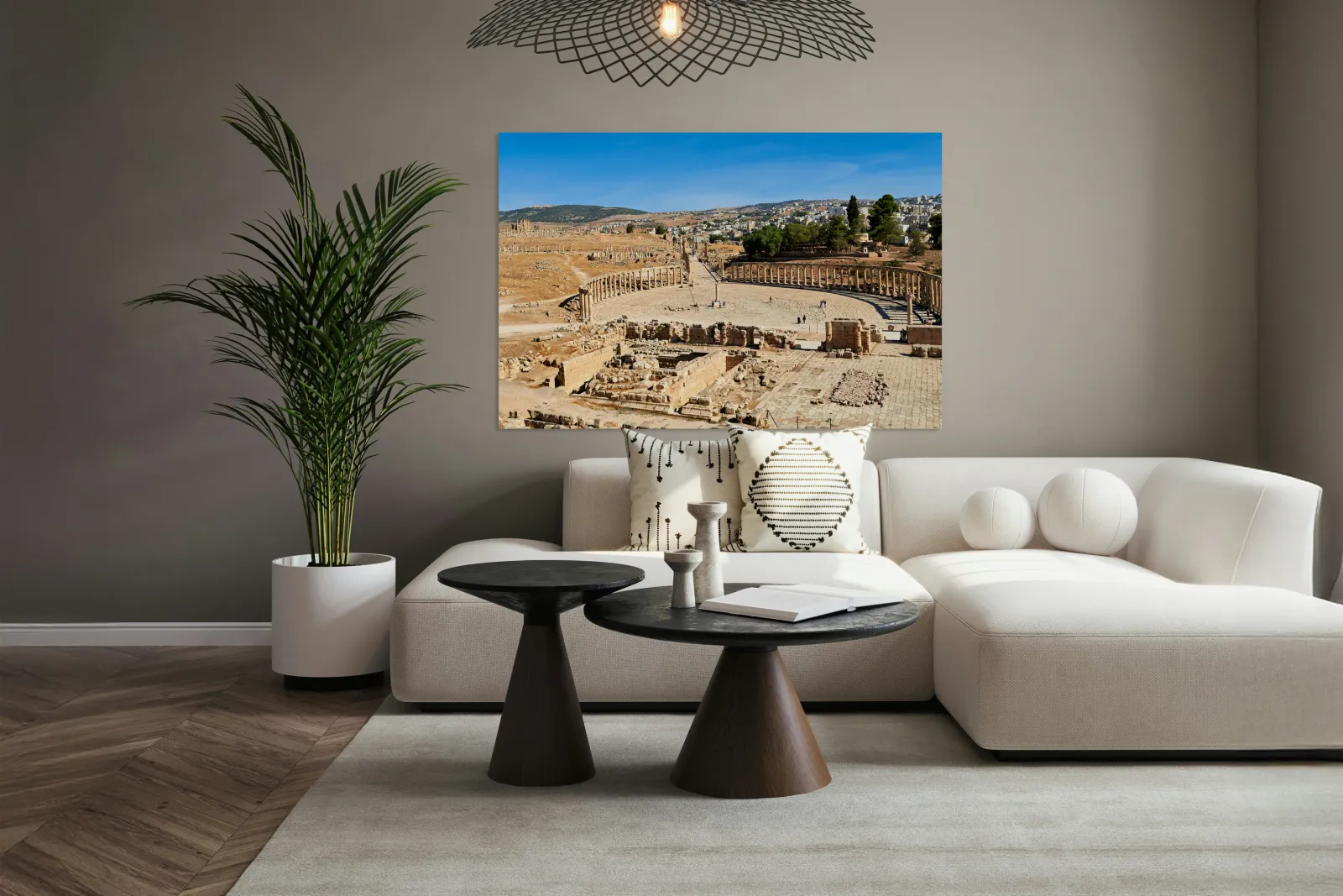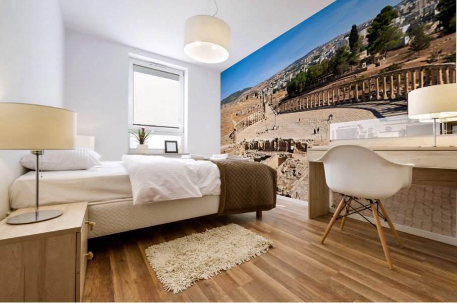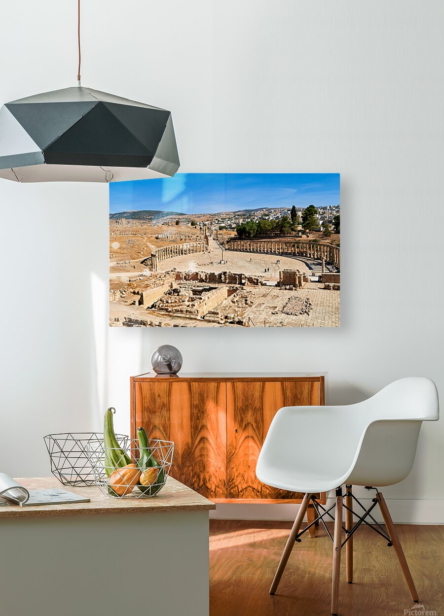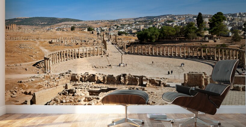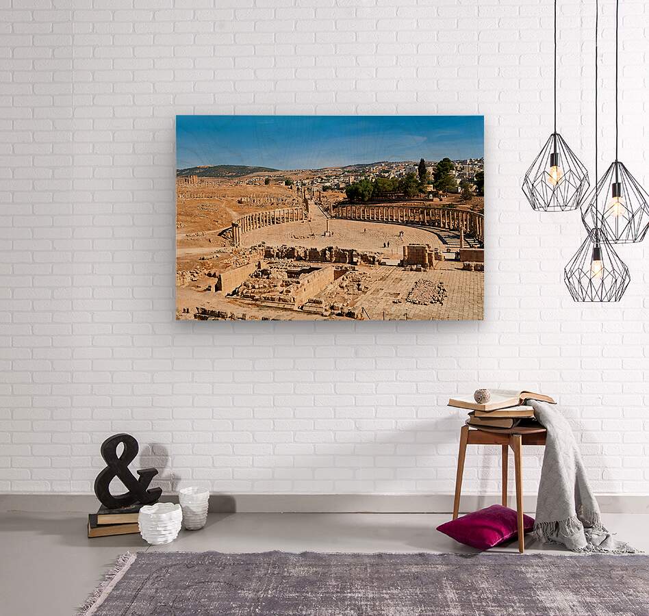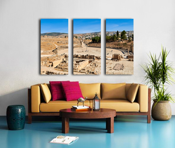 "Exploring the oval forum and cardo maximus in Gerasa" in a framed print.