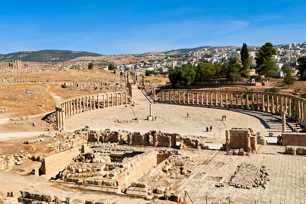 Visitors walk through the ancient oval forum and cardo maximus in Gerasa Jordan. Ruins show the citys rich history and architecture.