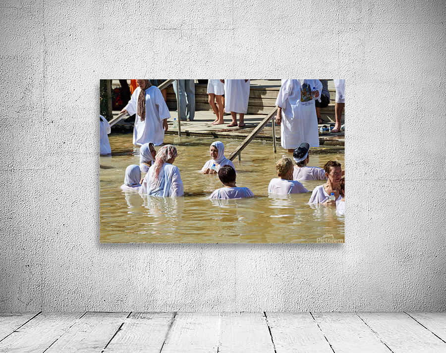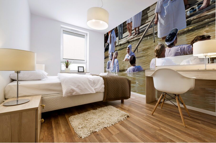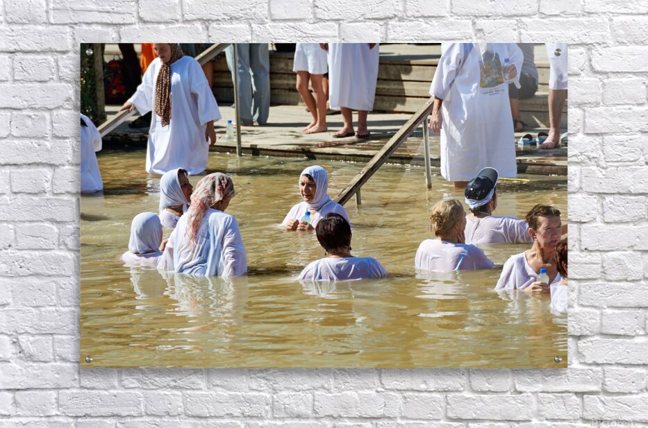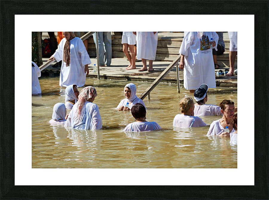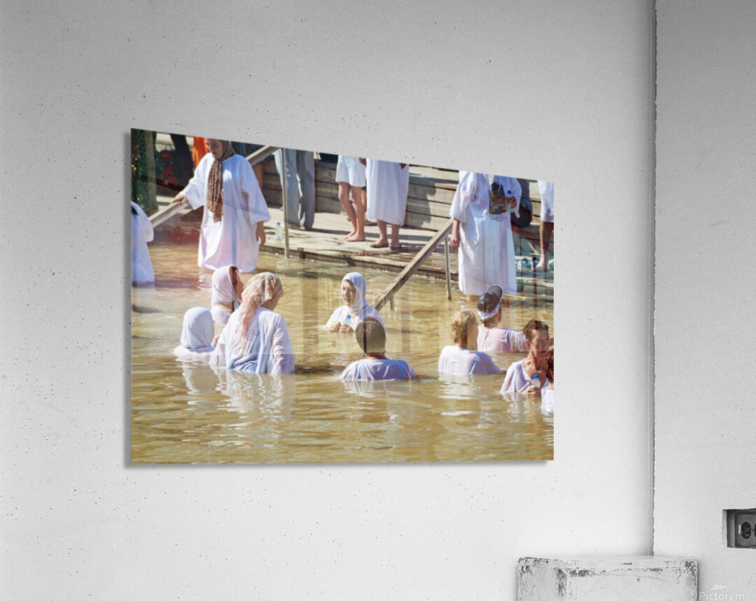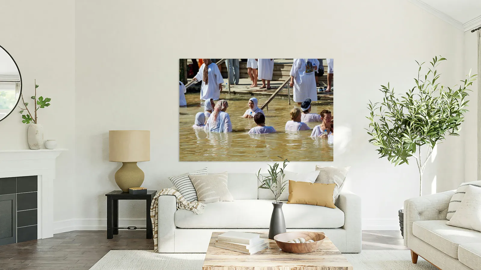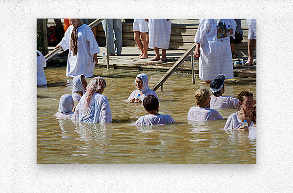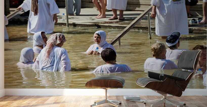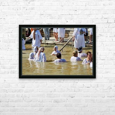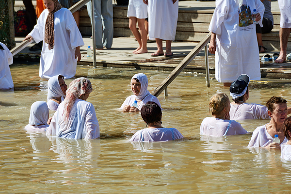 Visitors gather at the Jordan River for baptism. They wear simple white clothing and participate in the religious ceremony by the water.