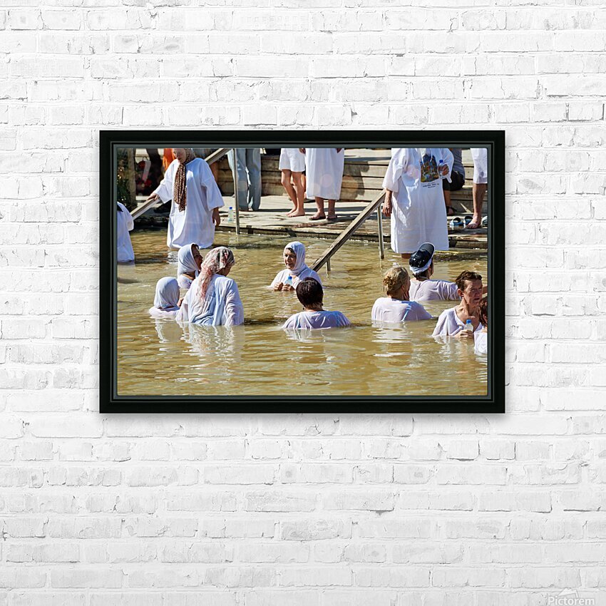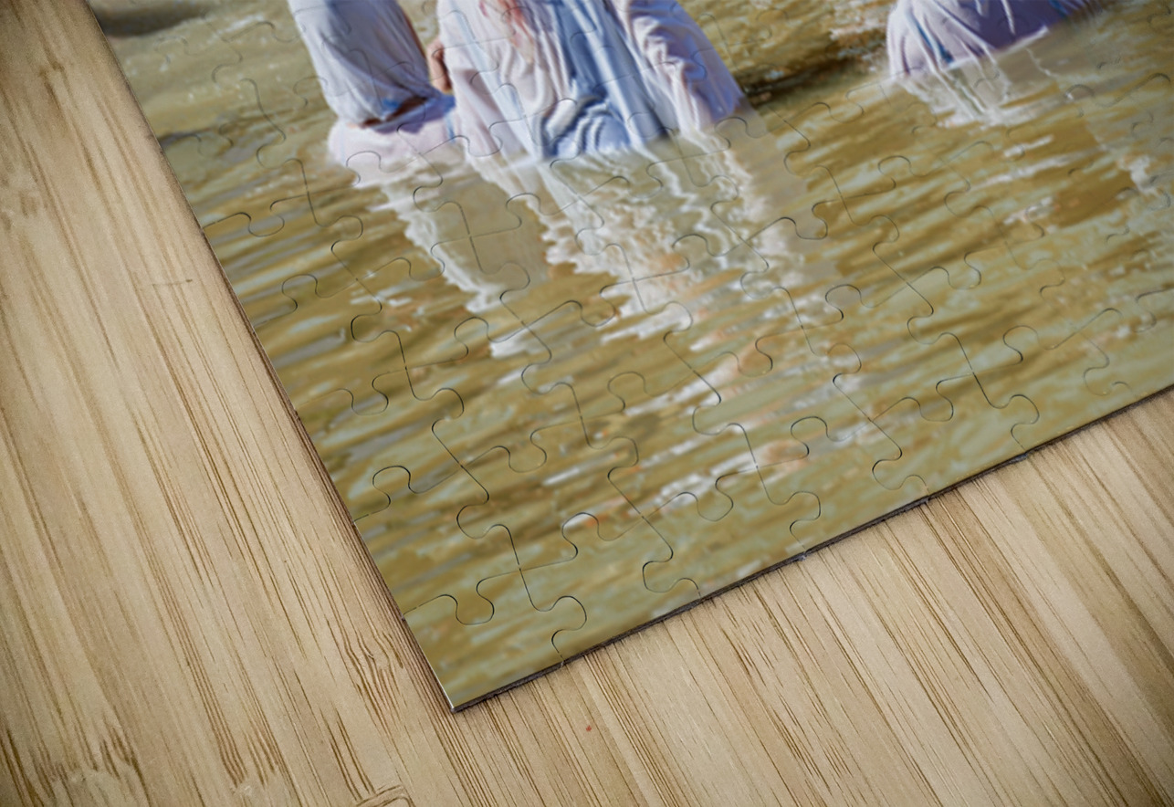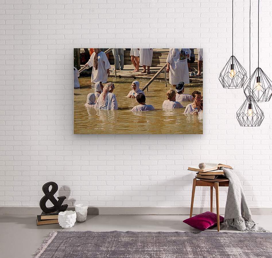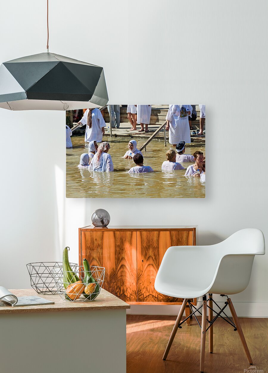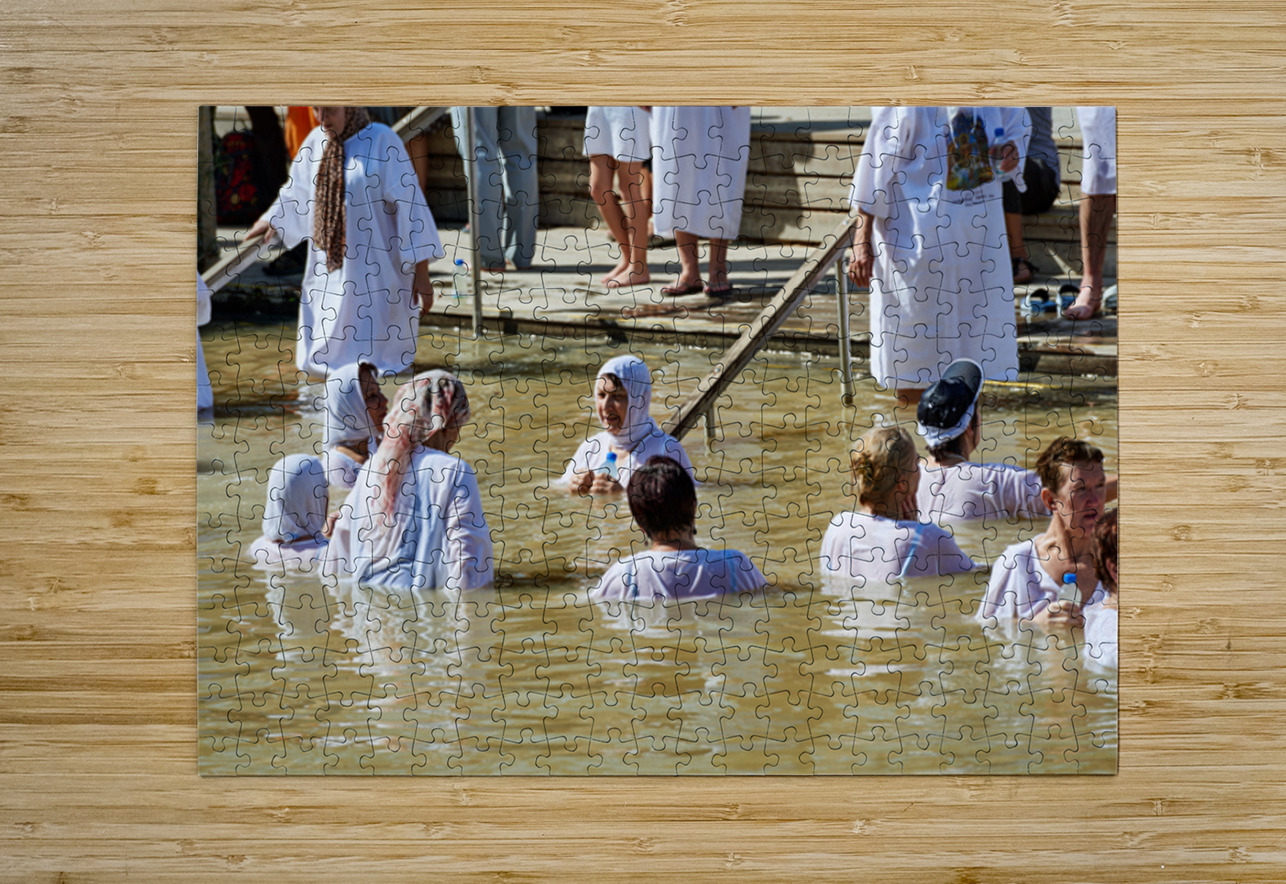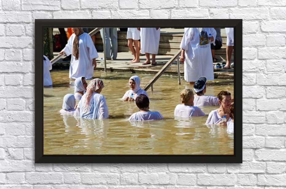 Visitors gather at the Jordan River for baptism. They wear simple white clothing and participate in the religious ceremony by the water.