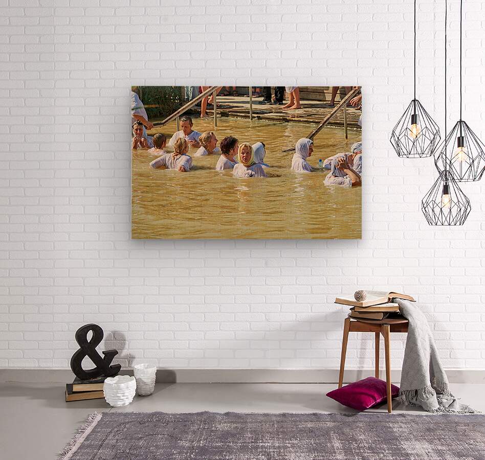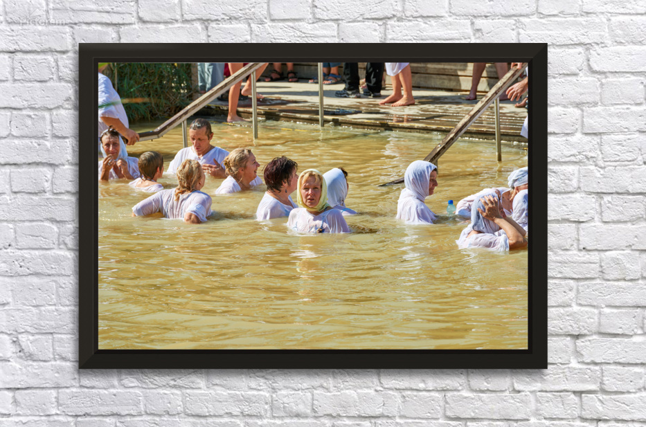 People are being baptized in the Jordan River at the traditional baptism site. Many wear white garments as they enter the water.