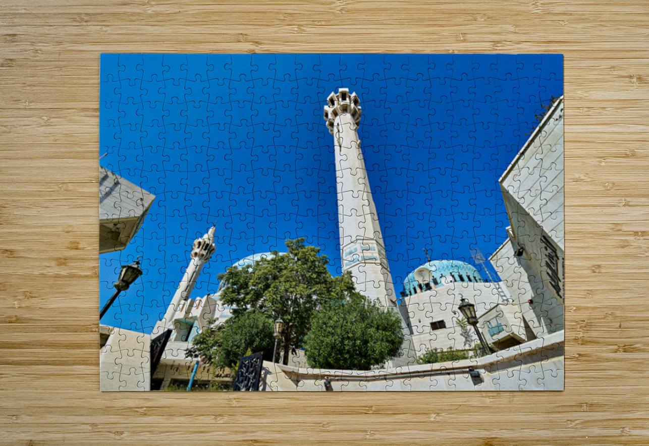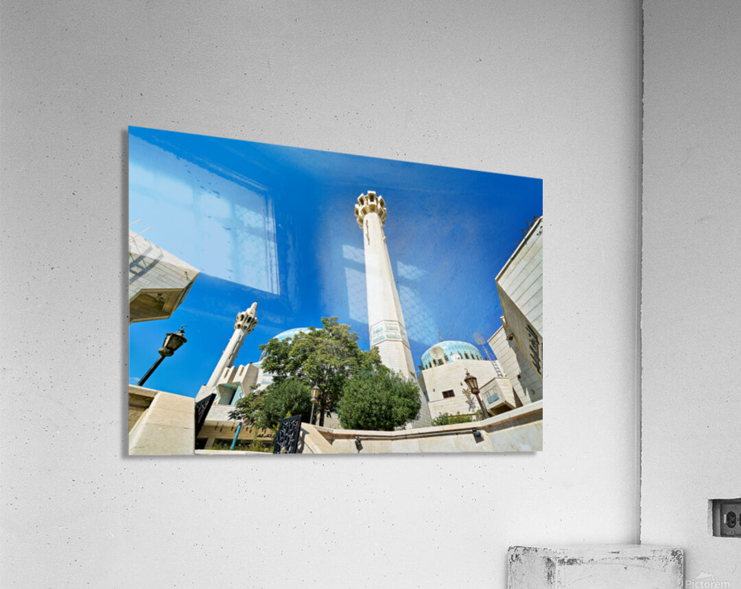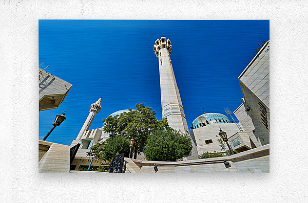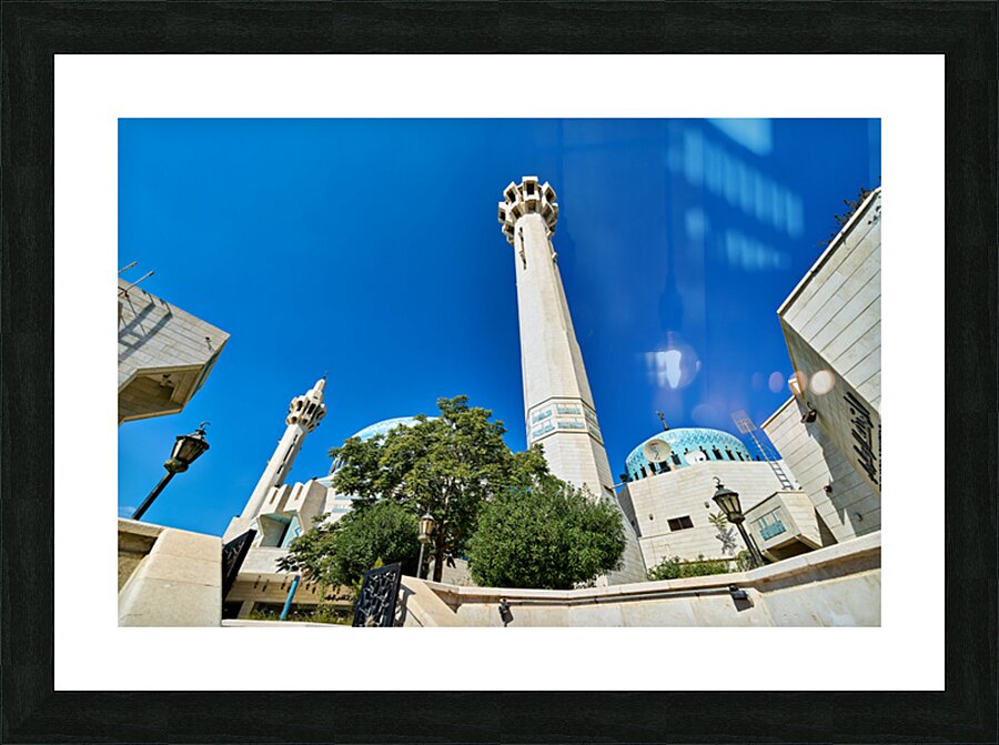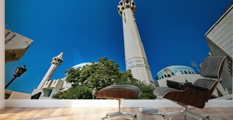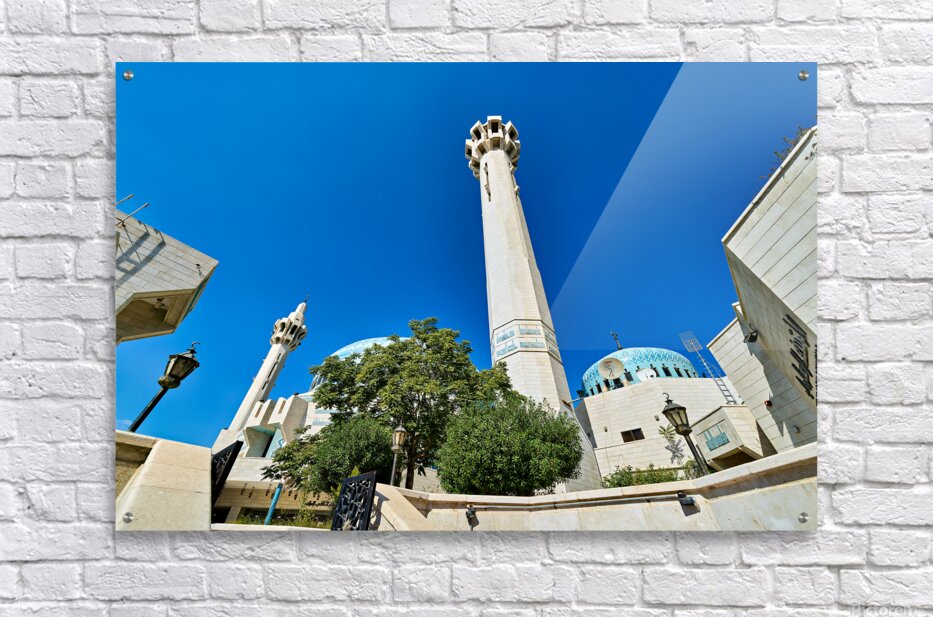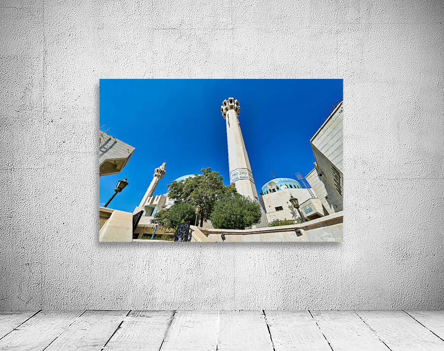 The scene shows King Abdullah Mosque in Amman Jordan with tall minarets and shining domes against a bright blue sky.