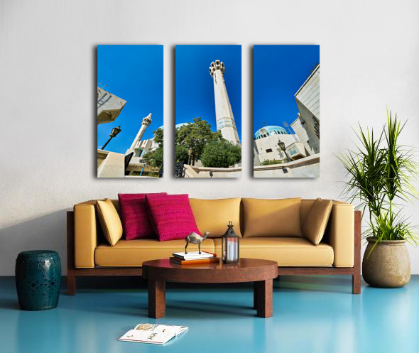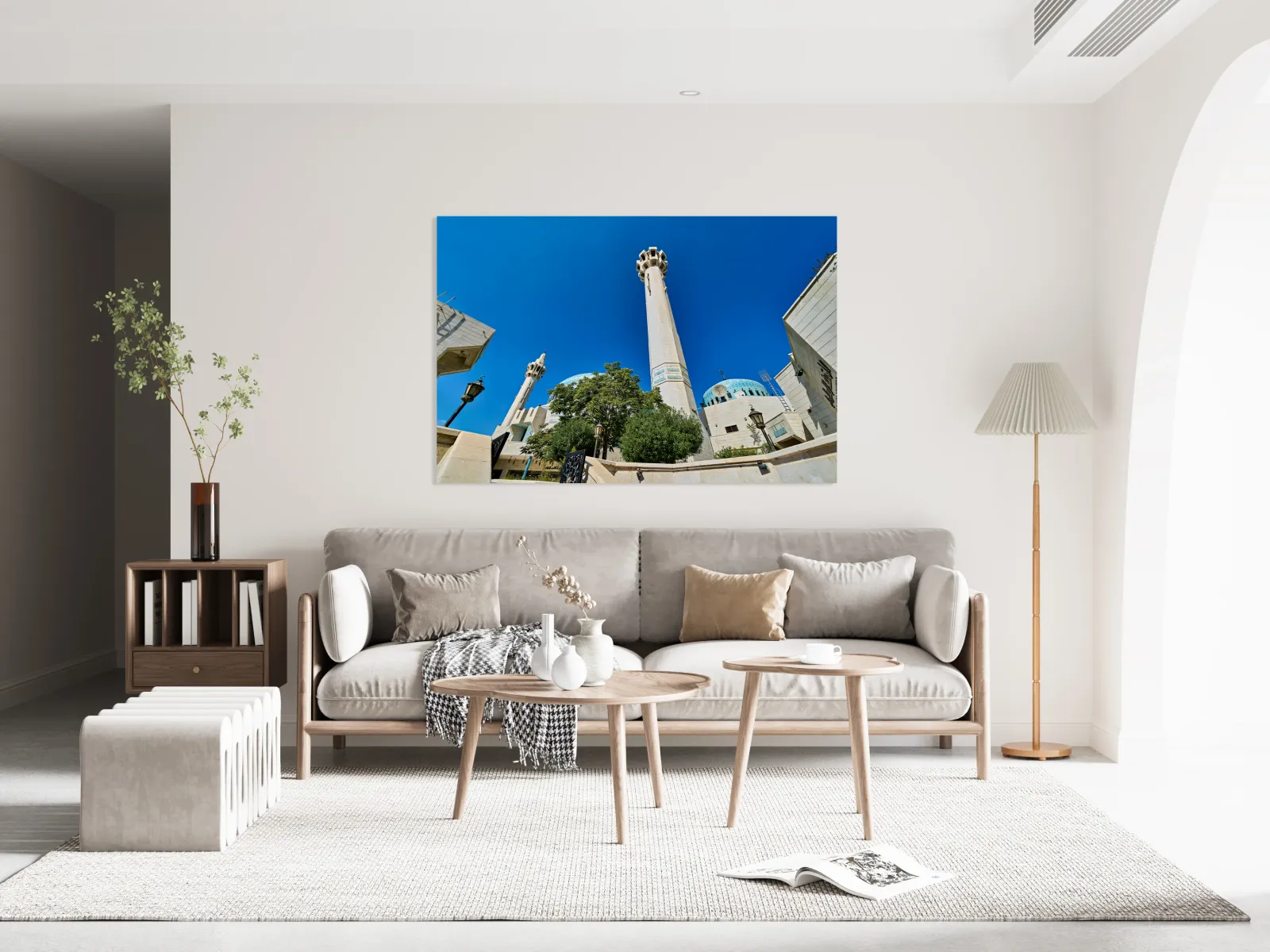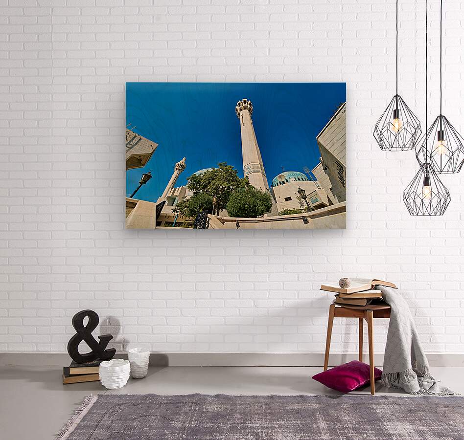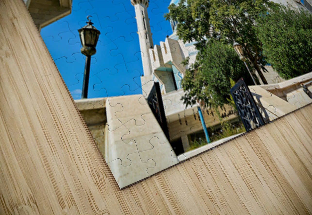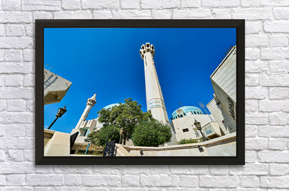 The scene shows King Abdullah Mosque in Amman Jordan with tall minarets and shining domes against a bright blue sky.