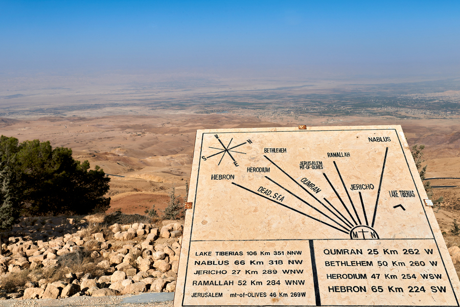This view from Mount Nebo shows signs pointing to various locations in Jordan.