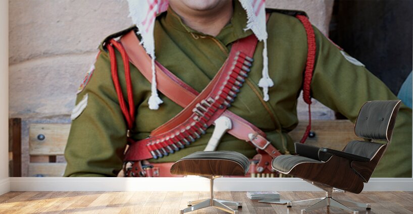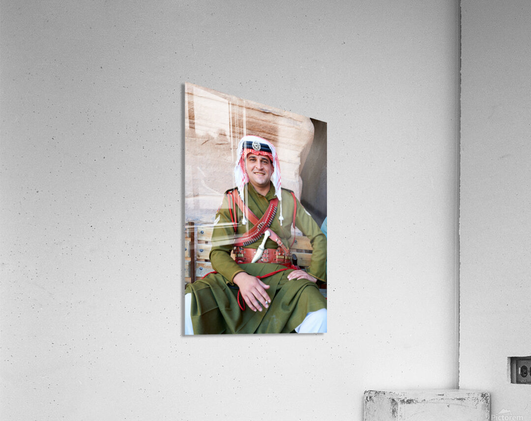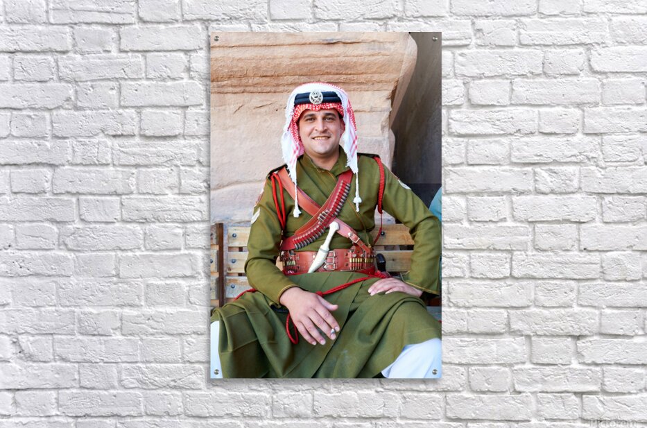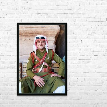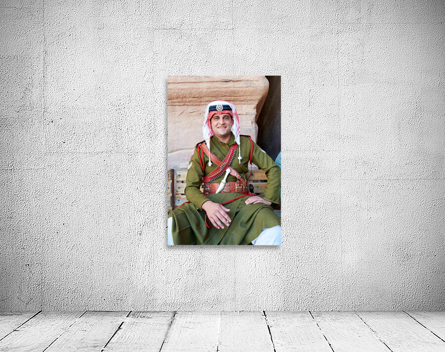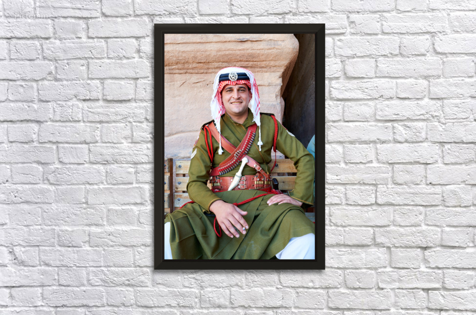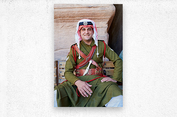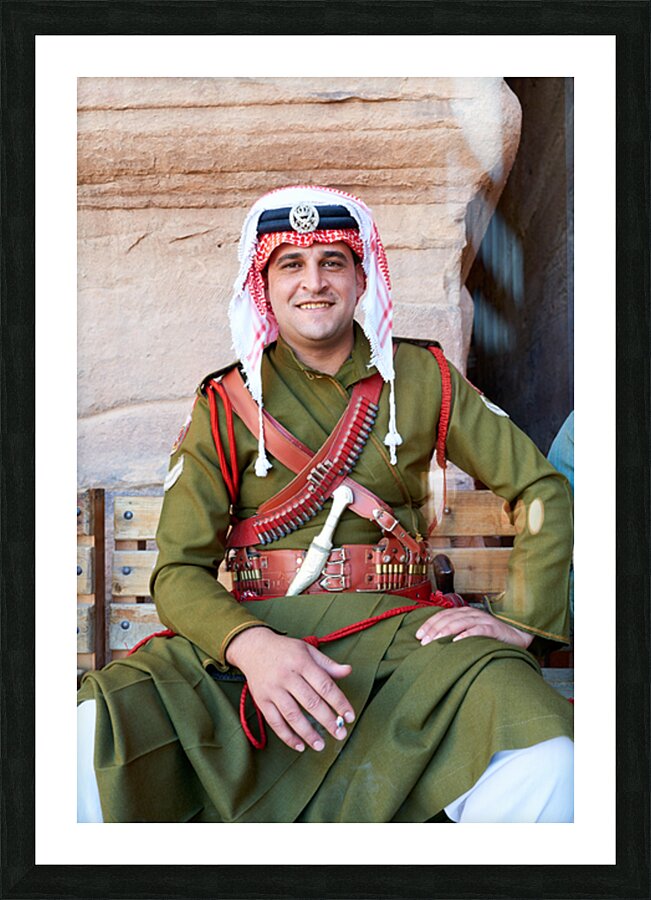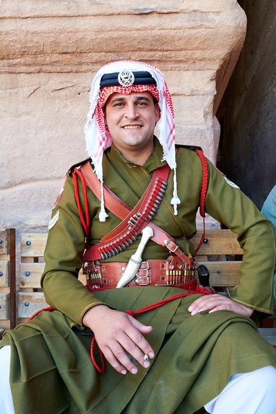 A soldier sits with a smile at the Petra archaeological site in Jordan. The soldier wears a green uniform and traditional headdress.