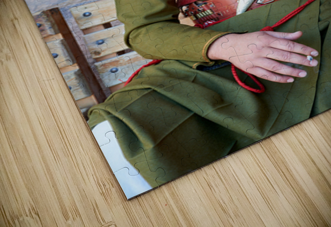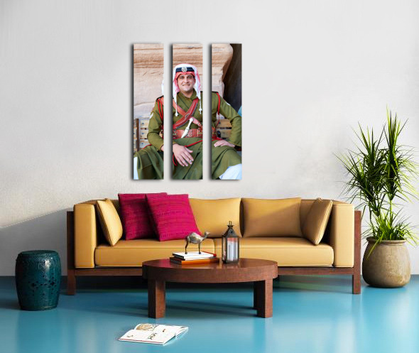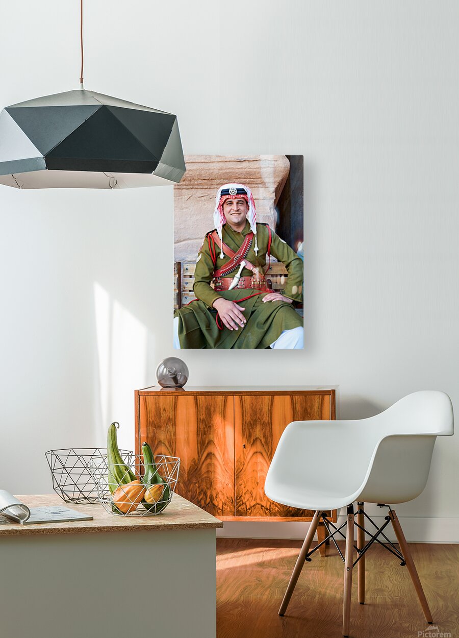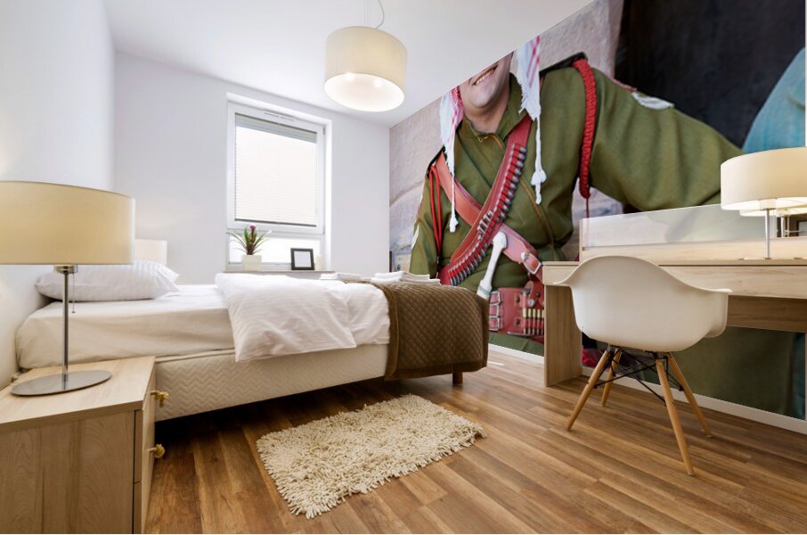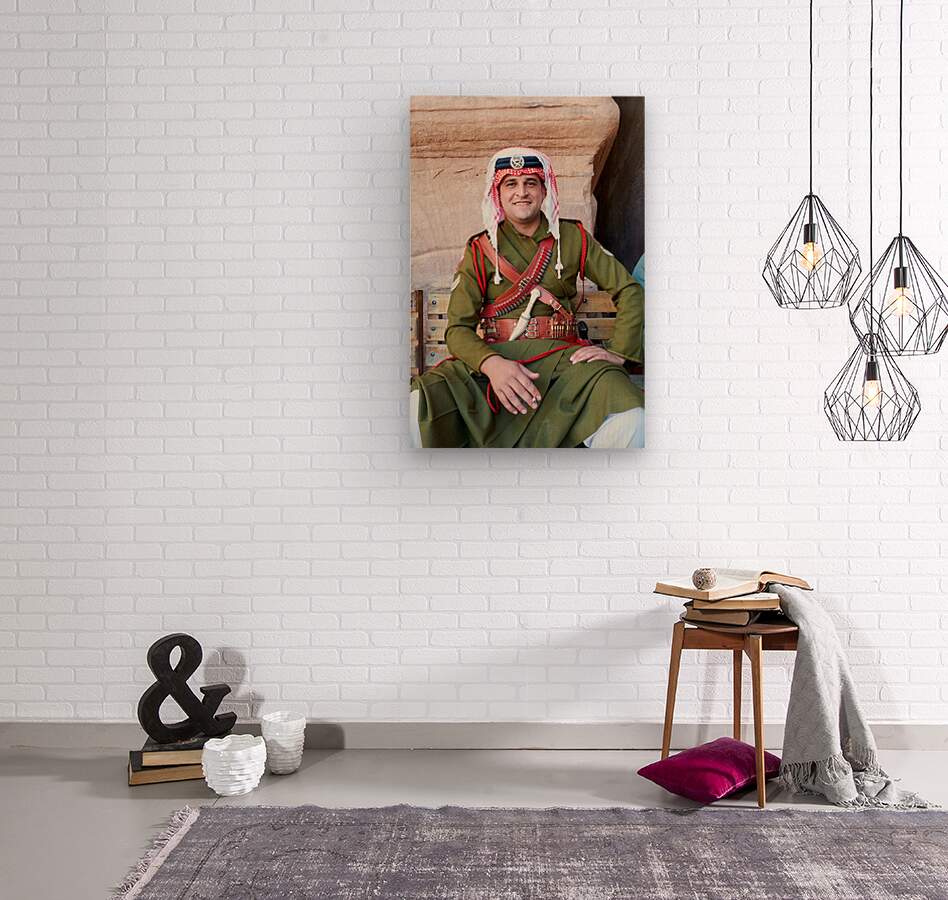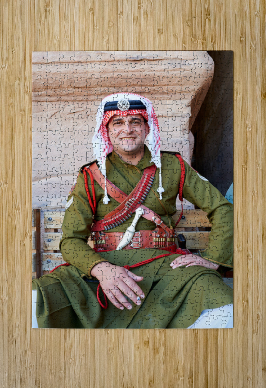 A soldier sits with a smile at the Petra archaeological site in Jordan. The soldier wears a green uniform and traditional headdress.