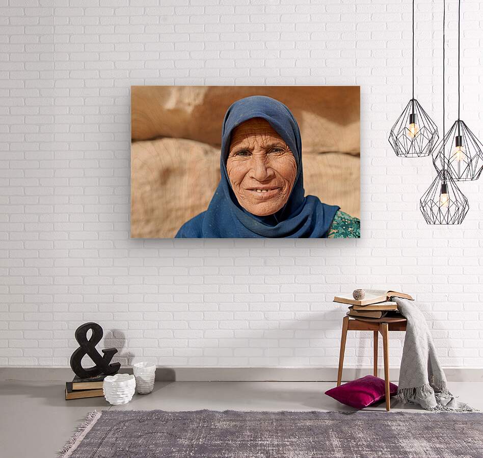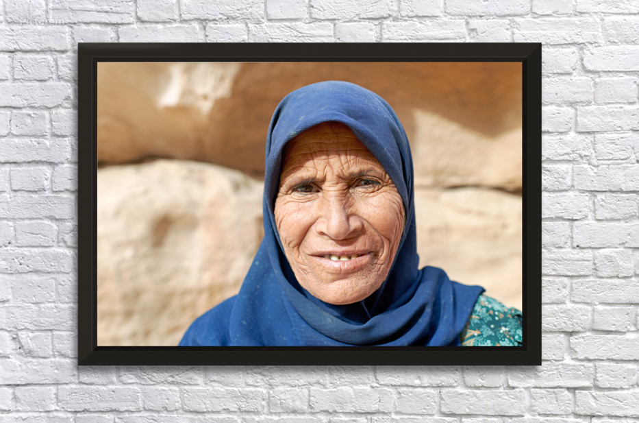 An old woman stands in front of the stone walls of Little Petra in Wadi Musa. She wears a blue scarf and smiles softly.
