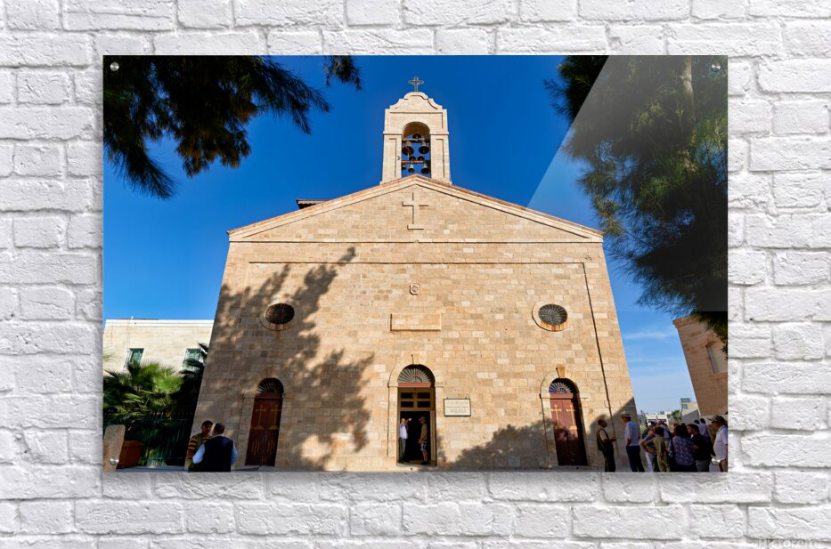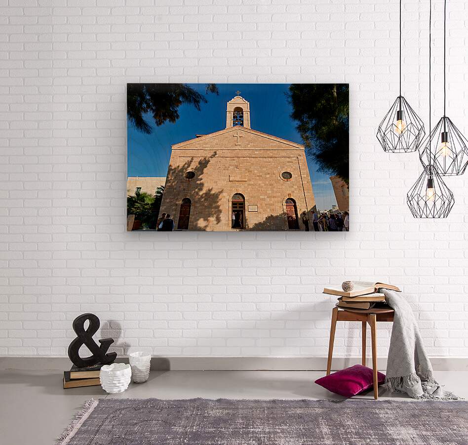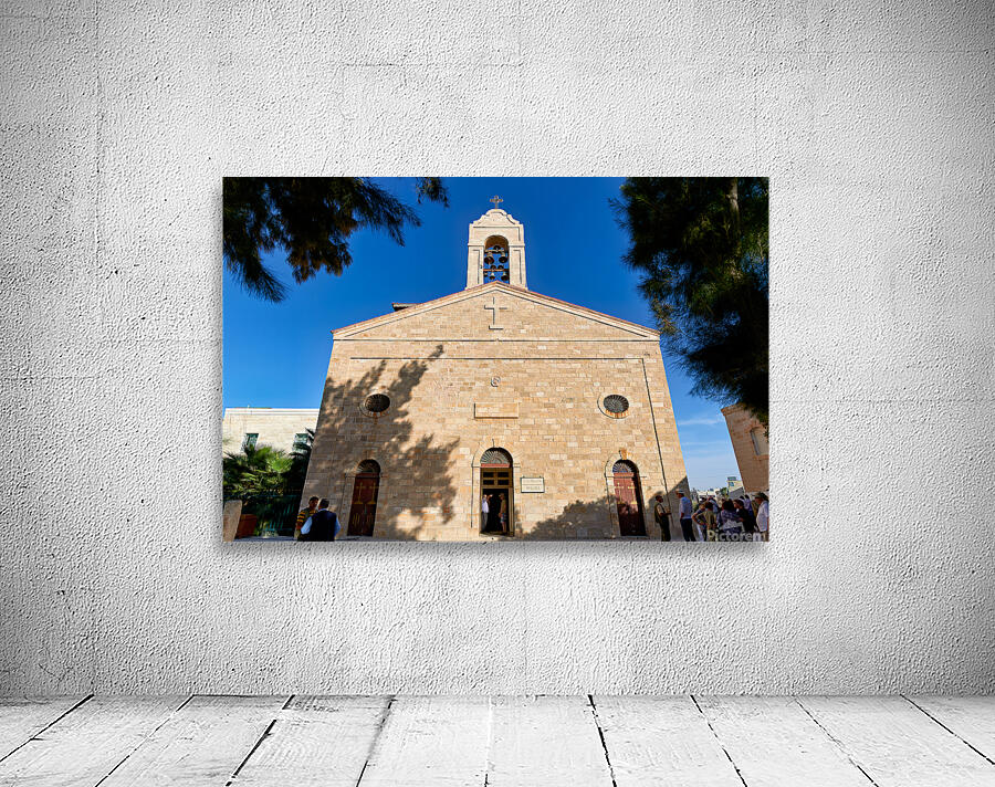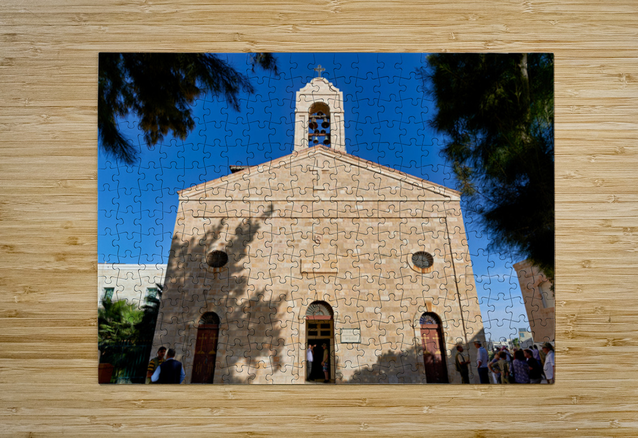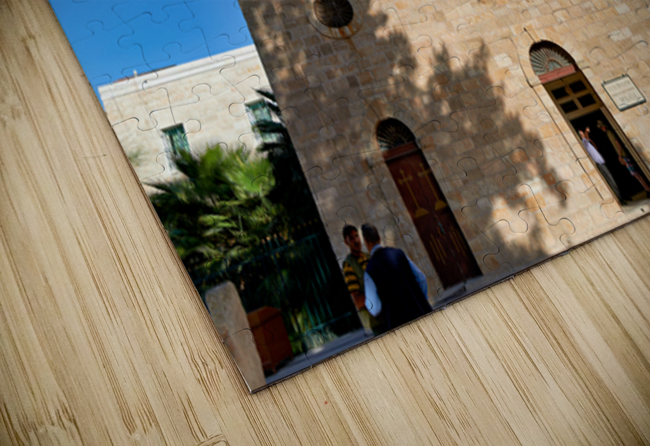 People gather outside the Greek Orthodox Basilica of Saint George in Madaba Jordan. The church is known for its historic map.
