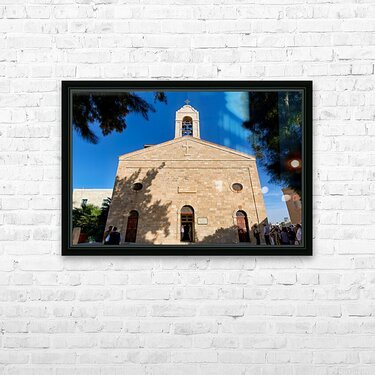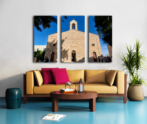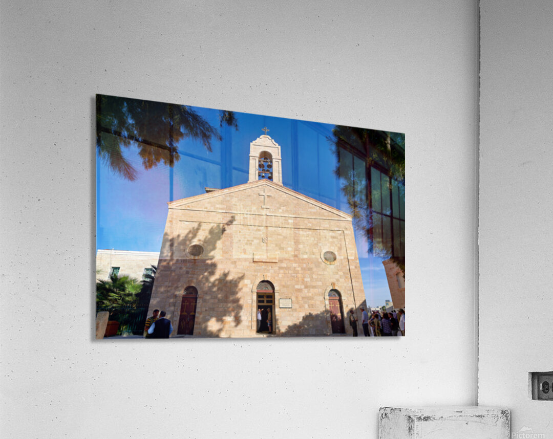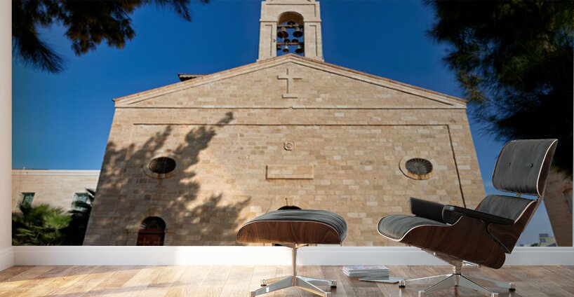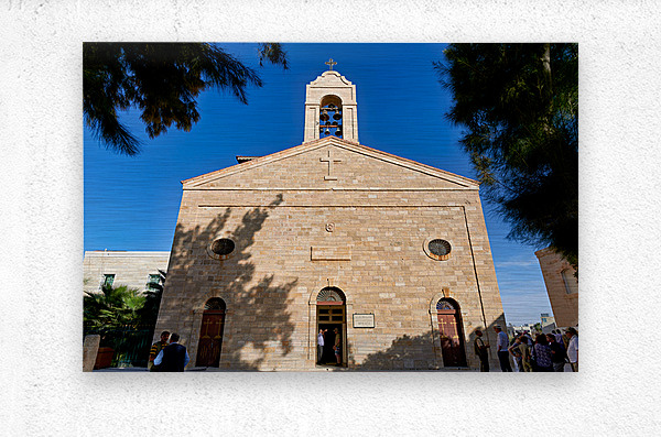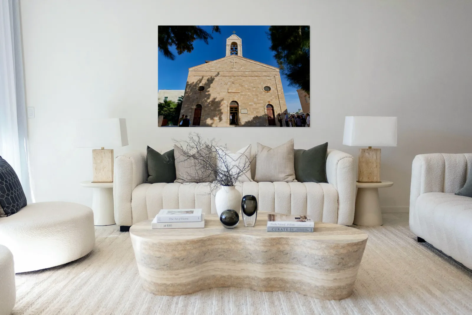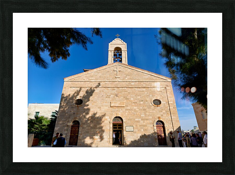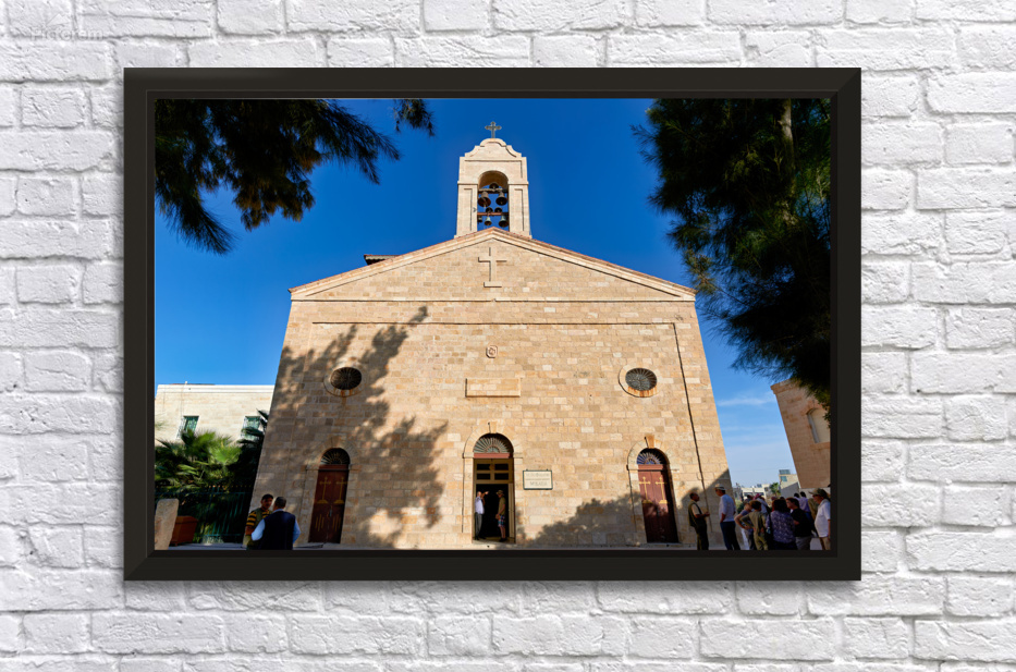 People gather outside the Greek Orthodox Basilica of Saint George in Madaba Jordan. The church is known for its historic map.