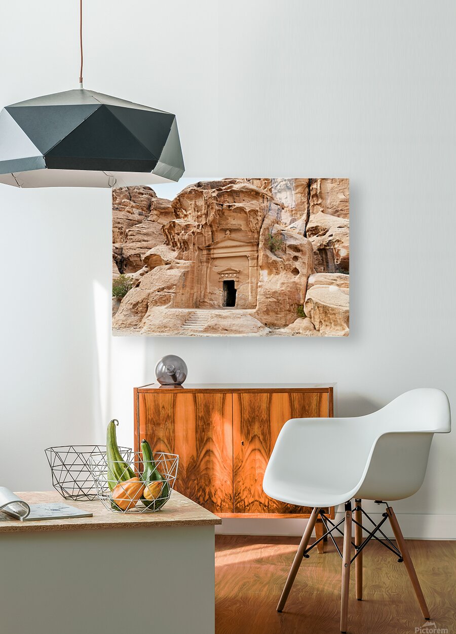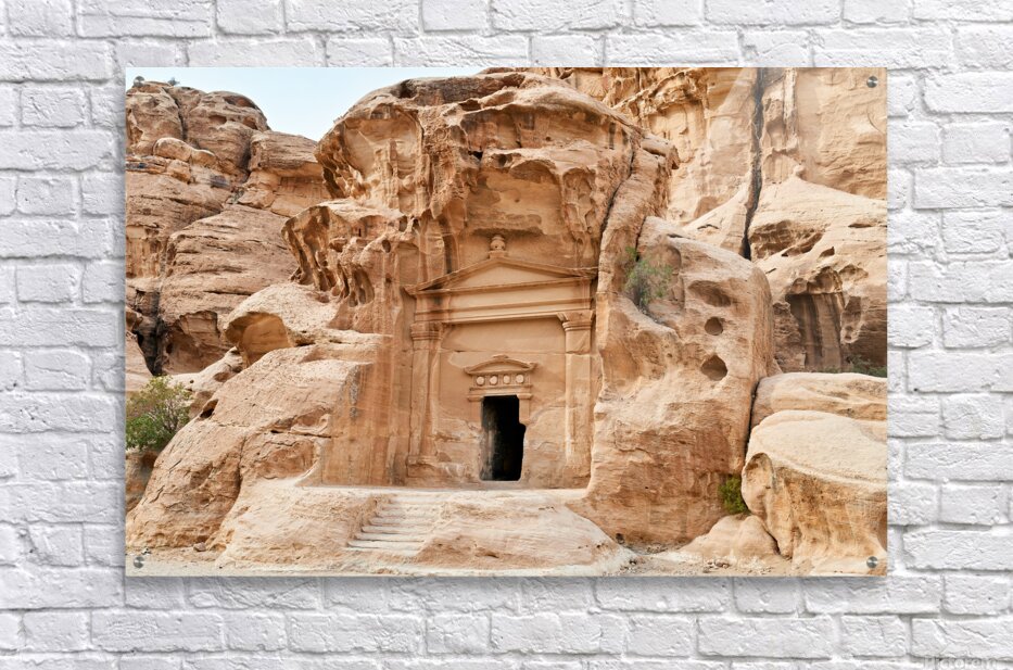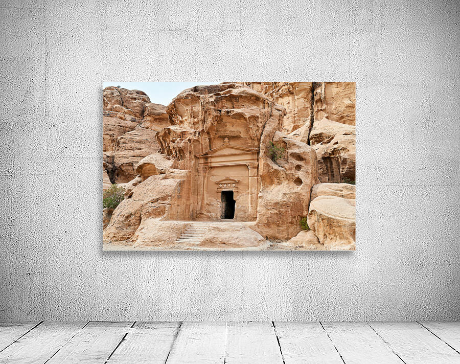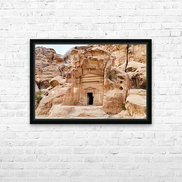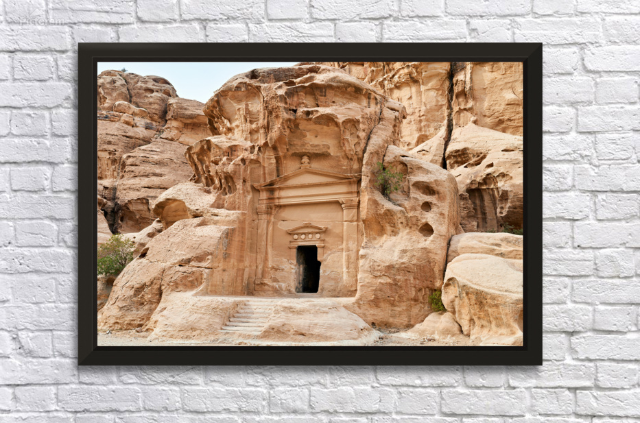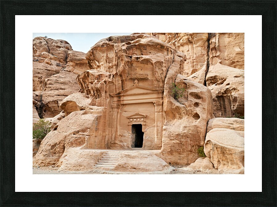 "Exploring Little Petra archaeological site in Wadi Musa Jordan" in a framed print.