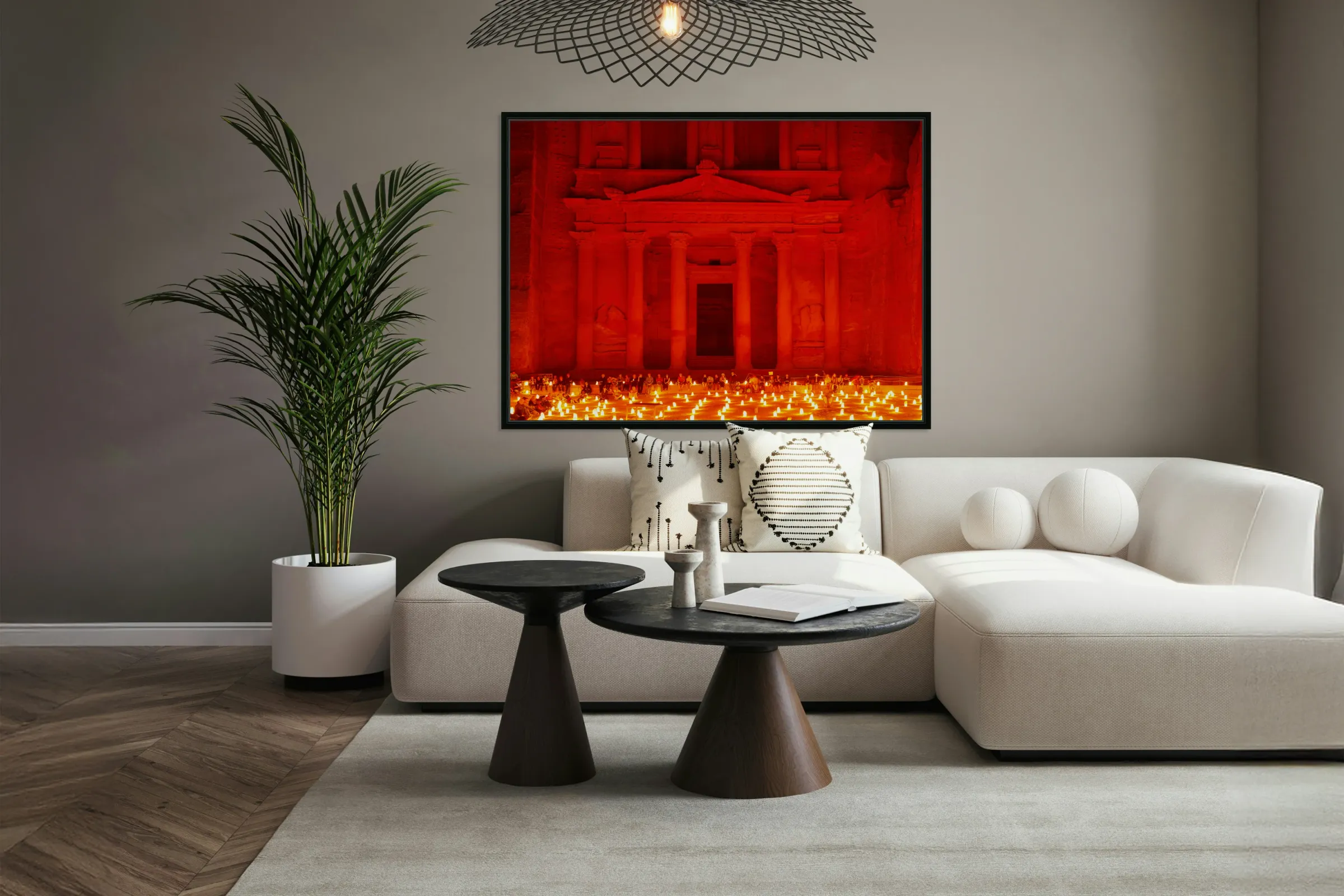 Visit to Petra at night with the Treasury lit by candles Frame print