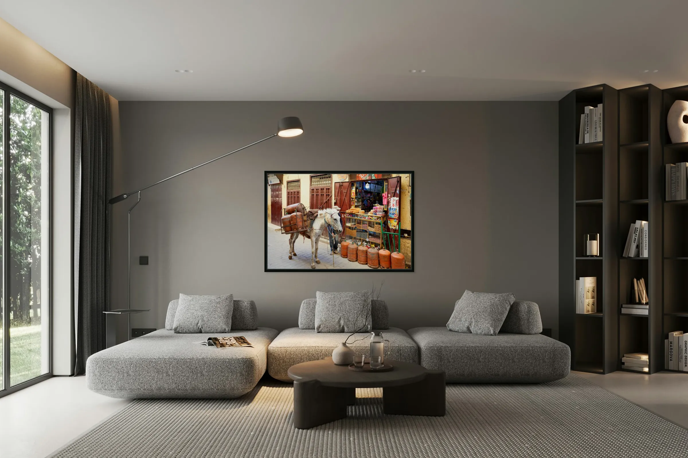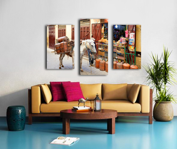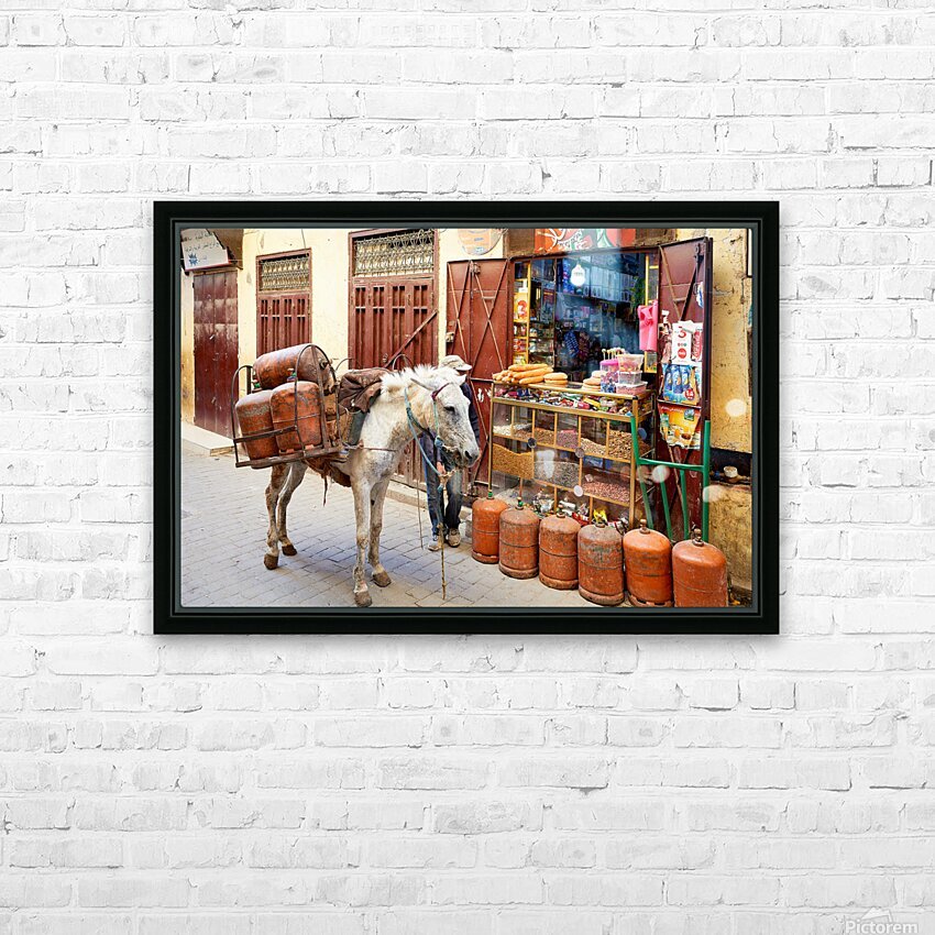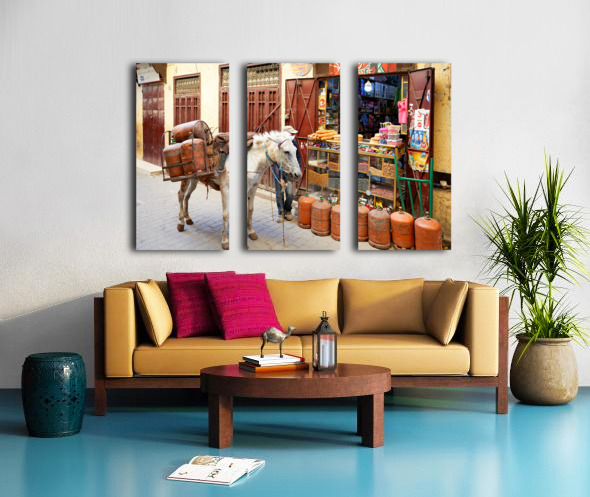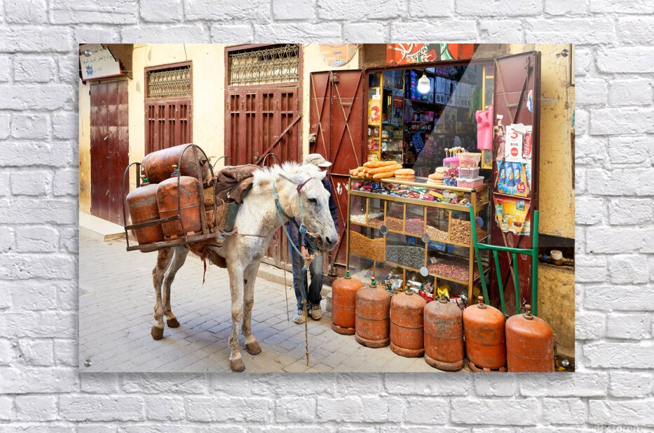 Get this artwork "Donkey carrying gas cylinders through Fez Medina streets" in a framed print.