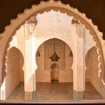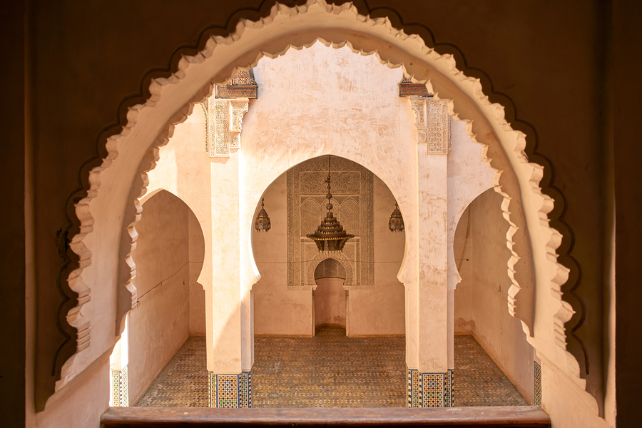 Visitors can see the detailed design of arches and the courtyard of Al Attarine Madrasa in Fez Morocco during sunlight hours.