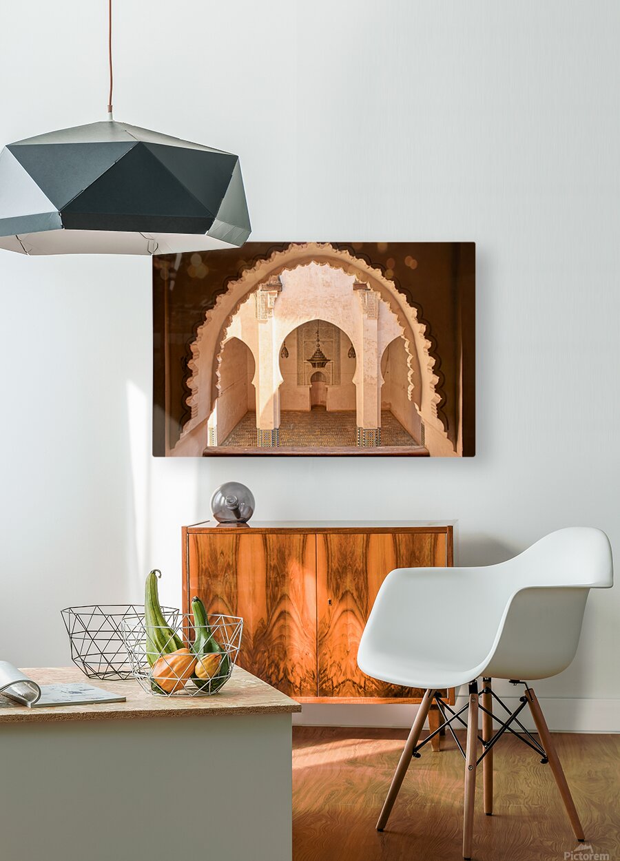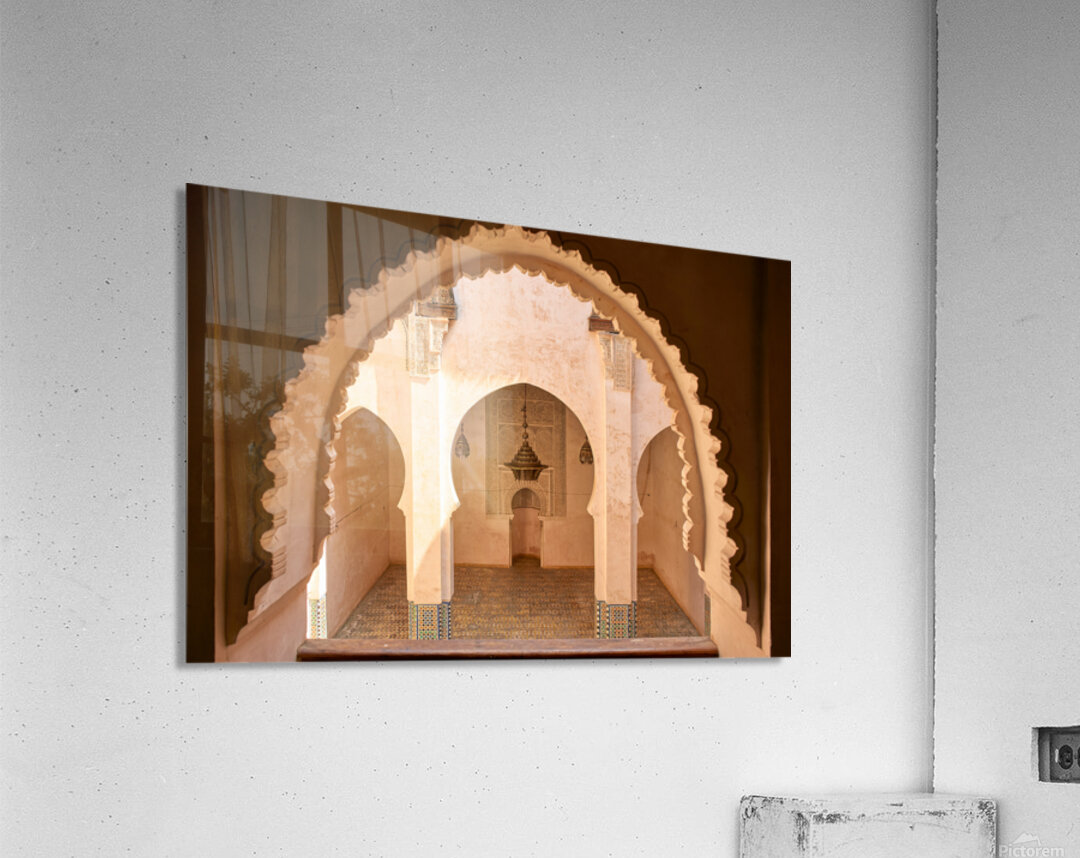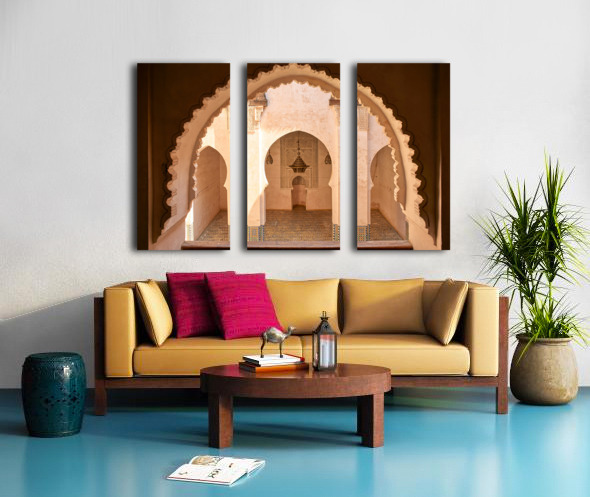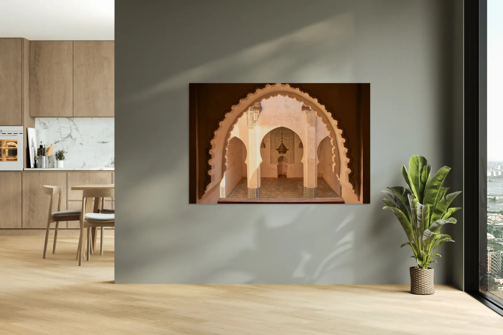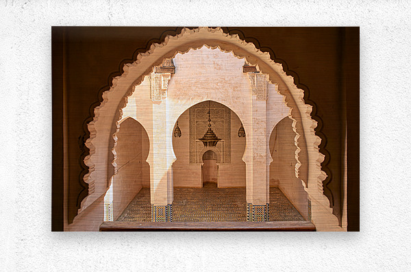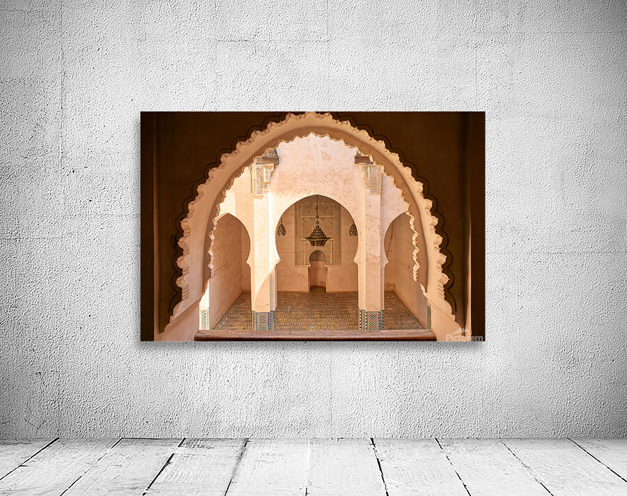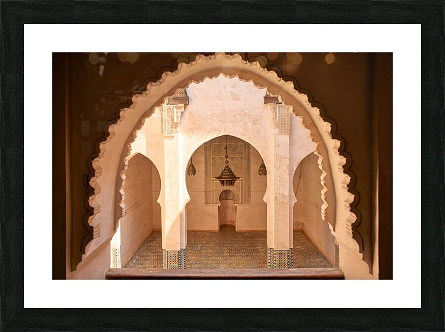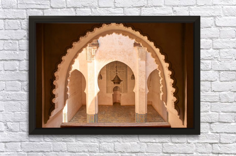 "View of arches in Al Attarine Madrasa in Fez Morocco" in a framed print.