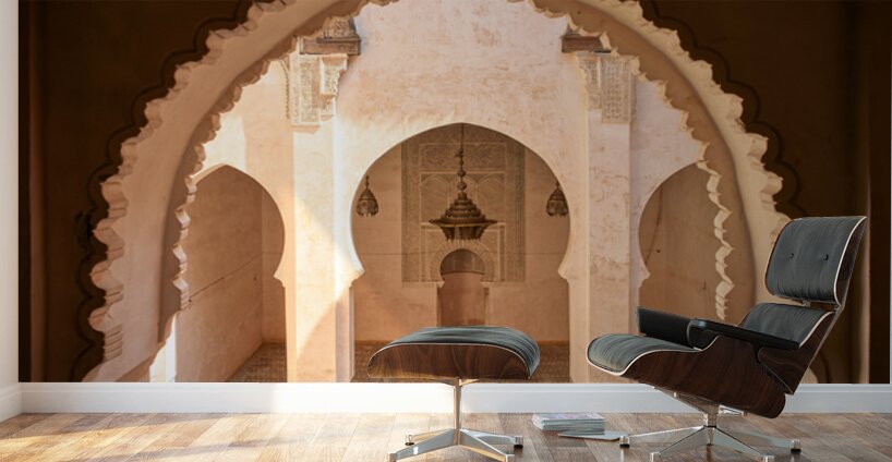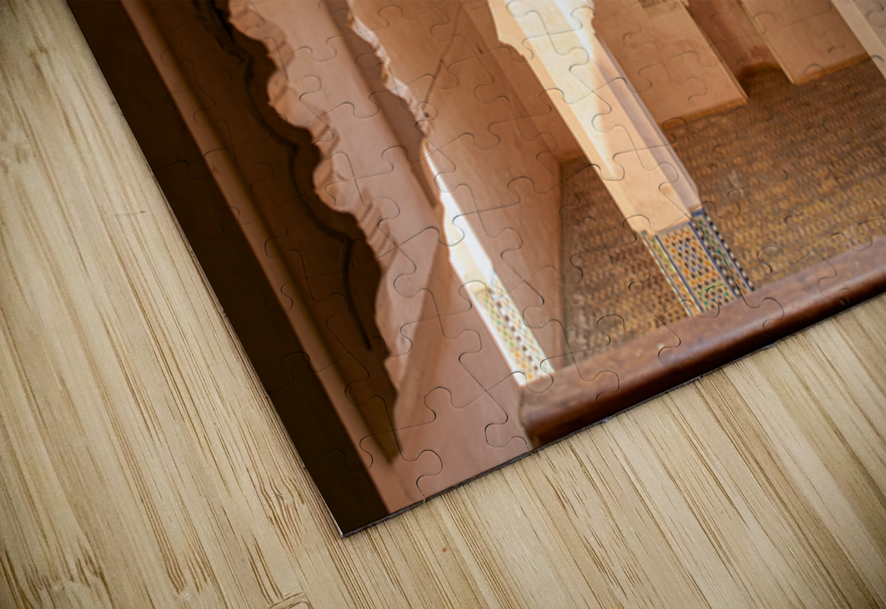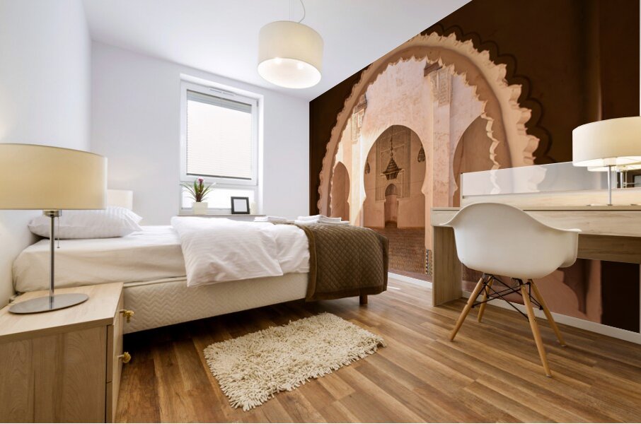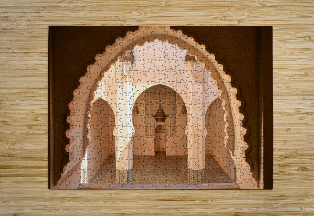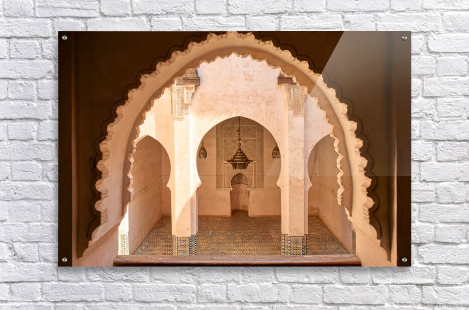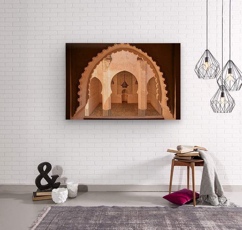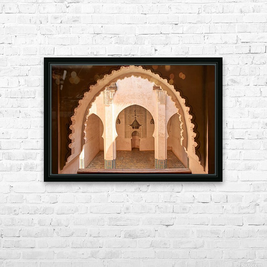 "View of arches in Al Attarine Madrasa in Fez Morocco" in a framed print.