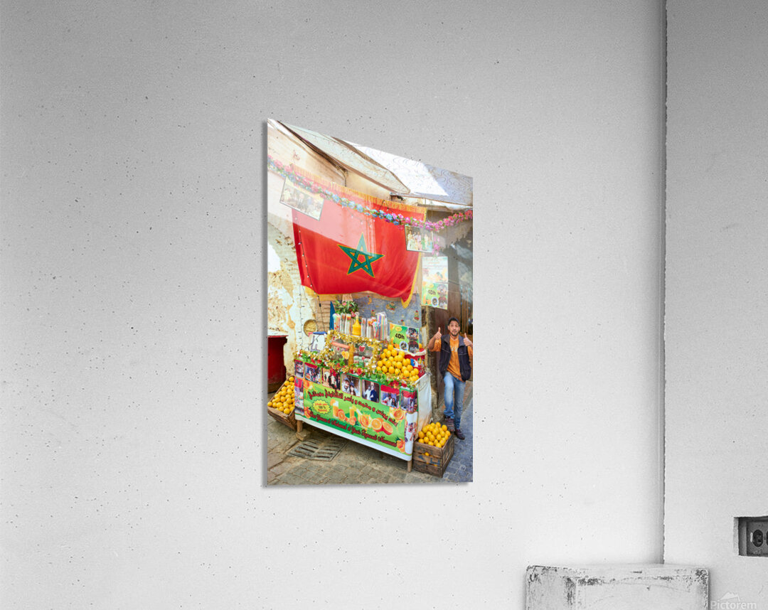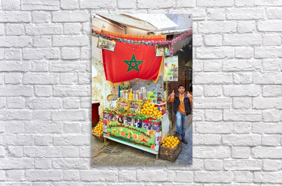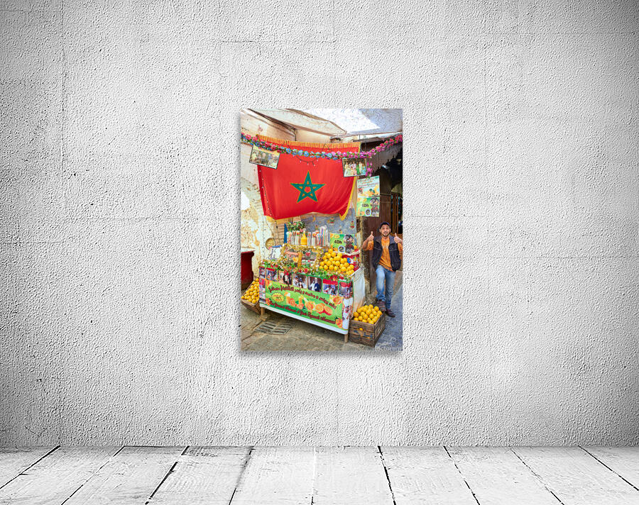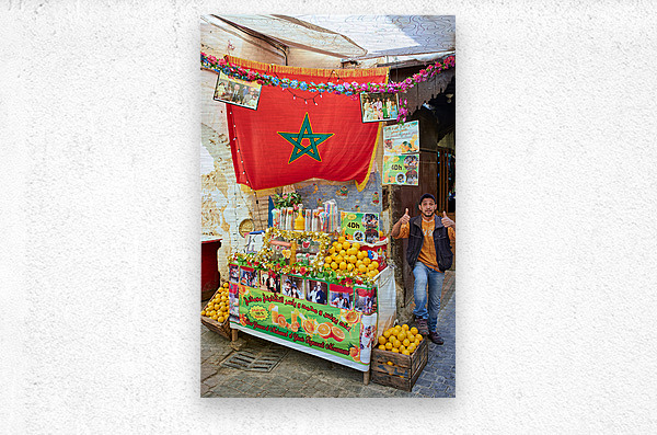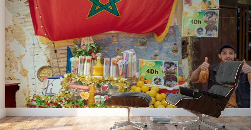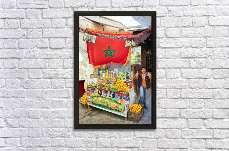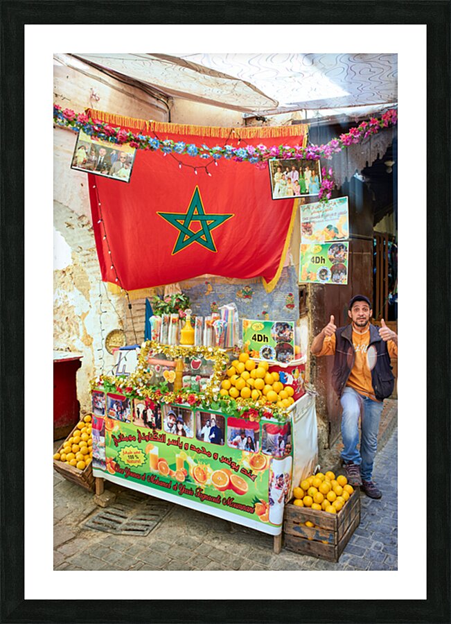 An orange juice stall in the Medina of Fez serves fresh drinks to visitors. A vendor stands by the colorful display welcoming customers.