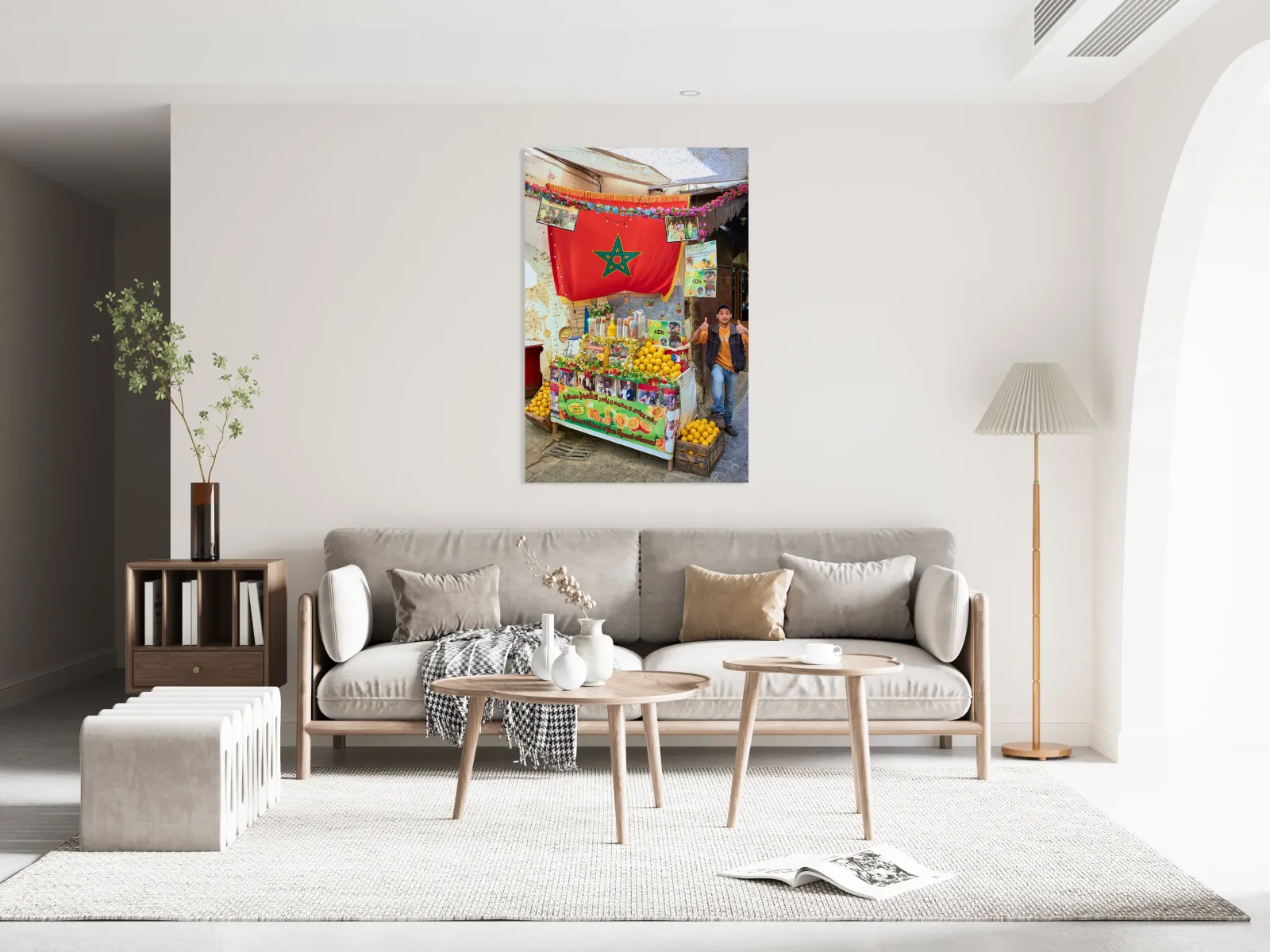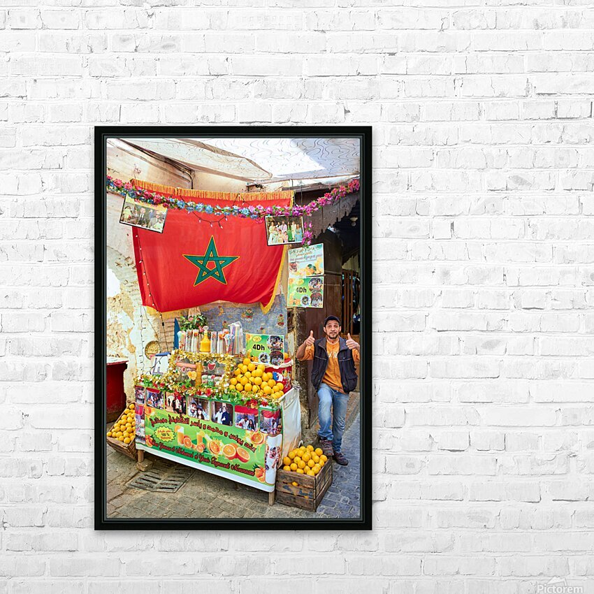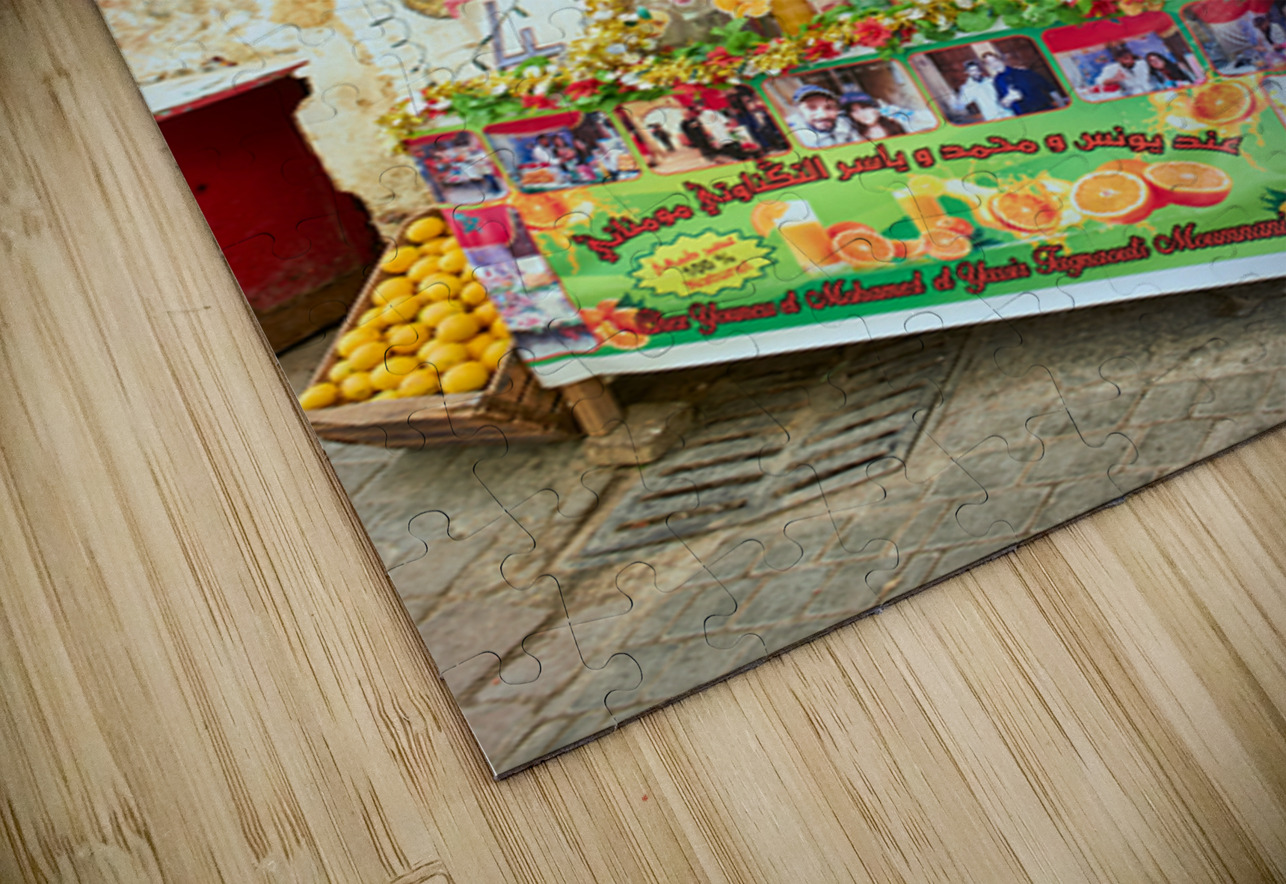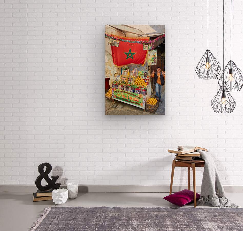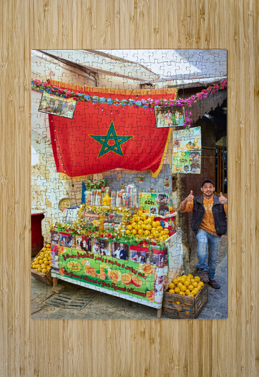 An orange juice stall in the Medina of Fez serves fresh drinks to visitors. A vendor stands by the colorful display welcoming customers.